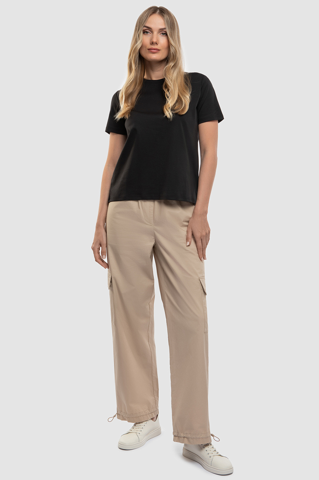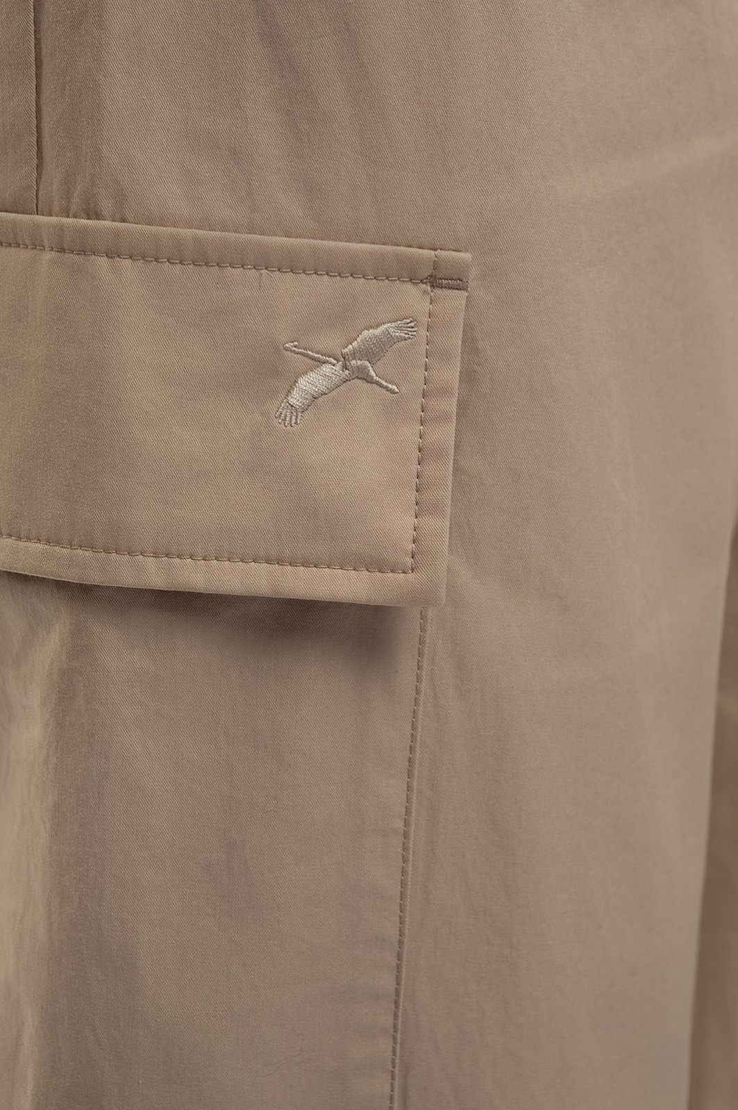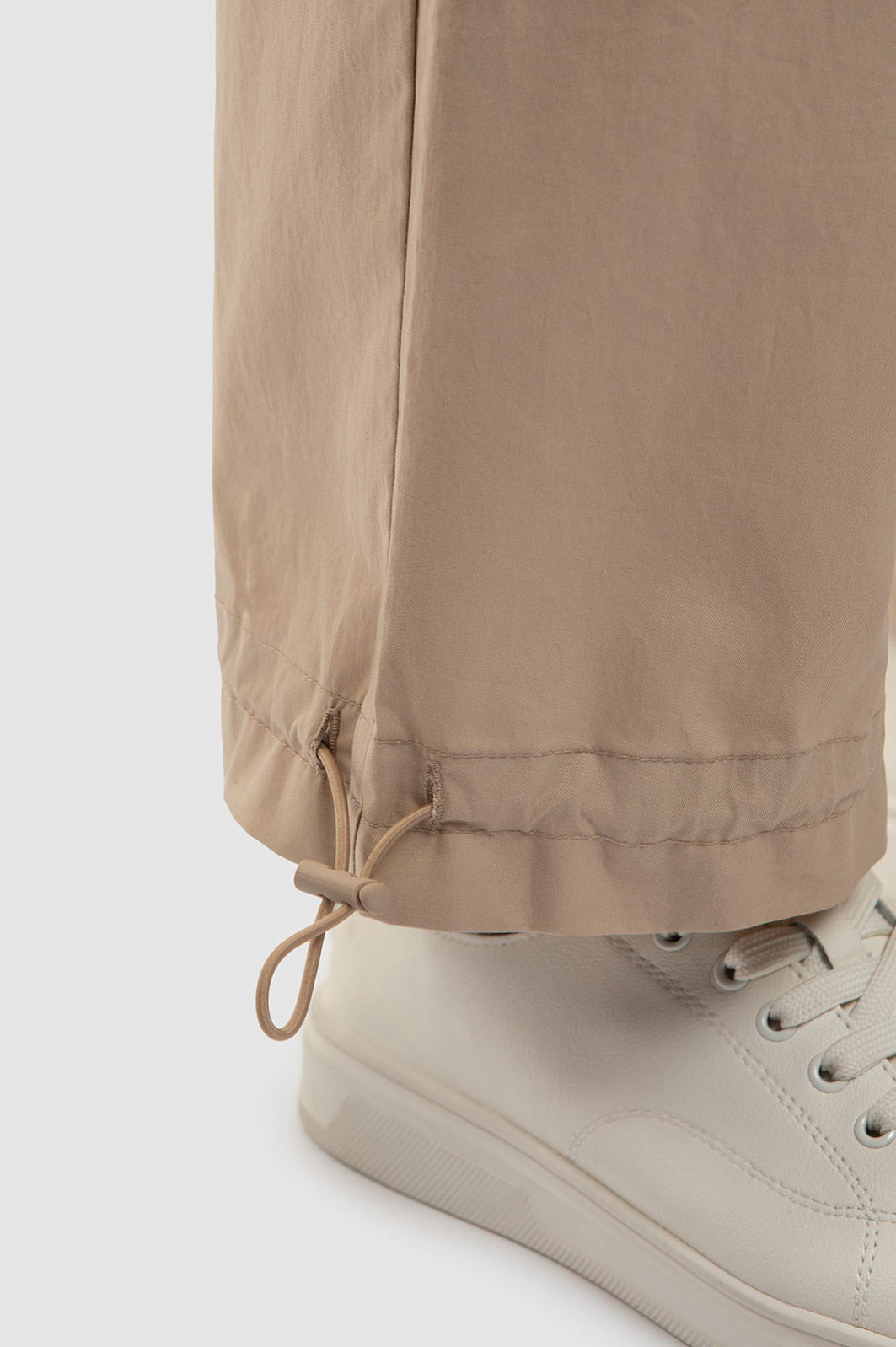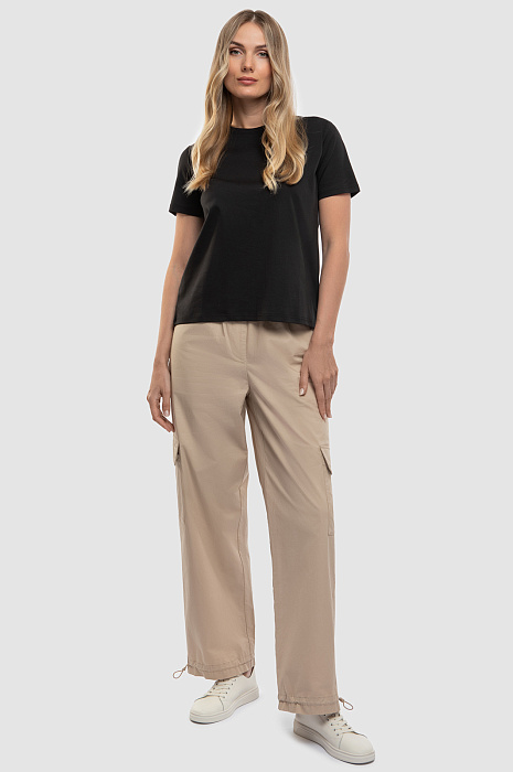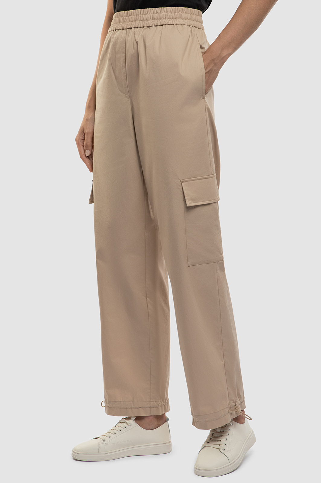 Брюки-карго – безусловный тренд сезона и идеальный вариант для создания комфортного непринужденного образа. Модель прямого кроя с широким эластичным поясом выполнили из 100% гипоаллергенного хлопка. Мягкий и дышащий материал обеспечивает терморегуляцию и дарит телу комфорт во время любых активностей. Базовый бежевый цвет позволяет легко встроить брюки в гардероб, создавая множество сочетаний. Модель дополнили пятью карманами и регулируемыми манжетами, а один из накладных карманов украсили небольшим символом бренда – летящим журавлем. Параметры модели: рост 180, 87-61-91 Размер на модели: S