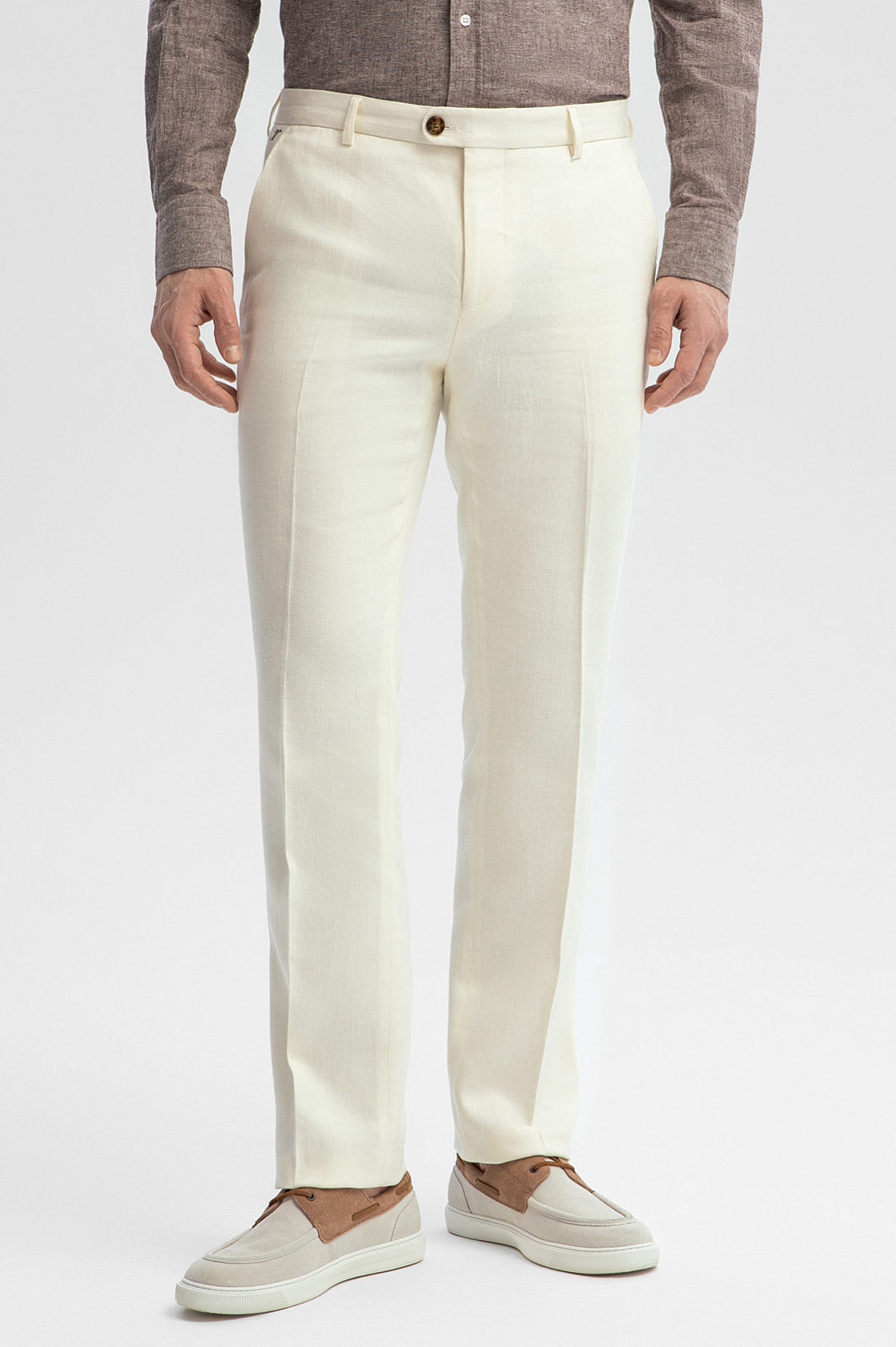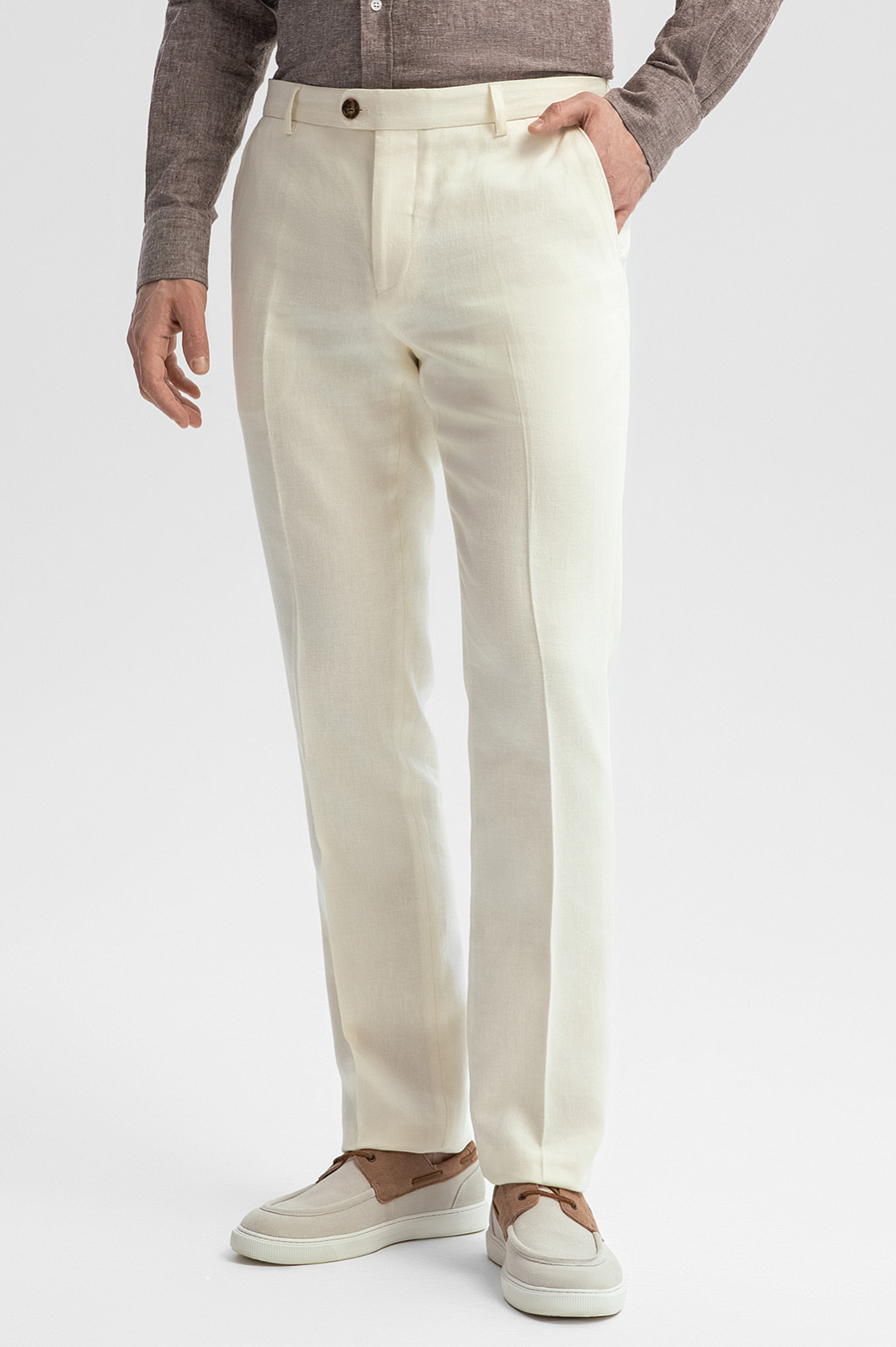 Роскошные белые брюки KANZLER со стрелками изо льна и тенсела созданы для гедонистов, которые умеют наслаждаться жизнью и производить впечатление на окружающих. Изысканный пошив, слегка зауженный изящный силуэт, классический крой и дорогая натуральная ткань создают идеальный баланс между шиком и комфортом. Легкие стрелки создают вертикальные линии, визуально удлиняющие ноги. Натуральная дышащая гипоаллергенная ткань сочетает достоинства льна и тенсела. Гладкие воздухопроницаемые волокна льна обладают способностью охлаждать тело. Нити тенсела, созданные из природного материала (целлюлозы), отлично отводят влагу, сохраняя ощущение свежести. Параметры модели: рост 189, 102-80-99 Размер на модели: 50