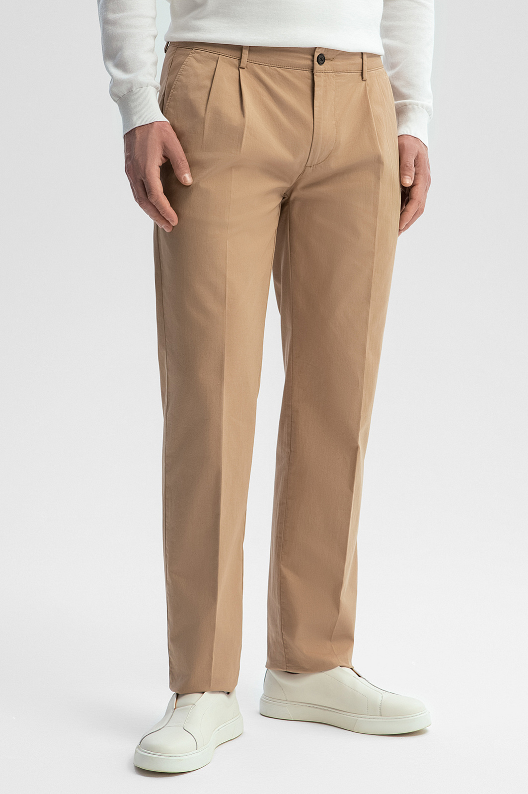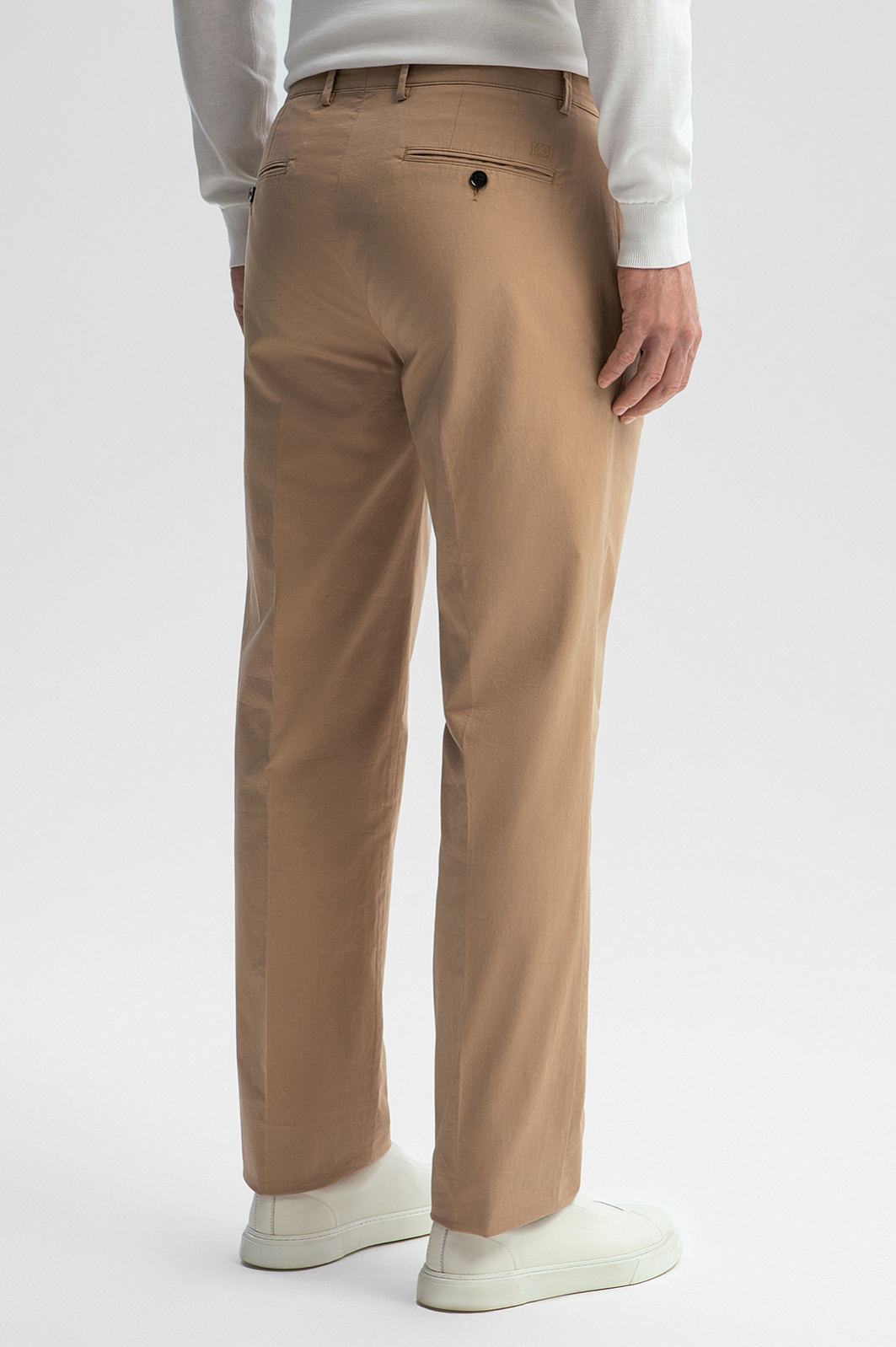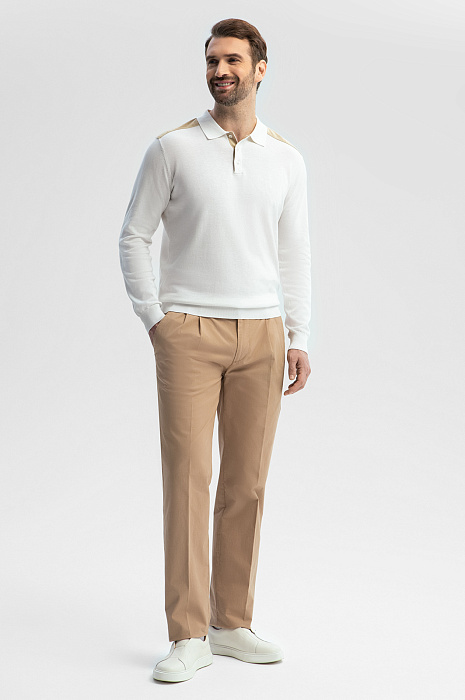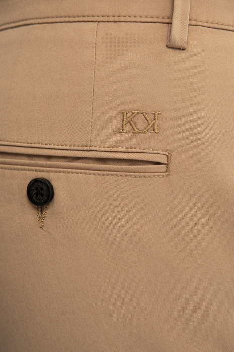 Брюки из хлопка KANZLER теплого песочного оттенка — элегантная модель для выходов в свободное время. Сзади брюки украшены вышитым фирменным инициалом. Умеренно свободный Свободный крой с защипами обеспечивает хорошую посадку на фигуре любого типа. В самые знойные летние дни в таких брюках не жарко. Прочная матовая гладкая ткань из гипоаллергенного хлопка (98%) обладает суперспособностями — поддерживает циркуляцию воздуха, впитывает влагу и быстро сохнет. Небольшая добавка эластана (2%) сохраняет аккуратный вид и защищает материал от растягивания. Параметры модели: рост 189, 102-80-99 Размер на модели: 50