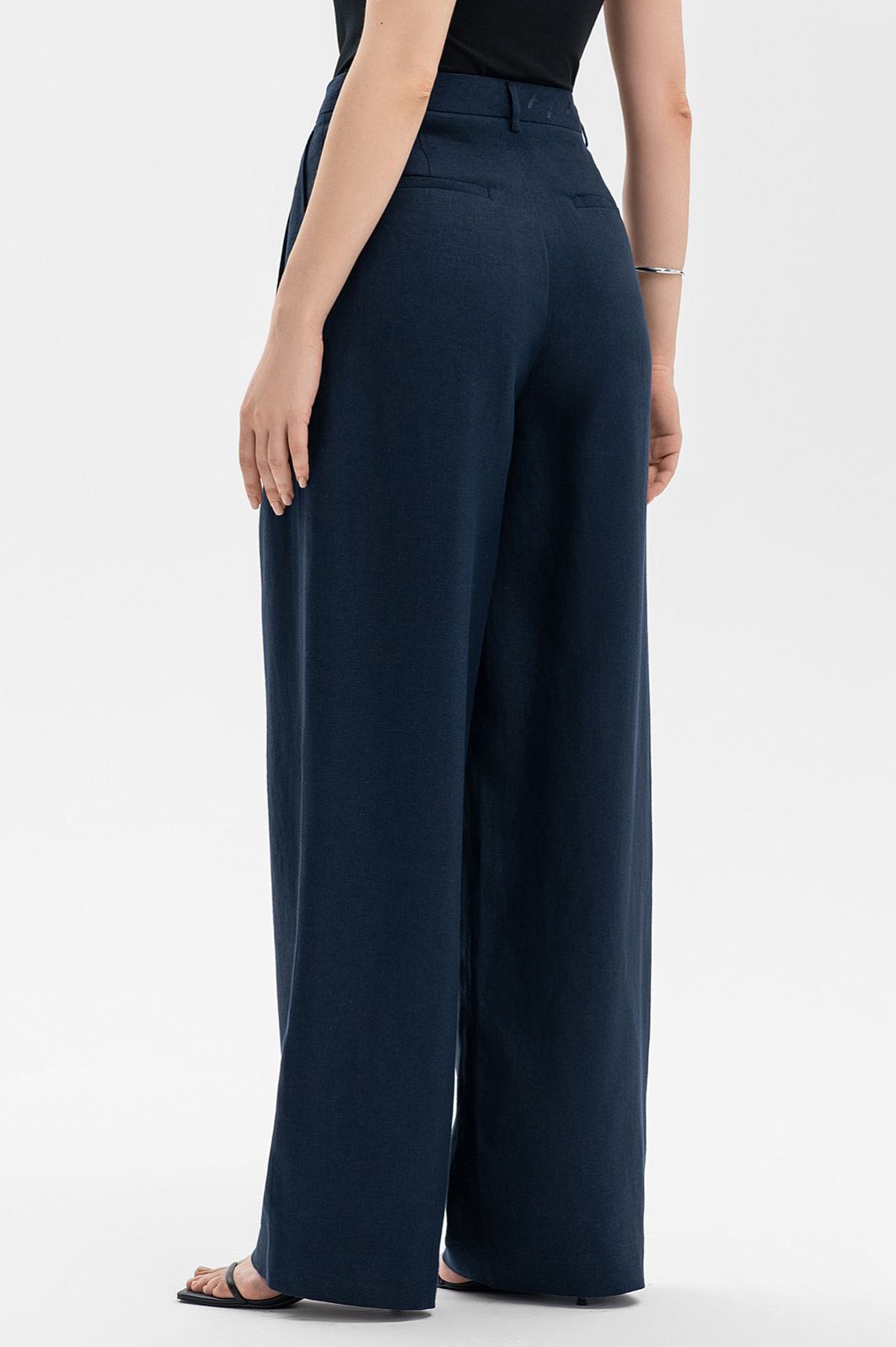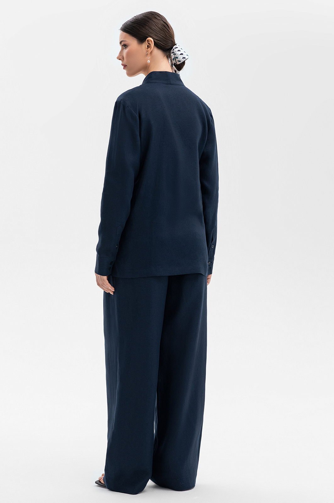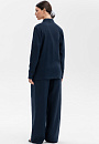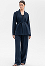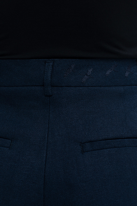 Темно-синие широкие брюки KANZLER, выполненные изо льна, делают ноги визуально длиннее и добавляют облику женственности и шарма. Модель отличают чистые линии, умеренно широкий крой, универсальная средняя посадка, подчеркнутая линия талии и мягкие защипы спереди. Сзади, на поясе, брюки украшены фирменной вышивкой в тон — летящими журавлями. Для создания костюма их можно дополнить свободным льняным темно-синим жакетом KANZLER. Роскошная натуральная ткань из 100-процентного льна практически не нагревается в жаркие дни — гипоаллергенные волокна создают ощущение прохлады и отводят влагу, поддерживая свежесть тела.