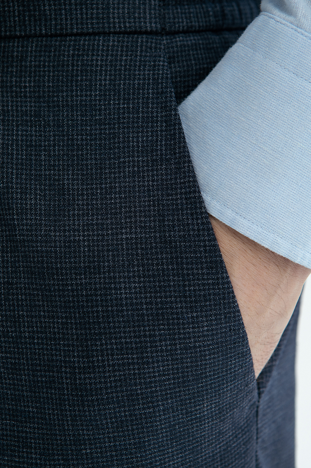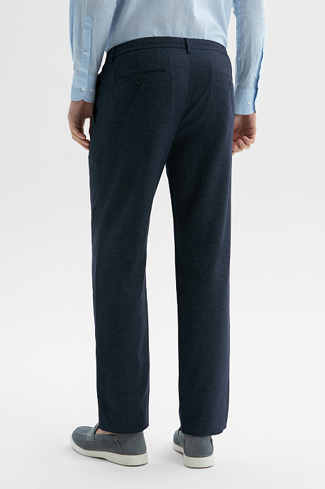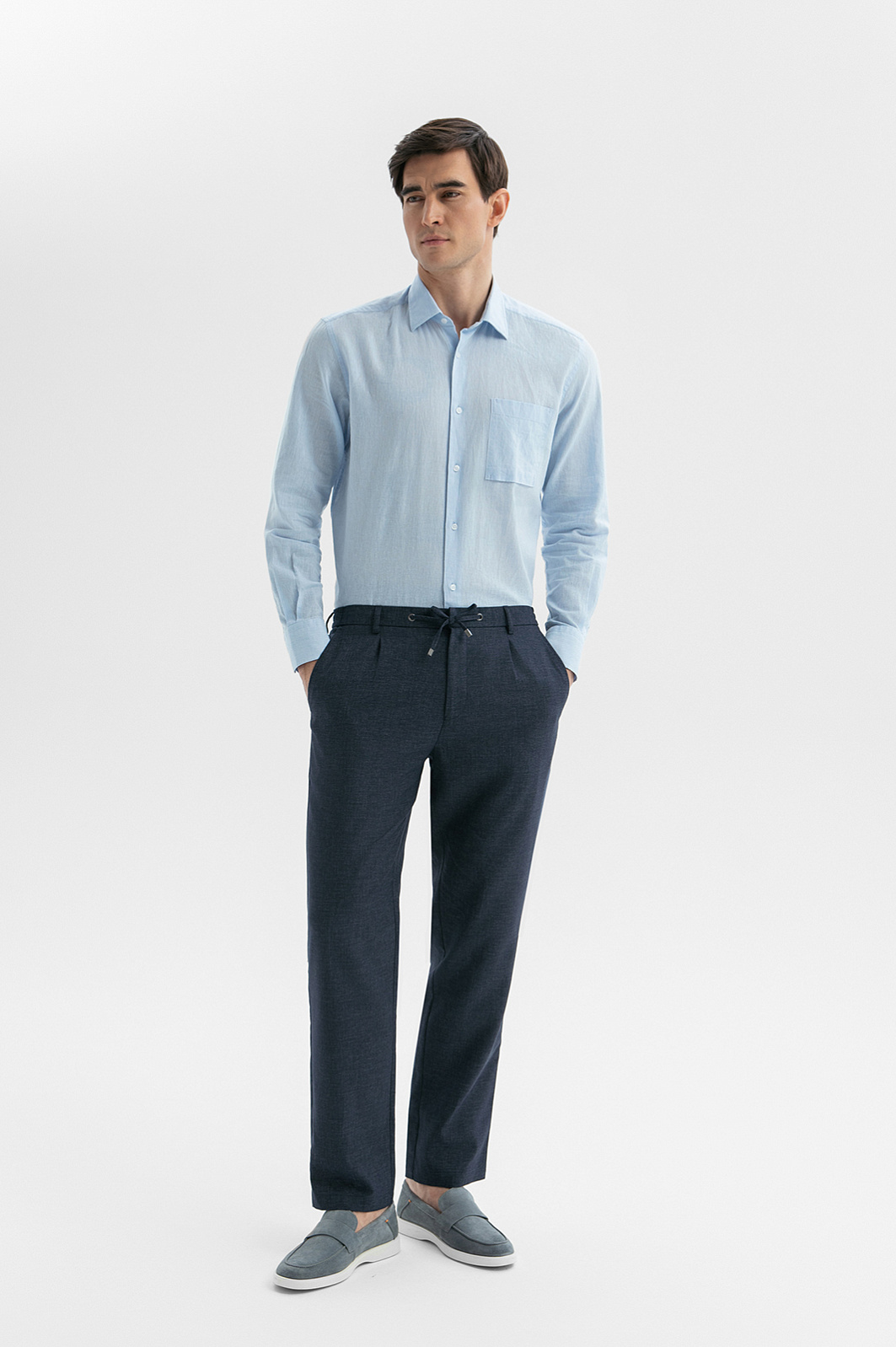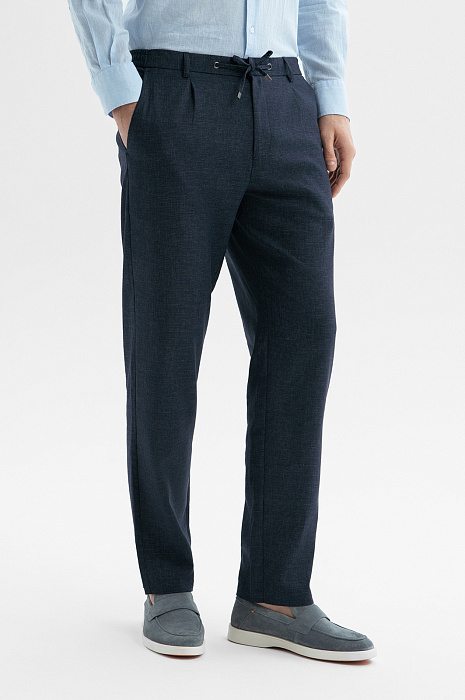 Синие льняные брюки KANZLER на кулиске — удобная модель для города, дизайн которой вдохновлён спортивным стилем. Едва заметная микроклетка придаёт модели неформальный вид. Лаконичный силуэт сформирован зауженным кроем. Кулиска и небольшие защипы у пояса служат удобной посадке. Основной компонент материала — лён, обеспечивающий шероховатую фактуру ткани. Его натуральные гипоаллергенные волокна поддерживают циркуляцию воздуха и сохраняют ощущение прохлады. Также в составе имеется полиэстер, который делает материал более прочным и устойчивым к сминанию, и эластан, придающий ткани пластичность.