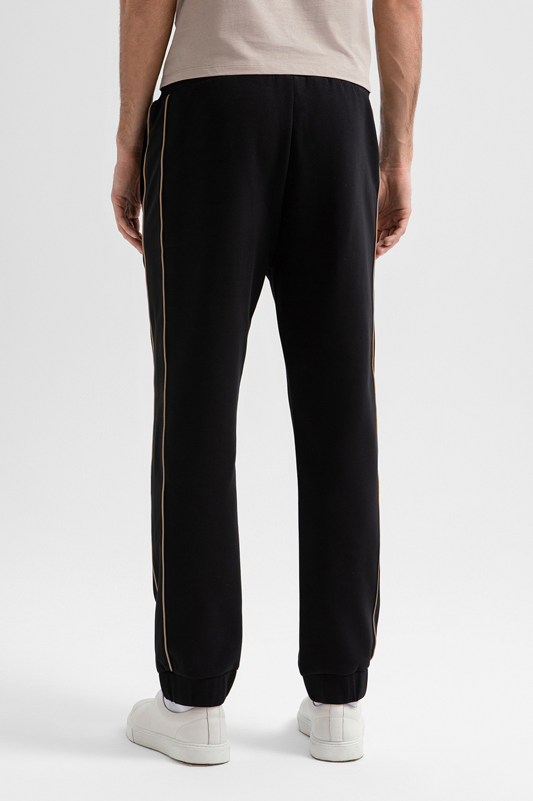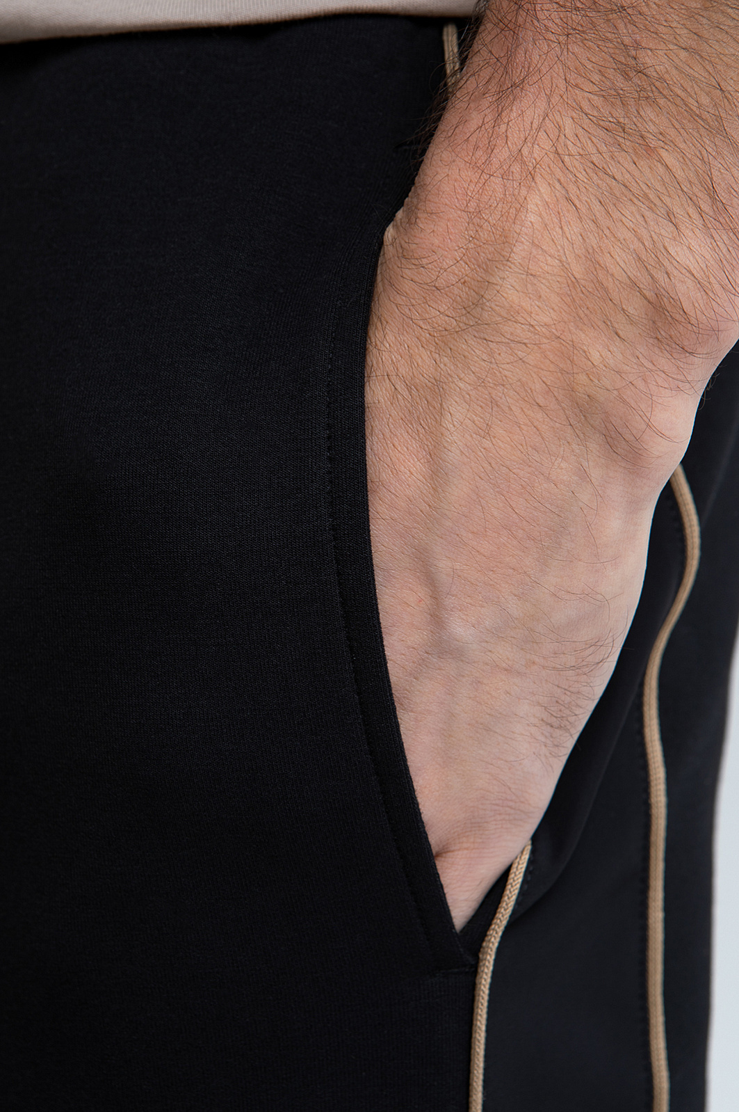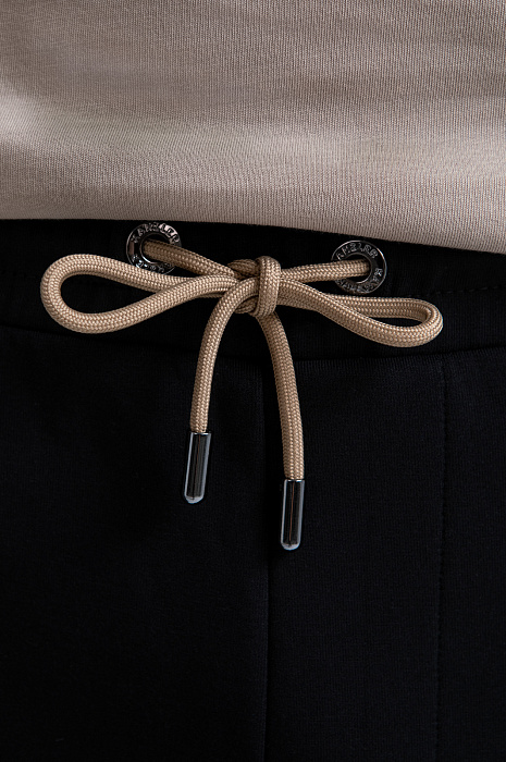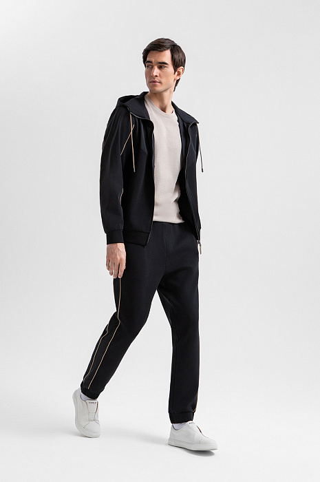 Чёрные брюки KANZLER на кулиске обеспечивают комфорт на отдыхе, будь то спортивные занятия или уютный вечер дома. Для создания костюма их можно дополнить толстовкой KANZLER на молнии из такой же ткани. Шнурок на поясе позволяет легко подстроить посадку под себя. Основная часть из трикотажа сочетается с широкими лампасами из полиэстера со спандексом, которые придают образу динамику и современный спортивный характер. Контрастные бежевые элементы служат деликатными акцентами. Трикотаж сделан из гипоаллергенного хлопка, который поддерживает ощущение свежести и сохраняет естественное тепло тела. Добавление полиэстера и эластана придаёт ткани прочность и пластичность.