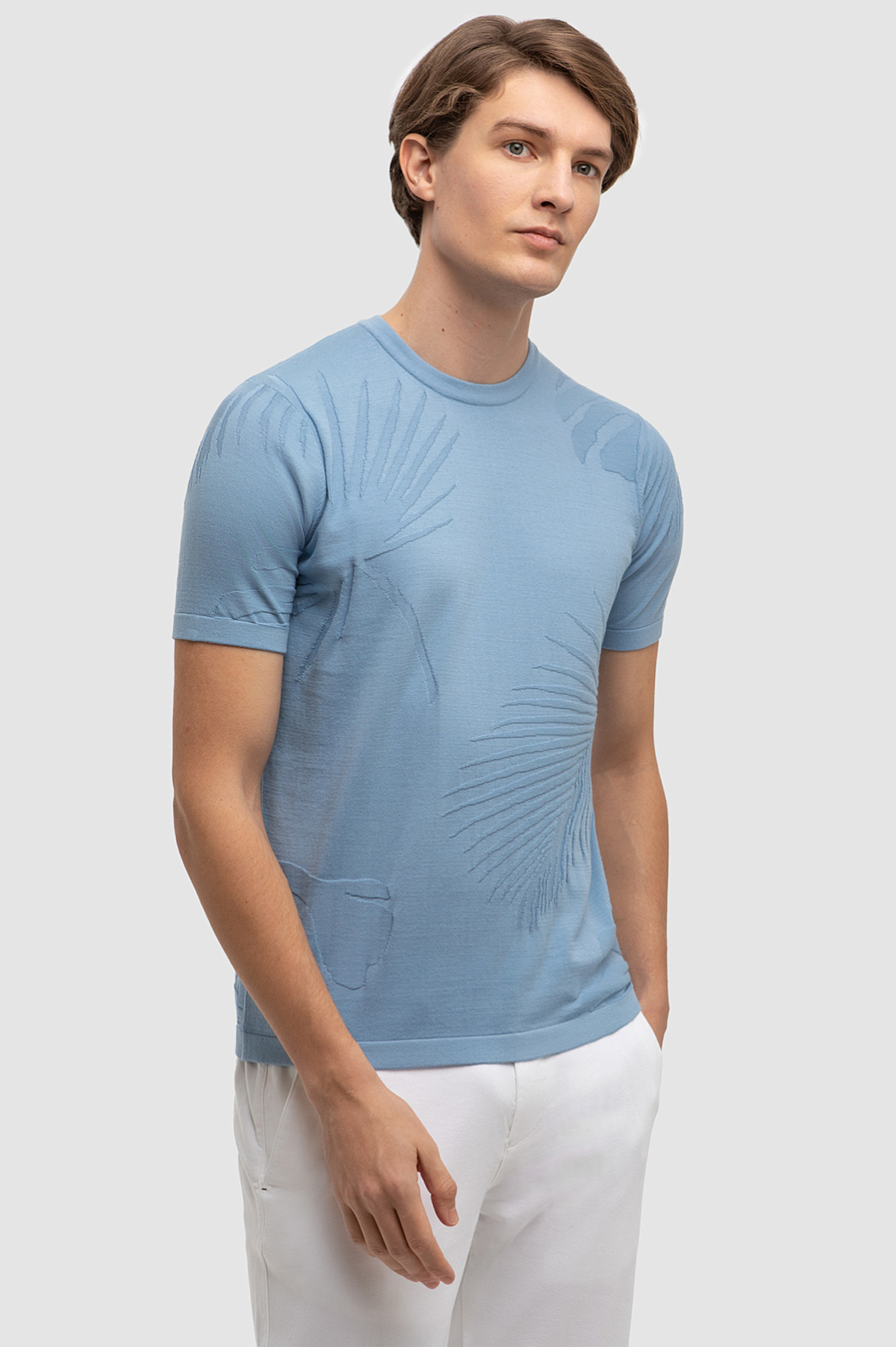 Роскошный голубой матовый оттенок джемпера KANZLER и фактурный ботанический узор из пальмовых листьев навевают мысли о безмятежном отдыхе, создавая расслабленное настроение. 100% премиальный хлопок Пима мягко облегает тело, даря комфорт и ощущение свежести на весь день. Натуральный материал высочайшего качества сохраняет первоначальную форму и цвет даже спустя долгие месяцы - прекрасный выбор для тех, кто ценит в одежде не только стиль, но и функциональность. Модель подойдет как для активных выходных, так и для спокойных дней в офисе с нестрогим дресс-кодом. Наши стилисты предлагают дополнить джемпер светлыми брюками и кожаными лоферами или топсайдерами. Параметры модели: рост 191, 97-77-99 Размер на модели: M