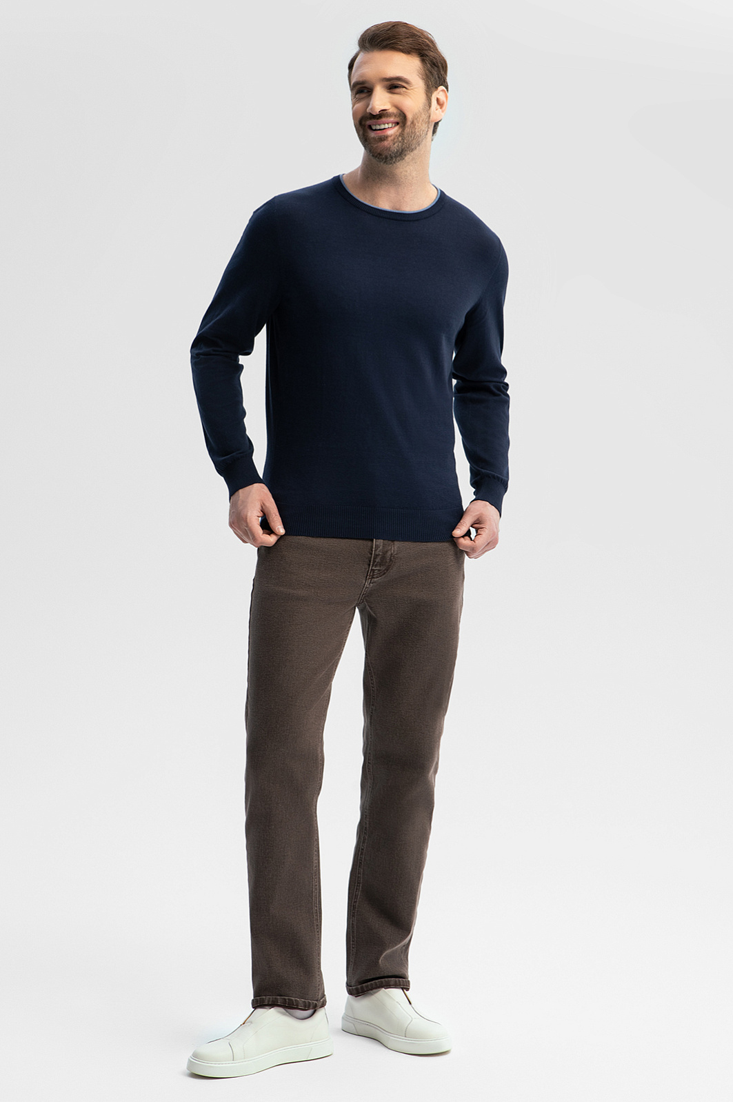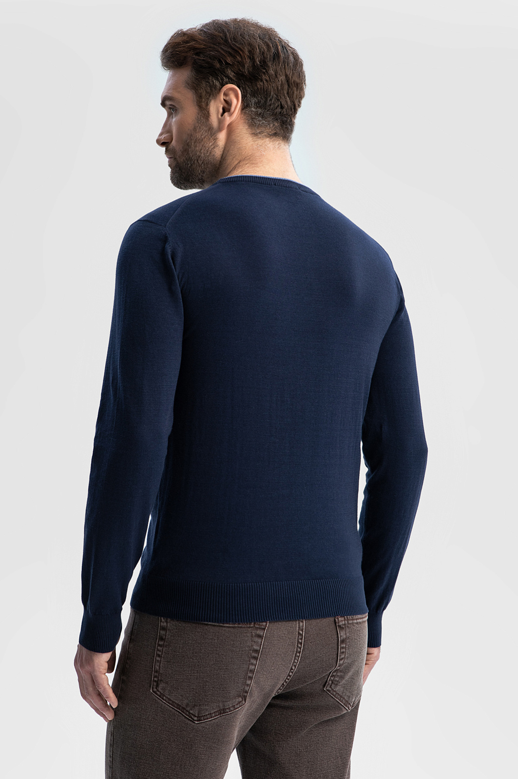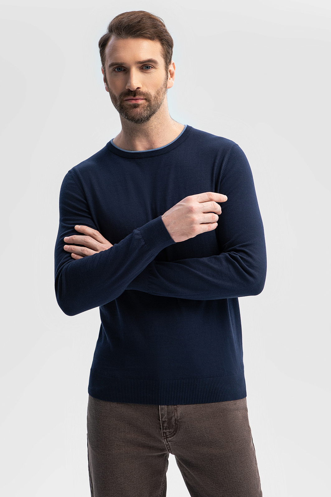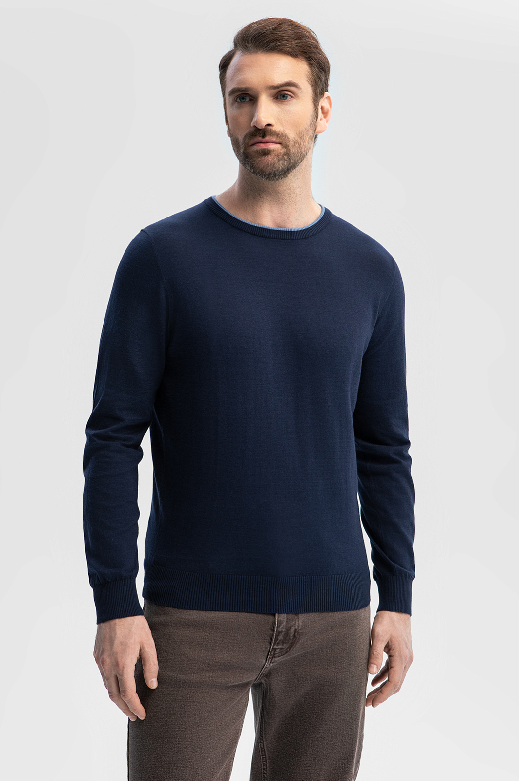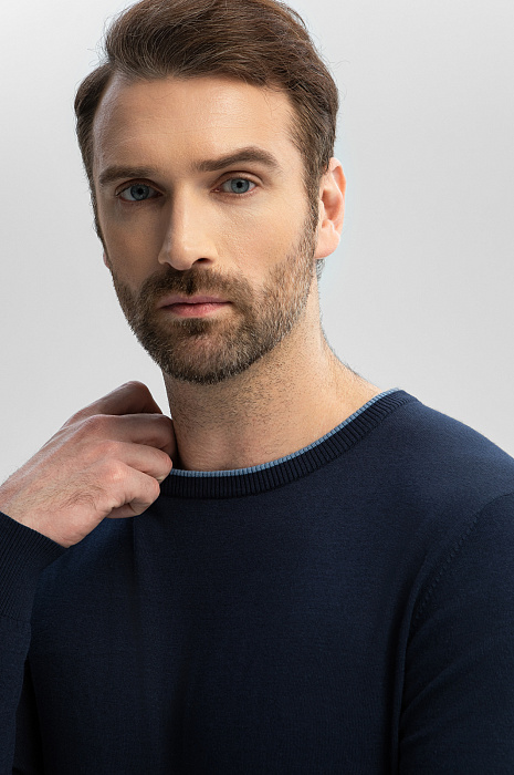 Темно-синий джемпер KANZLER — ваш ключ к элегантности и комфорту. Натуральный состав (80% хлопок и 20% лен) делает модель легкой, дышащей и долговечной. Тонкая вязка подчеркивает утонченность изделия, а лаконичный силуэт деликатно акцентирует достоинства фигуры. Джемпер гармонично сочетается как с классическими брюками, так и с джинсами, создавая универсальный образ для офиса, прогулок или неформальных встреч. Темно-синий оттенок, всегда актуальный в мужском гардеробе, дополнен голубой отделкой на вороте. Параметры модели: рост 189, 102-80-99 Размер на модели: M