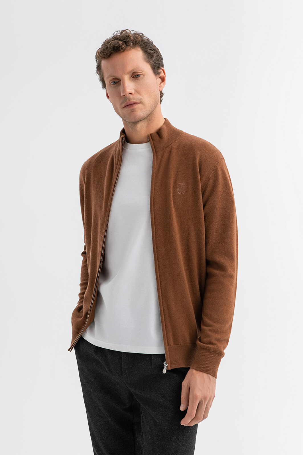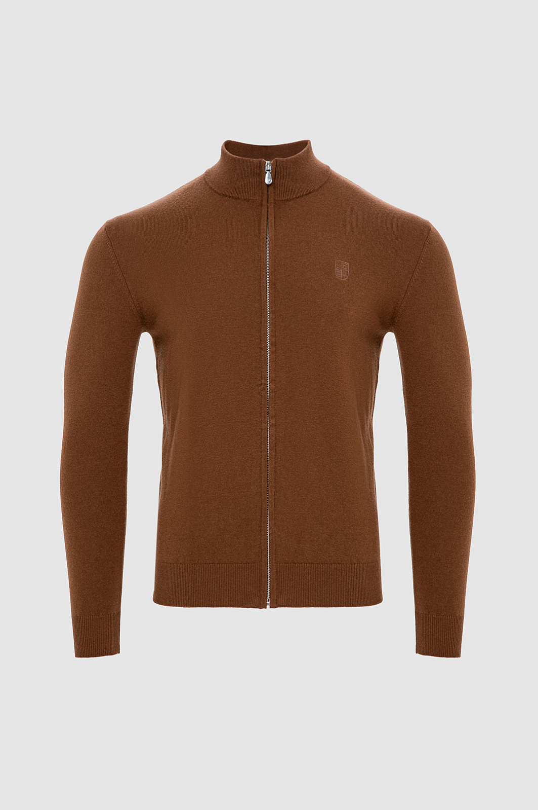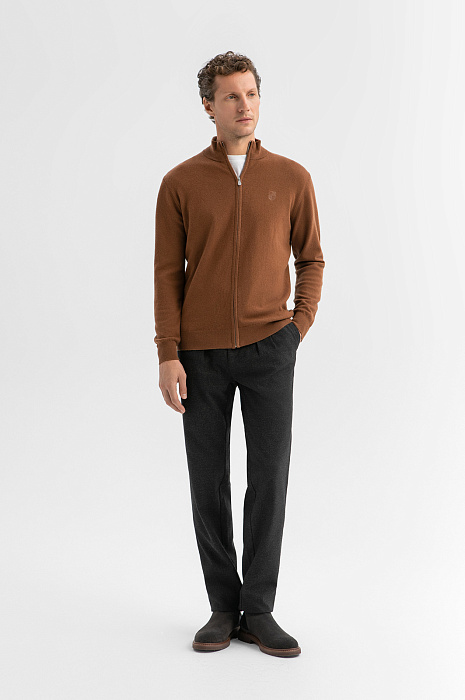 Кардиган KANZLER на молнии из 100% шерсти в оттенке молочного шоколада — тёплый, лаконичный и стильный вариант для холодного сезона. Модель идеально сочетается с неформальными брюками и будет уместно смотреться как в рабочем пространстве, так и на отдыхе. Гладкая вязка подчёркивает чистоту линий и делает модель универсальной. Аккуратная вышитая эмблема на груди служит ненавязчивым, но узнаваемым акцентом. Высокий ворот с молнией позволяет носить джемпер как с отложенным воротником, так и в застёгнутом виде. Манжеты, воротник и низ оформлены трикотажными резинками, которые сохраняют форму и обеспечивают комфортную посадку. Материал сделан из мягкой пряжи (чистая шерсть), которая удерживает воздух между волокнами, создавая естественный терморегуляционный слой. Параметры модели: рост 188, 97-82-92 Размер на модели: M