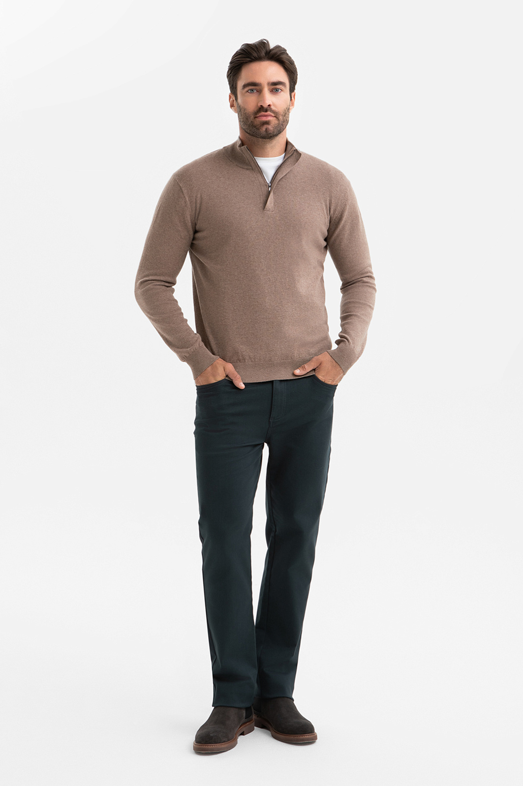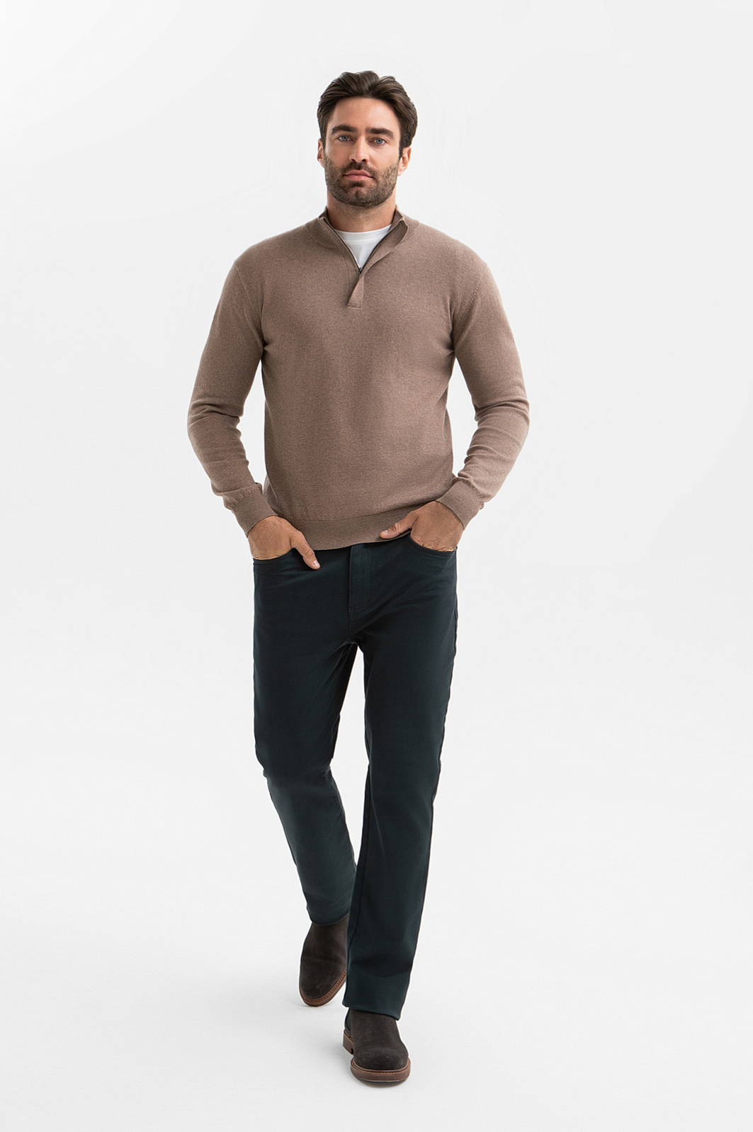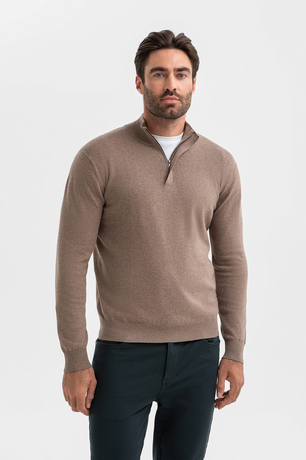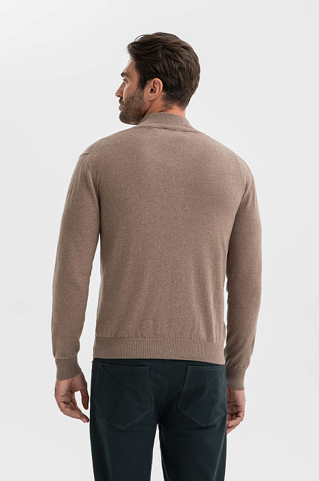 Джемпер KANZLER в глубоком светло-коричневом оттенке с эффектом меланжа – модель вне времени и трендов. Это универсальный выбор для офиса с нестрогим дресс-кодом и кежуал-образов. Сочетание натурального хлопка и кашемира создает легкий, прочный и приятный на ощупь материал. Гипоаллергенный хлопок обеспечивает идеальный воздухообмен, а добавление кашемира дарит ощущение нежности и согревает. Мягкий воротник-стойка на молнии, скрытой планкой, позволяет трансформировать образ и регулировать комфортную температуру. Параметры модели: рост 192, 108-83-102 Размер на модели: M