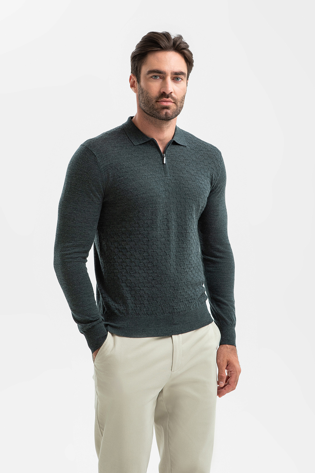 Джемпер поло KANZLER – воплощение мужской элегантности для тех, кто ценит детали. Фактурный узор подчеркивает красоту серо-зеленого оттенка и придает образу глубину. Материал – 100-процентная шерсть, мягкая и невесомая, обеспечивает идеальную терморегуляцию, не перегревая кожу. Эластичные волокна сохраняют форму после многократных стирок, что делает модель инвестицией в гардероб. Это выбор для кежуал-образов и неформального офисного дресс-кода в межсезонье и зимой. Параметры модели: рост 192, 108-83-102 Размер на модели: M
