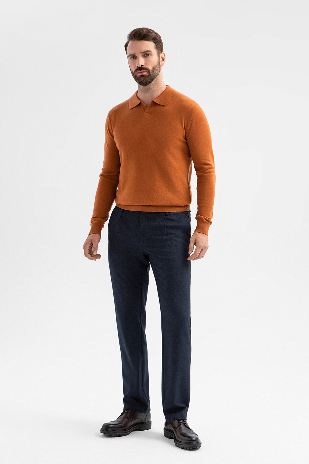 Роскошный джемпер поло KANZLER из шерсти и кашемира согревающего терракотового оттенка — яркая деталь образа, которая легко сочетается базовыми вещами — джинсами и более формальными брюками. Традиционный крой с неглубоким треугольным вырезом и мягким отложным воротником подчёркивает универсальность модели, а мягкие резинки на манжетах и по низу обеспечивают идеальную посадку. Состав трикотажа — дуэт натуральных материалов (90% шерсти и 10% кашемира). Упругие волокна шерсти поддерживают форму и сохраняют тепло, а нежные тонкие ворсинки кашемира добавляют изысканную мягкость. Параметры модели: рост 189, 102-80-99 Размер на модели: M