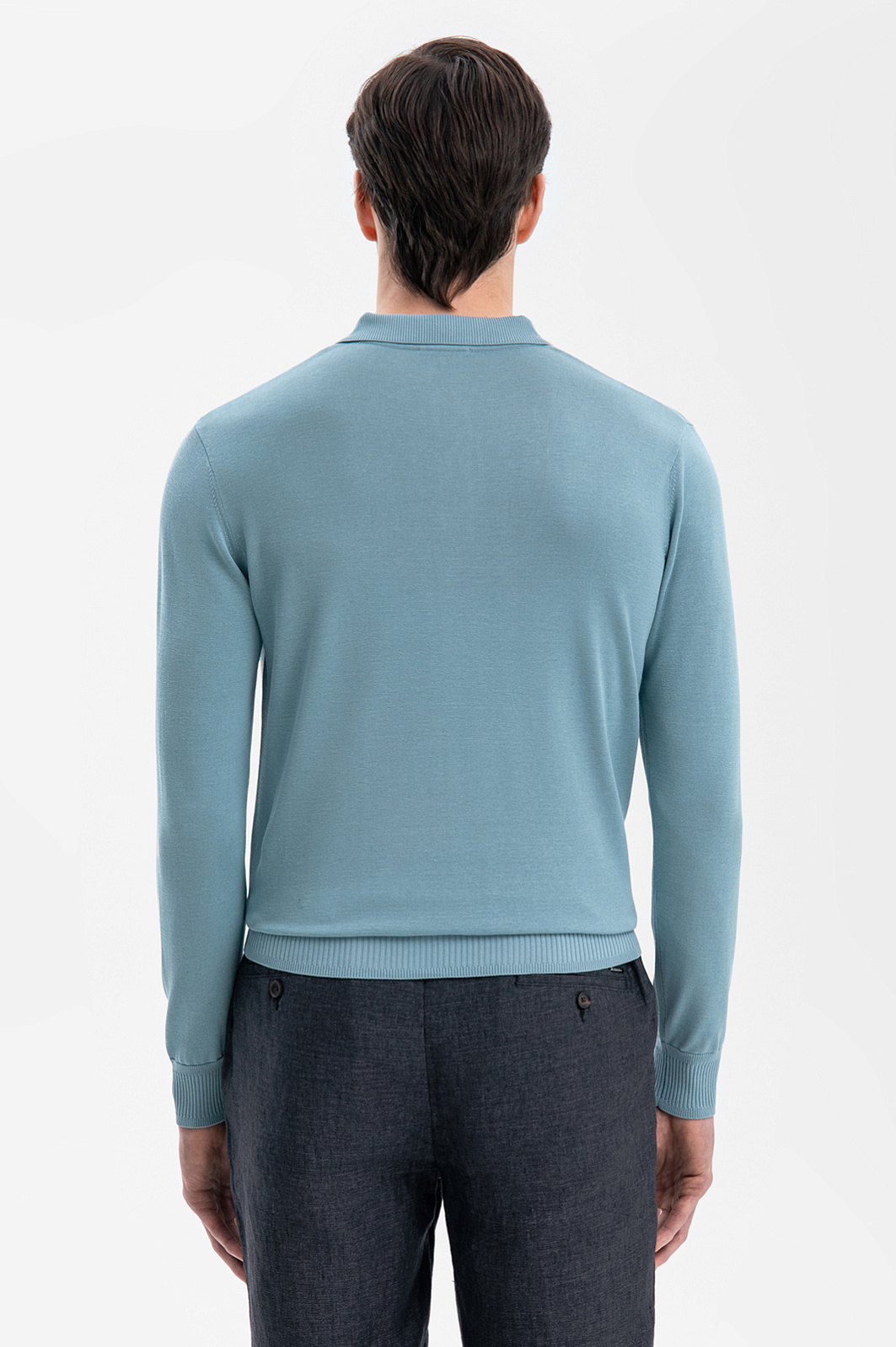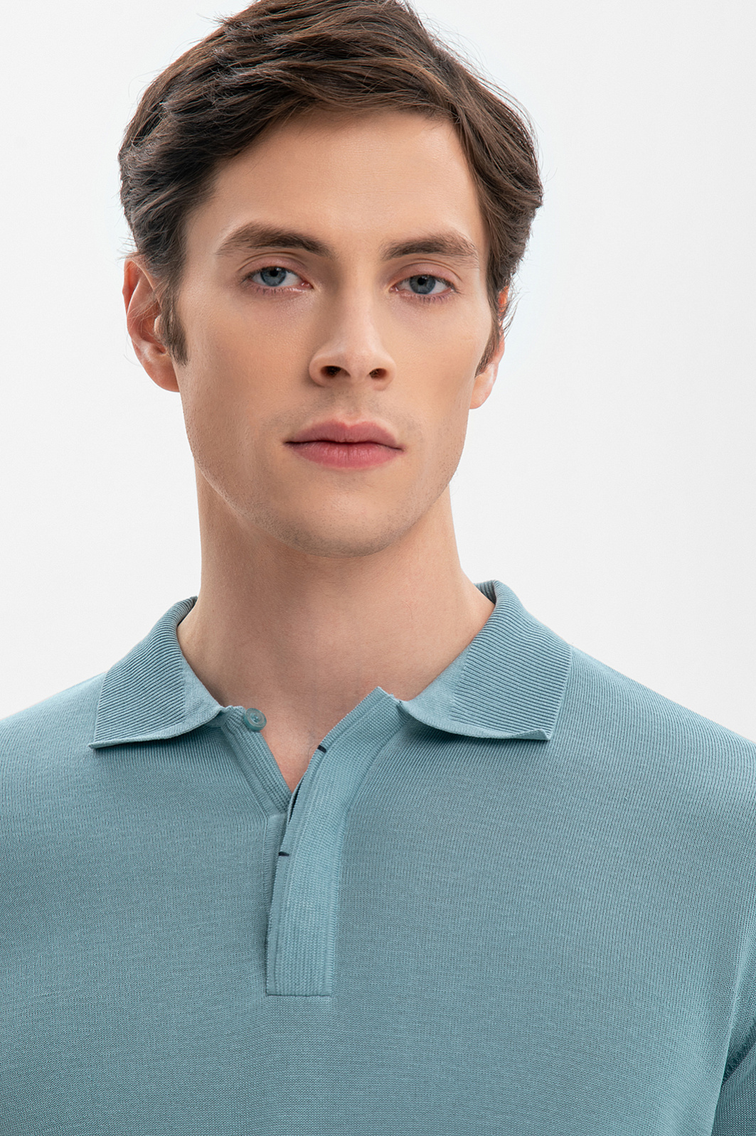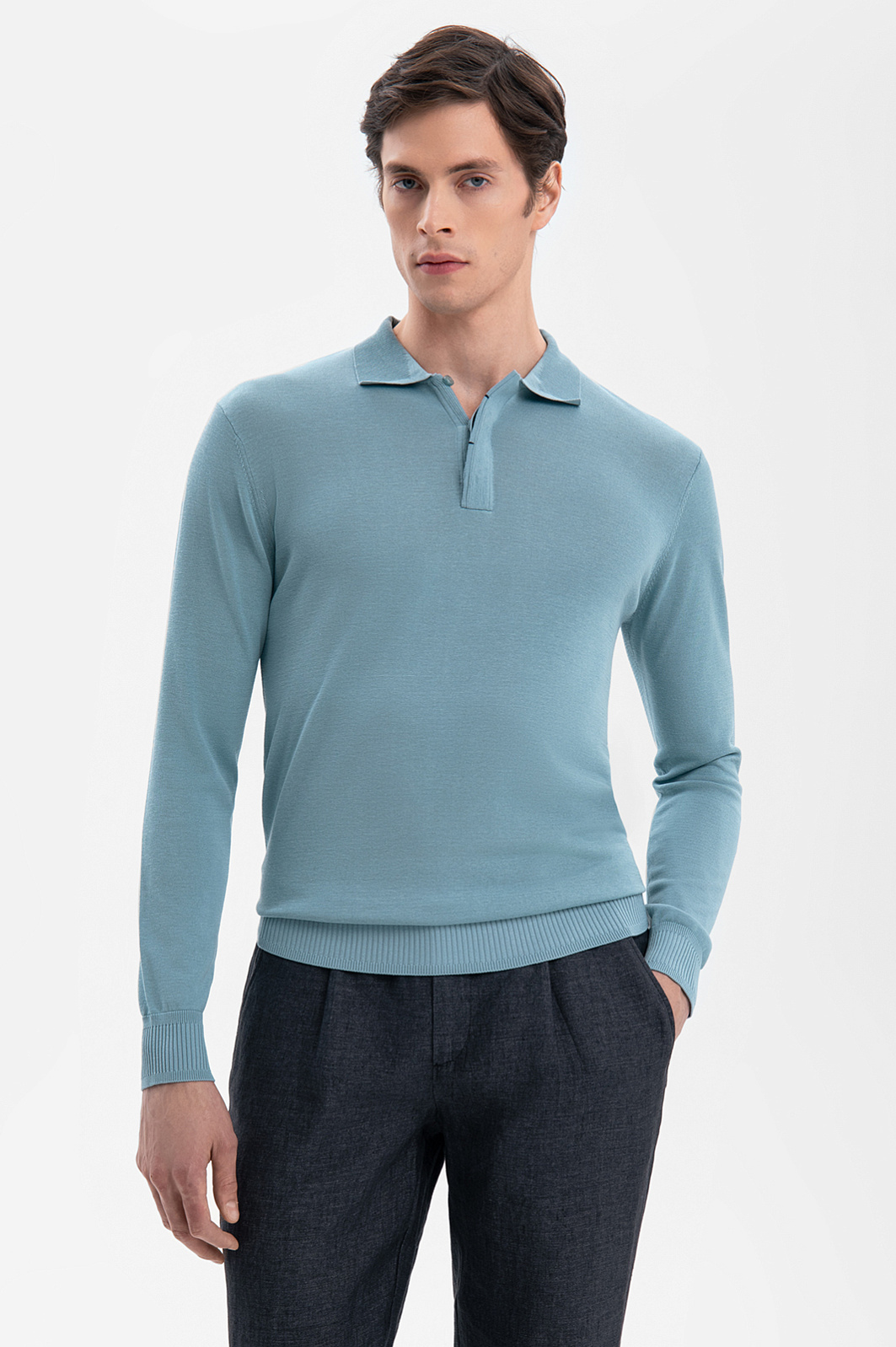 Поло KANZLER в небесно-голубом оттенке из лимитированной коллекции - синоним вневременной роскоши. Премиальный материал из 100% шелка – гипоаллергенный, дышащий, с естественной терморегуляцией – согревает в прохладу и охлаждает в зной. Гладкая фактура материала с благородным сиянием обеспечивает нежное соприкосновение с кожей, не вызывая раздражений. Классический отложной воротник с небольшими пуговицами, скрытыми планкой, и полуприлегающий силуэт создают аккуратную посадку по фигуре. Сочетайте поло с темно-серым льняным костюмом для делового образа или дополните светлыми льняными брюками и лоферами для вечерней прогулки. Параметры модели: рост 189, 91-78-95 Размер на модели: М