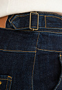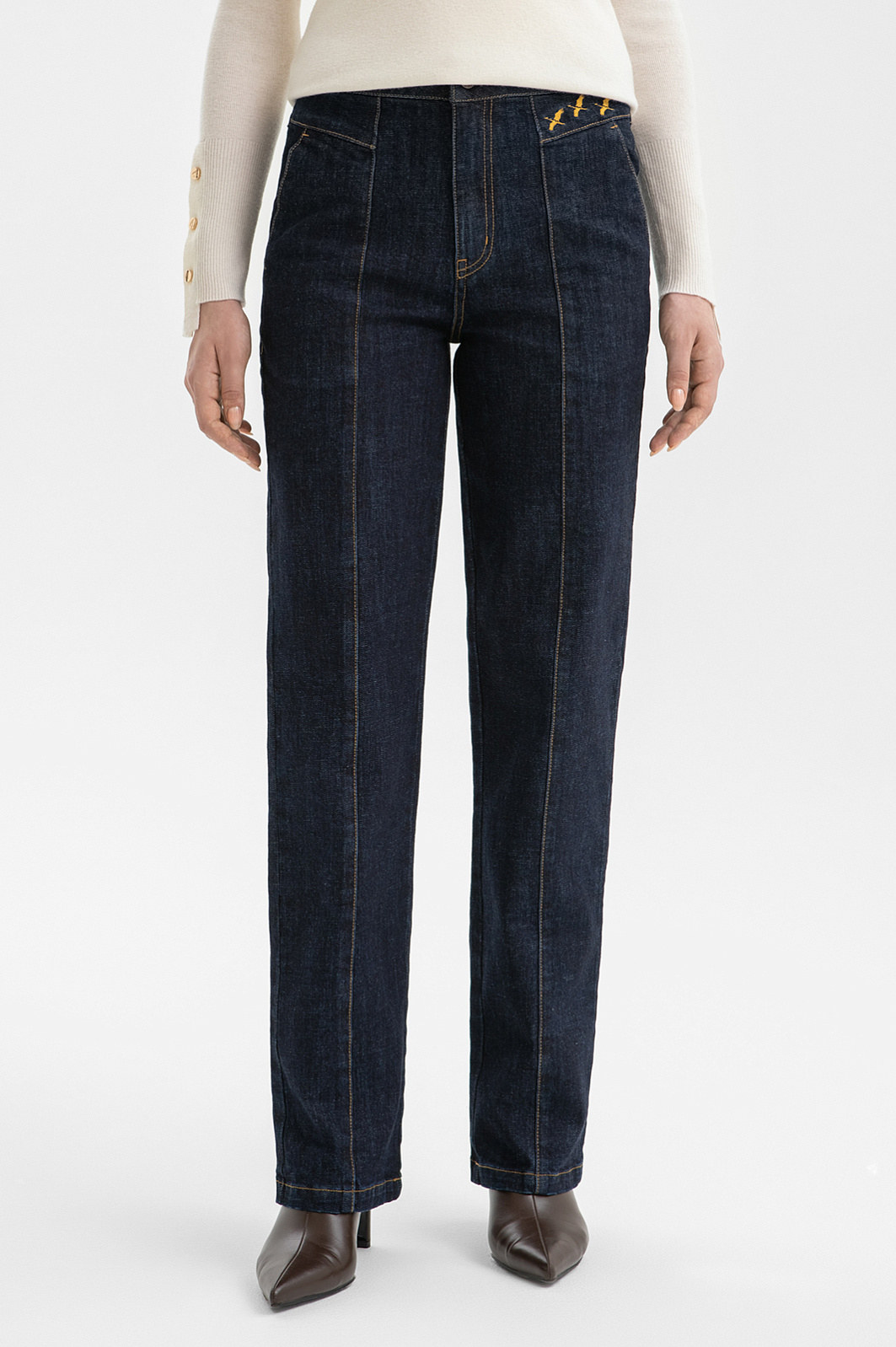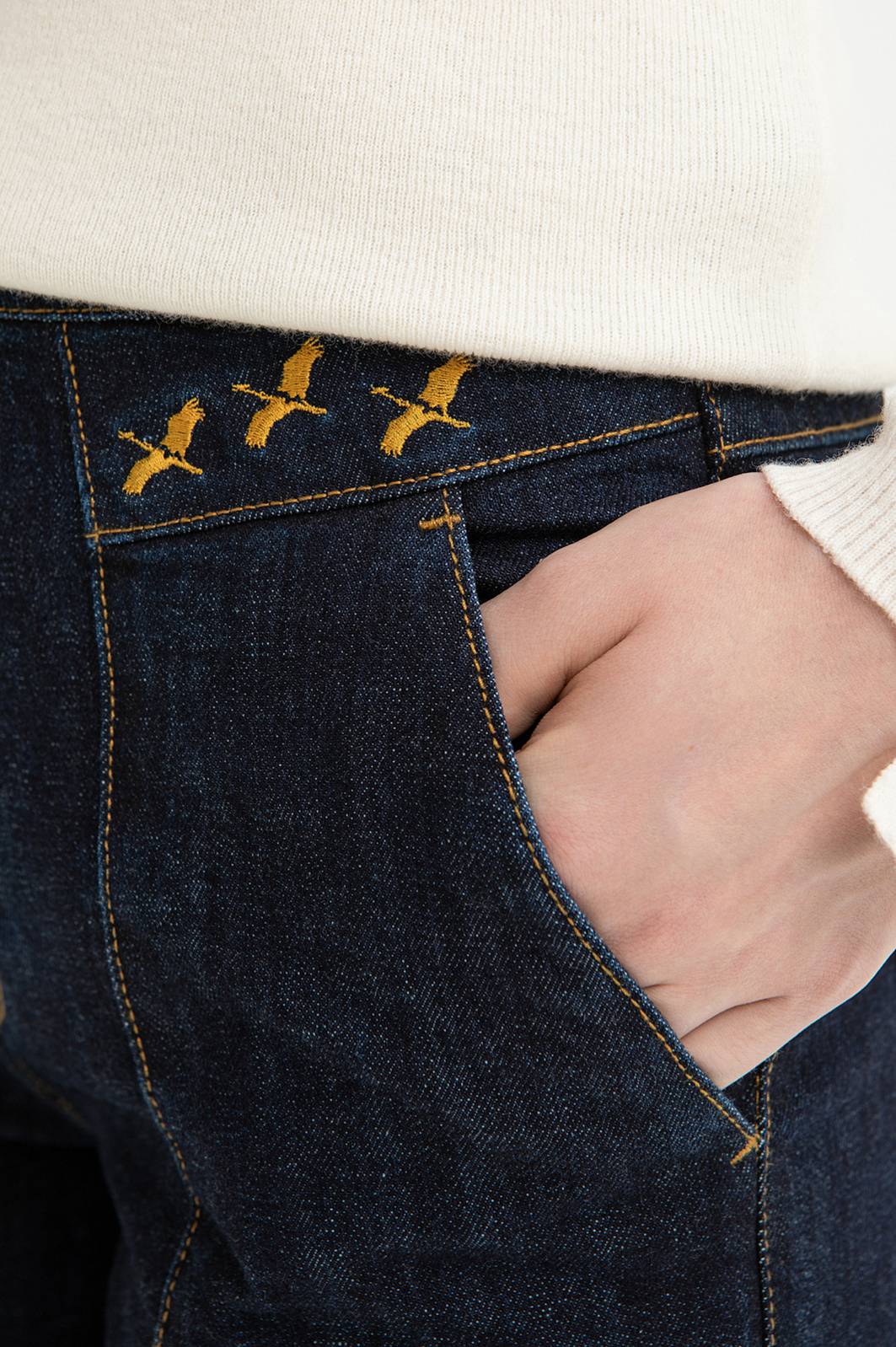Стильные тёмно-синие джинсы KANZLER сложного кроя с застроченными стрелками — сочетание строгой геометрии и продуманных деталей. Чёткий, устремлённый вверх силуэт создаёт изысканный образ. Спереди брюки украшены фирменной вышивкой в виде летящих журавлей — символом лёгкости и движения, который добавляет модели индивидуальности. Контрастные оранжево-охристые швы придают выразительность и подчёркивают линии кроя. По бокам на поясе расположены затяжки с пряжками, позволяющие регулировать посадку и создающие лёгкий функциональный акцент. Плотный традиционный деним с косым рубчиком, созданный из натурального гипоаллергенного дышащего хлопка (99%), приятен к телу. Благодаря небольшому добавлению спандекса (1%) материал легко адаптируется к индивидуальным особенностям фигуры и сохраняет аккуратную форму.