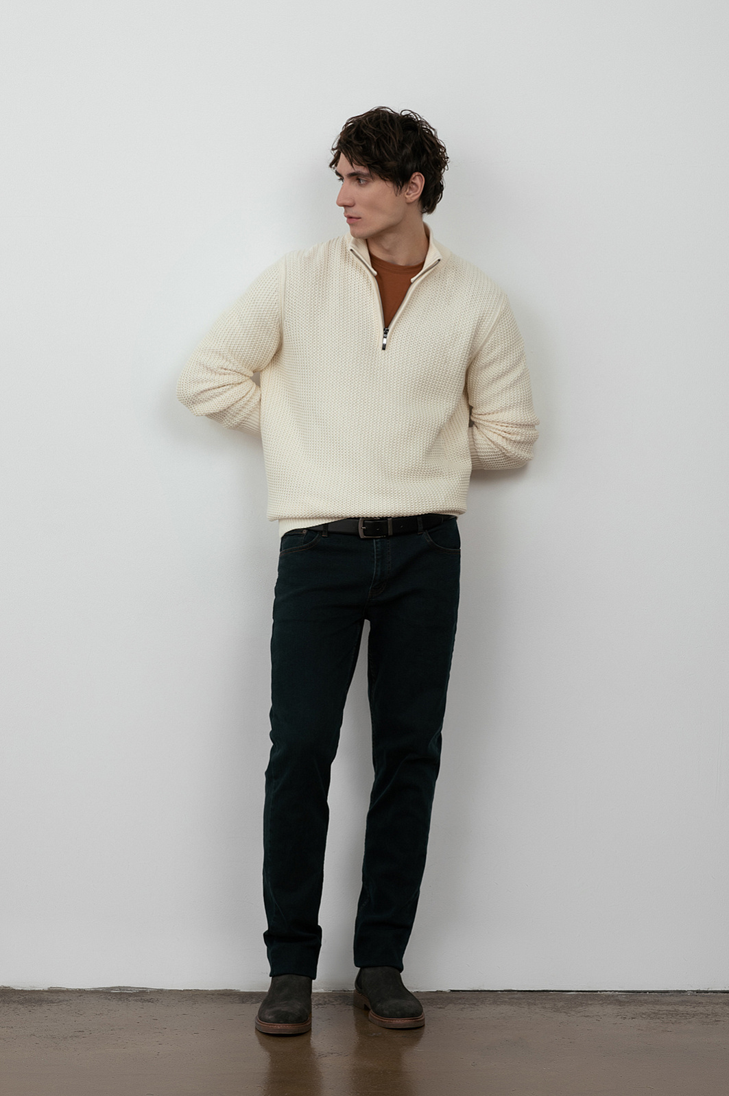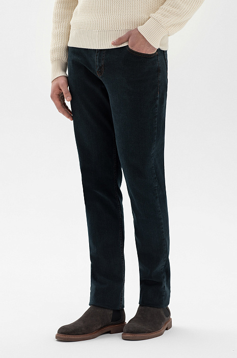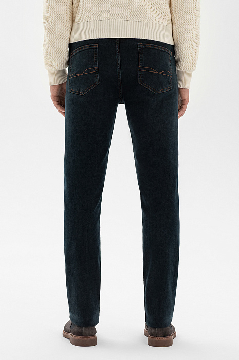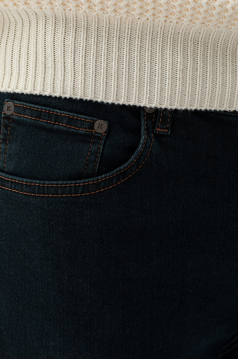 Джинсы KANZLER из тёмно-синего хлопкового денима — надёжная основа повседневного гардероба с акцентом на качество и детали. Классический крой с пятью карманами сохраняет проверенную временем эстетику модели, а прямой силуэт обеспечивает комфортную посадку для любого типа фигуры. Контрастная коричневая строчка отсылает к аутентичным джинсовым традициям. Заклёпки с фирменным инициалом выступают деликатным декоративным акцентом и одновременно усиливают конструктивную надёжность модели. Прочный мягкий деним из гипоаллергенного дышащего хлопка (98%) с добавлением эластана (2%) обеспечивает комфорт и ощущение свежести в течение дня.