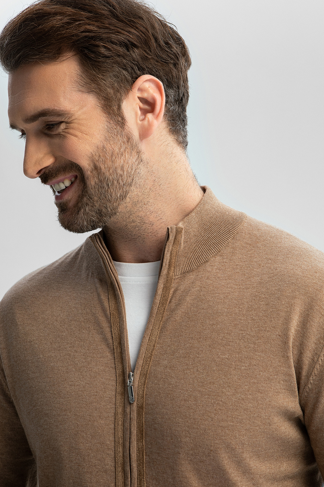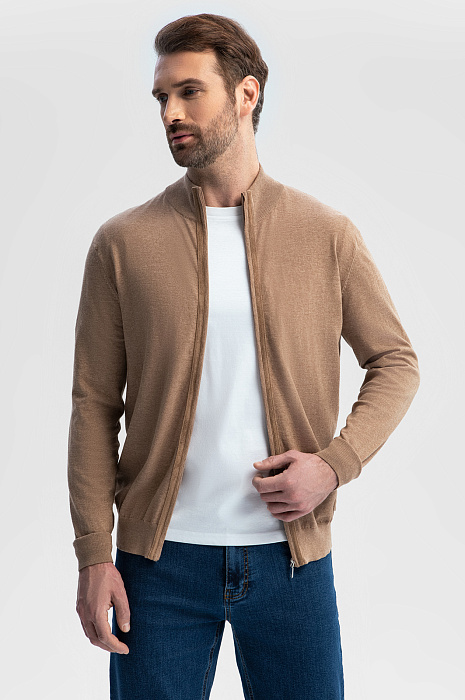 Бежевый кардиган из хлопка Пима с отделкой из алькантары в Самаре