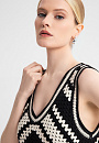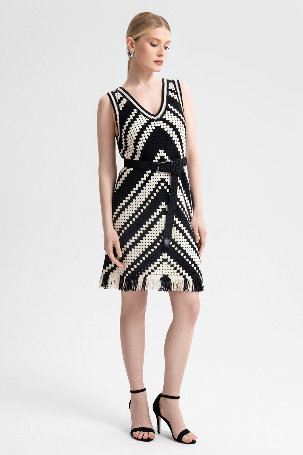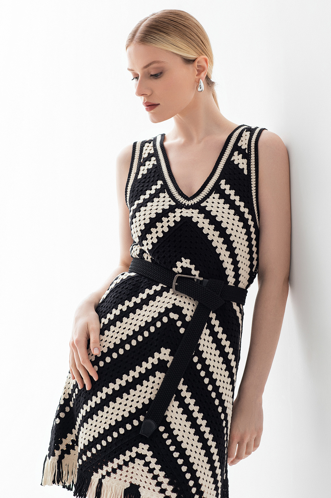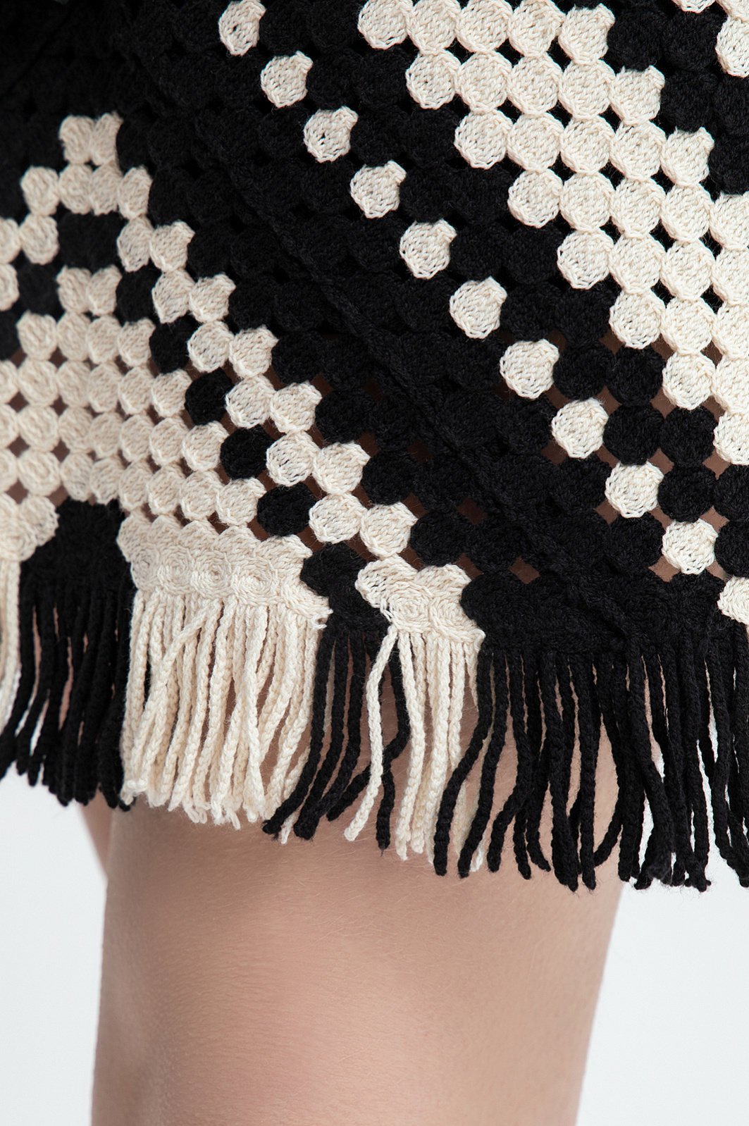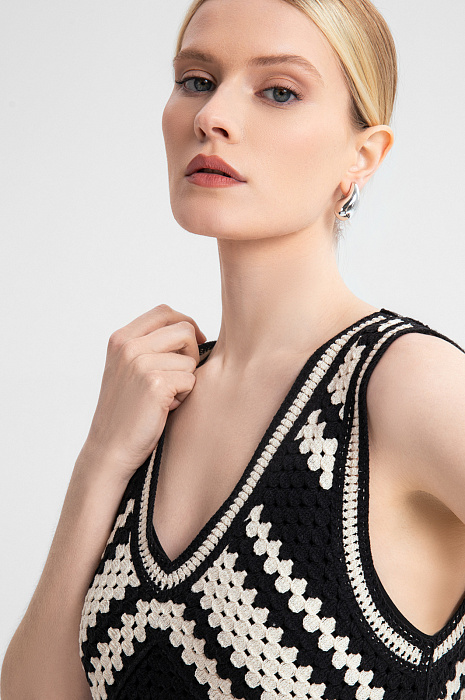 Стильное платье KANZLER ажурной вязки из черной и белой хлопковой пряжи — обезоруживающее заявление непринужденной женственности. Аргументами служат прилегающий крой, длина мини, глубокий Треугольный вырез и открытые руки. Прохладным вечером наряд можно дополнить джинсовой курткой или накидкой. Модель в стиле бохо, украшенная контрастными рисунком и бахромой на подоле, дарит нежную прохладу в теплые дни. Мягкая пряжа сочетает воздушный гипоаллергенный хлопок (70%) и прочные нити акрила (30%). Легкое нижнее платье из прочного гладкого материала облегчает надевание и поддерживает форму ажурного материала. Параметры модели: рост 175, 88-65-92 Размер на модели: S