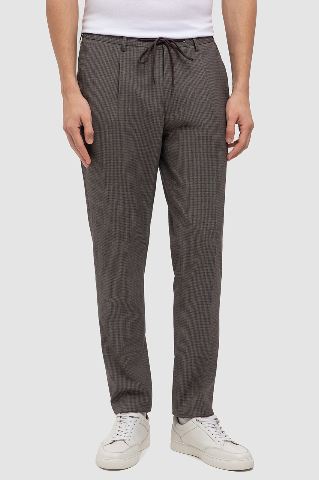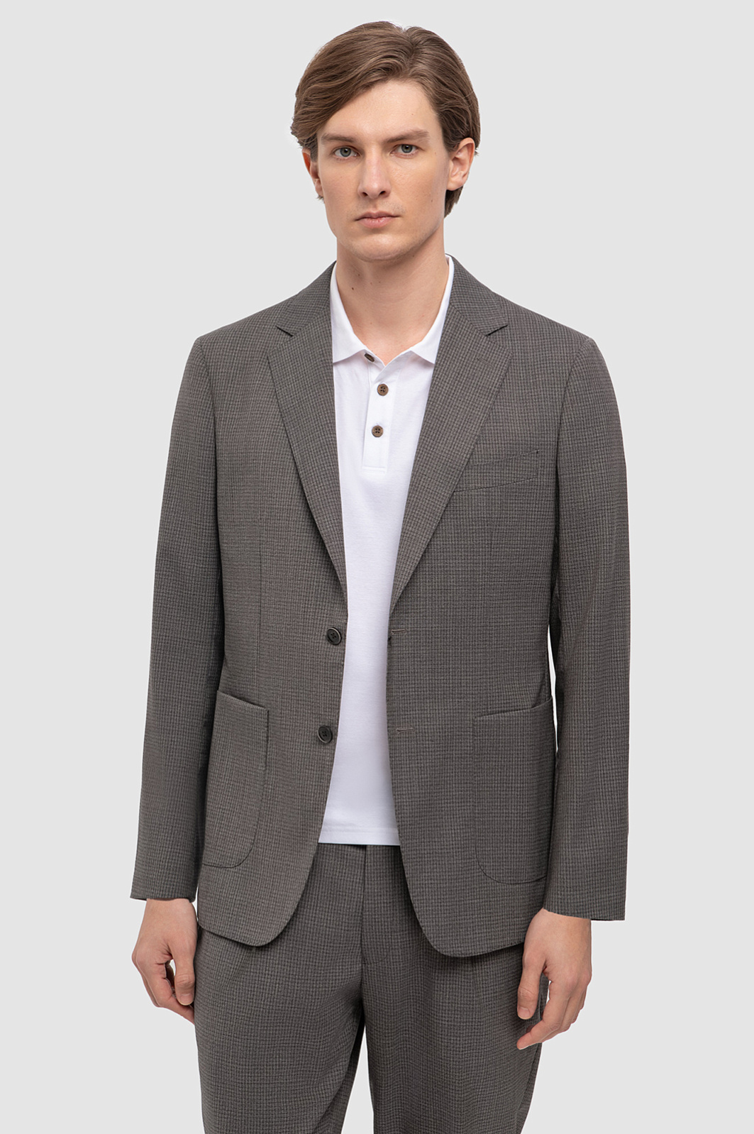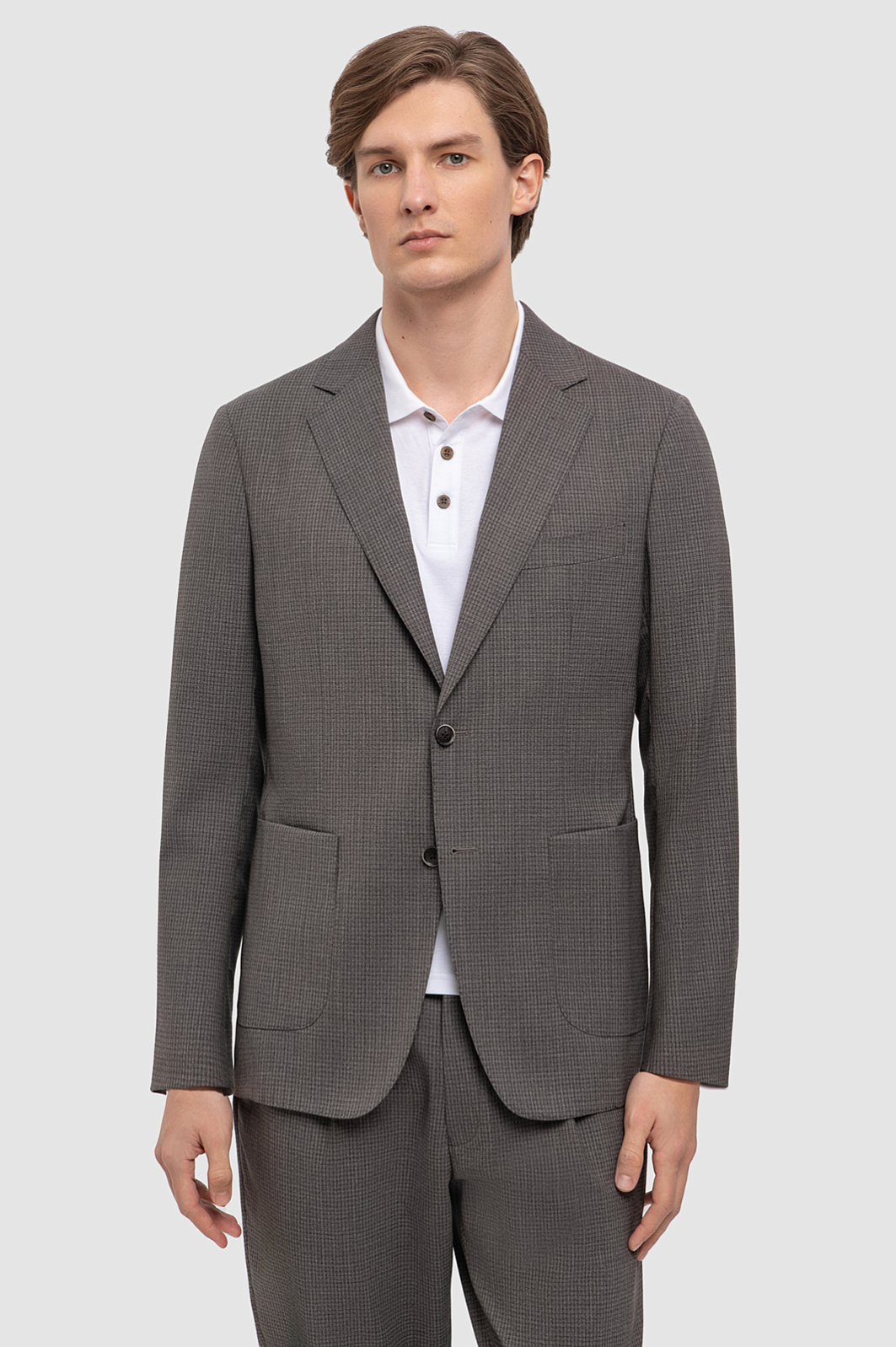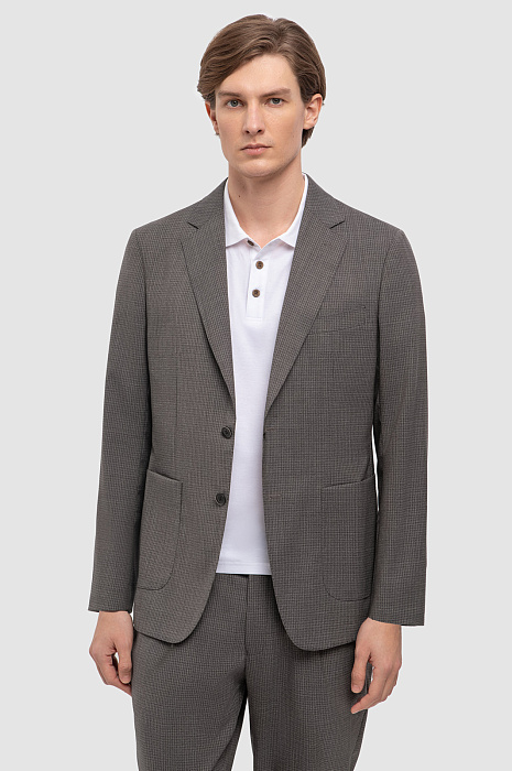 Коричневый костюм KANZLER в мелкую клетку из тонкой благородной шерсти излучает спокойствие, достоинство и уверенность. Он легко переносит длинный рабочий день, плавно переходящий в свободный вечер. Элегантная современная двойка состоит из однобортного полуприлегающего пиджака с двумя шлицами, аккуратными накладными карманами и брюк слегка зауженного силуэта с резинкой и шнурком на поясе — для безупречной посадки и удобства. Дорогая шерсть мериноса Супер 120S сохраняет тепло и защищает от перепадов температуры. Благодаря упругости волокон, ткань сохраняет форму в течение всего дня.