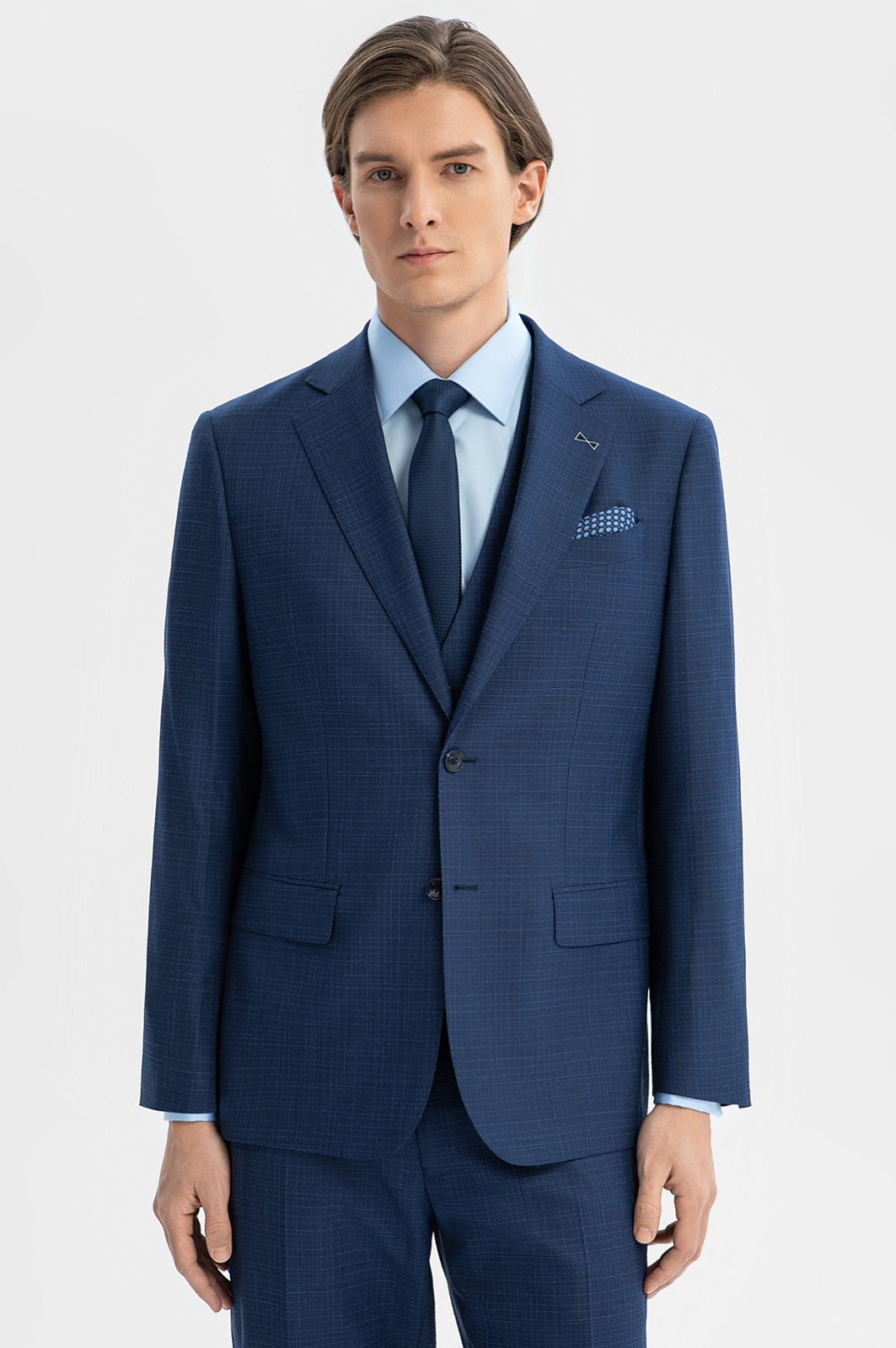 Изысканный костюм-тройка KANZLER синего цвета из дорогой натуральной ткани с водоотталкивающей обработкой идеально подойдет эффективному руководителю, эксперту и профессионалу. Он составлен из однобортного пиджака с двумя шлицами сзади, брюк со стрелками и жилета, которые сшиты из смесовой ткани с полотняным переплетением. В составе материала — тонкая сертифицированная шерсть мериноса Супер 120S (90%) с добавлением гипоаллергенных волокон хлопка и льна, которые улучшают воздухопроницаемость. Водоотталкивающая обработка защищает костюм от загрязнений и намокания и сохраняет аккуратный вид в любых погодных условиях.