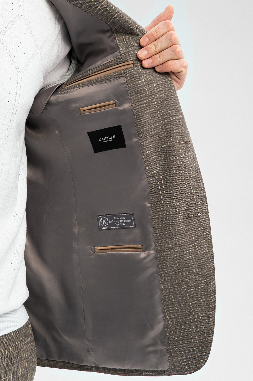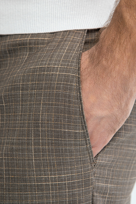 Светло-коричневый костюм KANZLER из шерсти, хлопка и льна с водоотталкивающей обработкой — союз современной элегантности, аристократической небрежности и комфорта. Двойка составлена из классического однобортного пиджака приталенного силуэта с естественной линией плеча и двумя шлицами сзади и слегка зауженных брюк со стрелками. Рисунок в тонкую клетку добавляет образу легкости. Натуральная смесовая ткань — воплощение роскоши и комфорта. Упругие волокна тонкой шерсти мериноса Cупер 120S (90%) хорошо держат форму и придают материалу благородный лоск. Хлопок и лен обеспечивают теплорегуляцию и свежесть тела. Особая обработка защищает ткань от капризов погоды и загрязнений.
