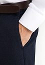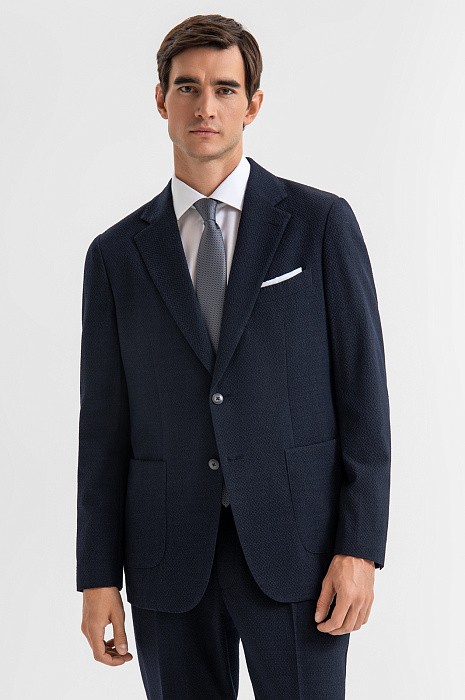 Роскошный костюм-двойка KANZLER из фактурной тонкой шерсти мериноса глубокого синего цвета — современное прочтение классики для тех, кто ценит стиль, комфорт и уверенность в образе. Он подойдёт для неформальных деловых встреч, работы в офисе и публичных выступлений. Пиджак прилегающего кроя с частичной подкладкой и накладными карманами придаёт образу собранный и динамичный вид. Брюки слегка зауженного силуэта со стрелками и мягкими защипами на талии выглядят элегантно и строго, оставаясь комфортными. Материал высокого качества — дорогая костюмная шерсть Супер 120S с добавлением 3% эластана — обладает мягкой текстурой, воздухопроницаемостью и лёгкой эластичностью, которая обеспечивает отличную посадку.
