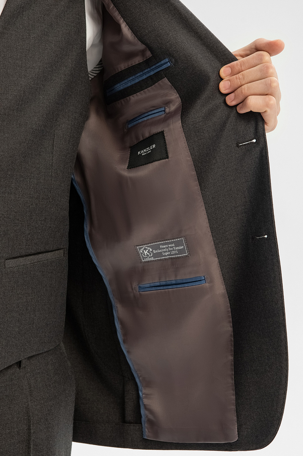 Деловой костюм-тройка KANZLER серо-коричневого оттенка из шерсти, устойчивой к сминанию, — заявка на включение в список самых стильных и хорошо одетых мужчин. Это современная классика, которая уместна везде, где нужно выглядеть элегантно и собранно. Костюм состоит из пиджака умеренно широкого силуэта, изысканного жилета и брюк со стрелками. При желании тройку можно сократить до двойки и носить в различных комбинациях: пиджак с брюками или жилет с брюками. Все сшито из превосходной тонкой шерсти мериноса Супер 120S. Премиальная ткань сохраняет естественное тепло и отличается непревзойденной износоустойчивостью и способностью восстанавливать форму.
