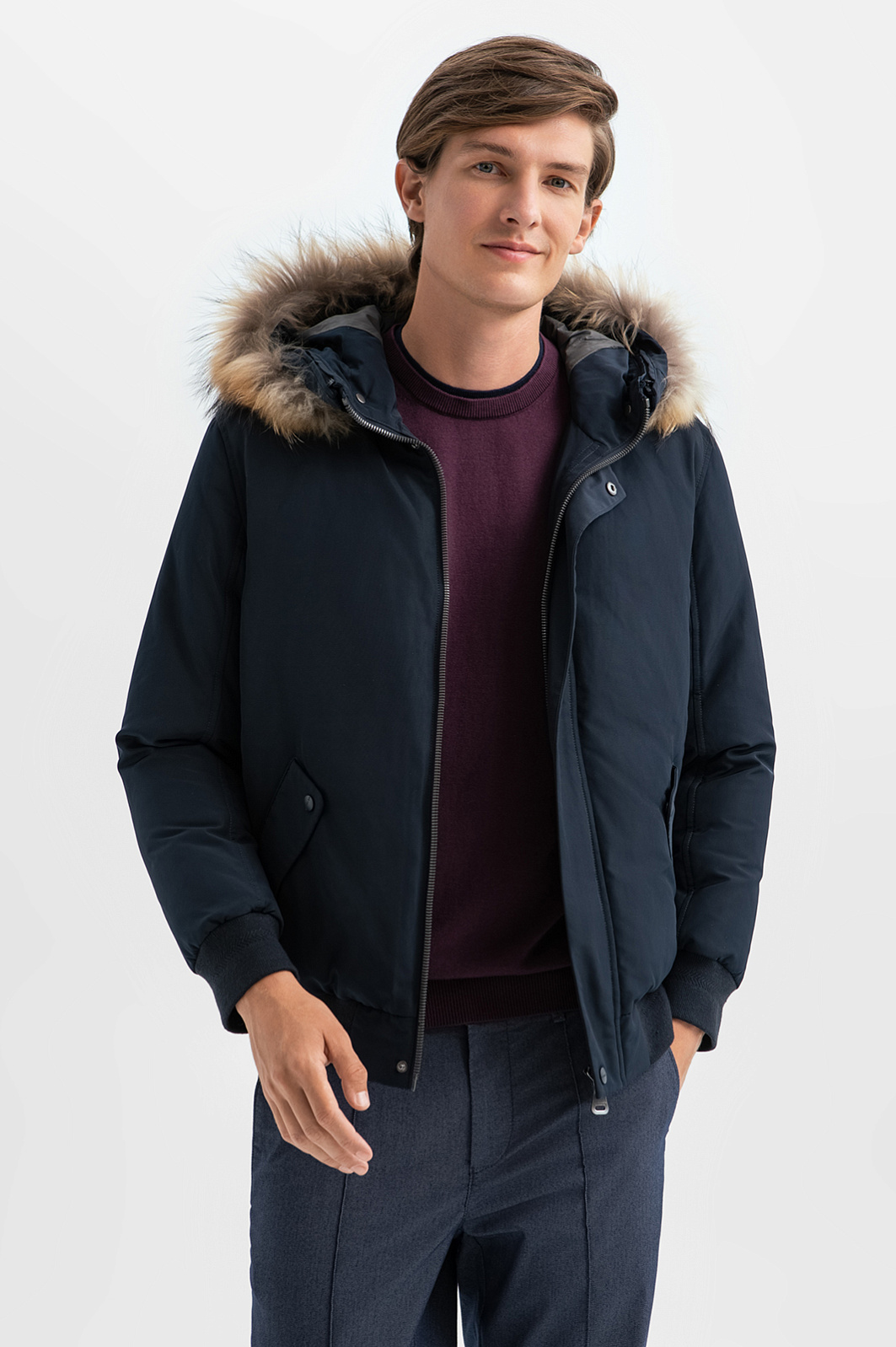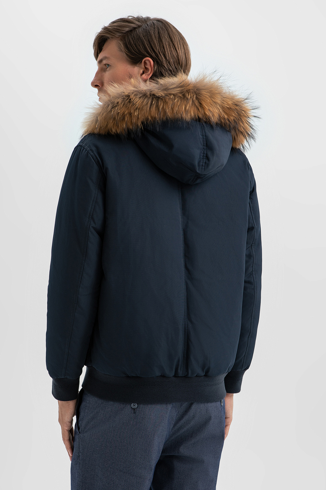 Темно-синяя куртка KANZLER представляет собой вариацию утепленного бомбера с капюшоном. Функциональные детали гармонично сочетаются с отделкой из меха енота, которая придает куртке романтические черты, связанные с образами первопроходцев и золотоискателей. Под прочным водоотталкивающим материалом из полиэстера скрывается теплейший натуральный наполнитель (пух и перо). Внутренняя часть выполнена из практичного полиамида. Боковые карманы с клапанами согреют руки. Внутренний карман с молнией — место для хранения важных мелочей. Аккуратную посадку и плотное прилегание обеспечивают широкая плотная трикотажная резинка на рукавах и по нижнему краю куртки. Параметры модели: рост 191, 97-77-99 Размер на модели: 50