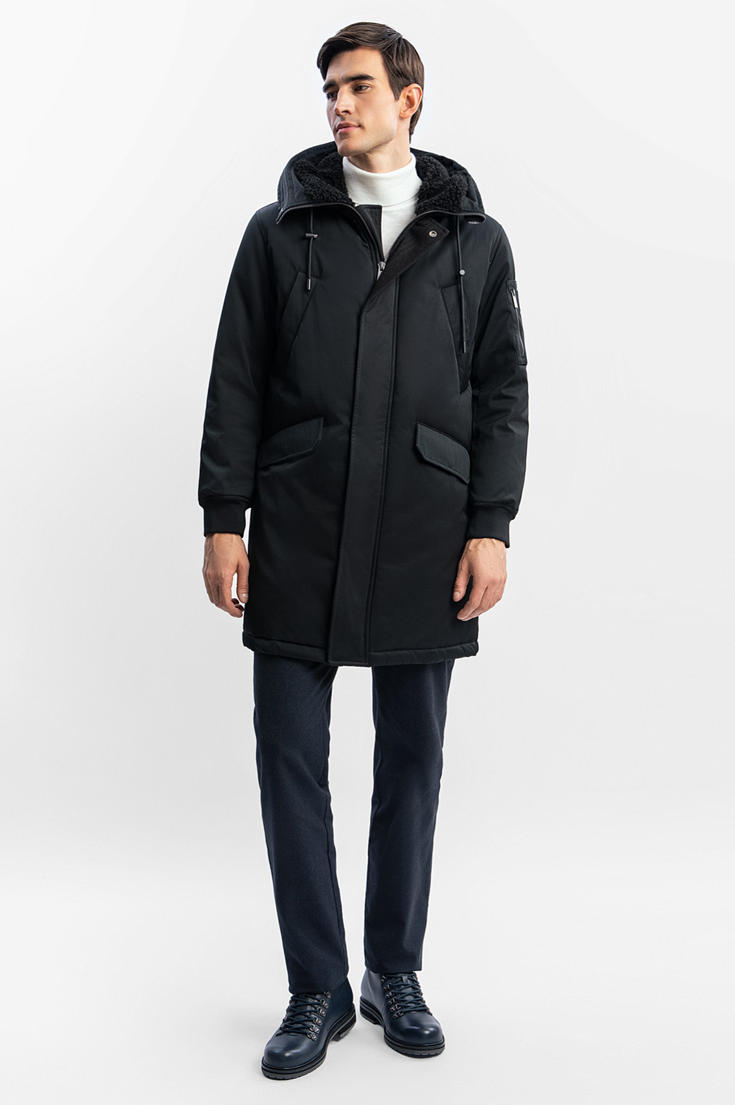 Теплая черная парка KANZLER выполнена из смесового хлопкового материла с водоотталкивающей обработкой. Внутри — наполнитель из полиэстера, сохраняющий тепло. Карманы — пара верхних, пара нижних, с клапанами, и один на рукаве, на молнии, — придают куртке функциональный урбанистический вид. Еще один карман внутри служит для хранения документов и других важных мелочей. Несъемный капюшон с подкладкой из искусственного меха защищает дождя, снега и ветра. Степень прилегания регулируется шнурком со стоппером. Удлиненная универсальная куртка отлично сочетается с одеждой в деловом, повседневном и спортивном стилях. Параметры модели: рост 192, 101-76-97 Размер на модели: 50