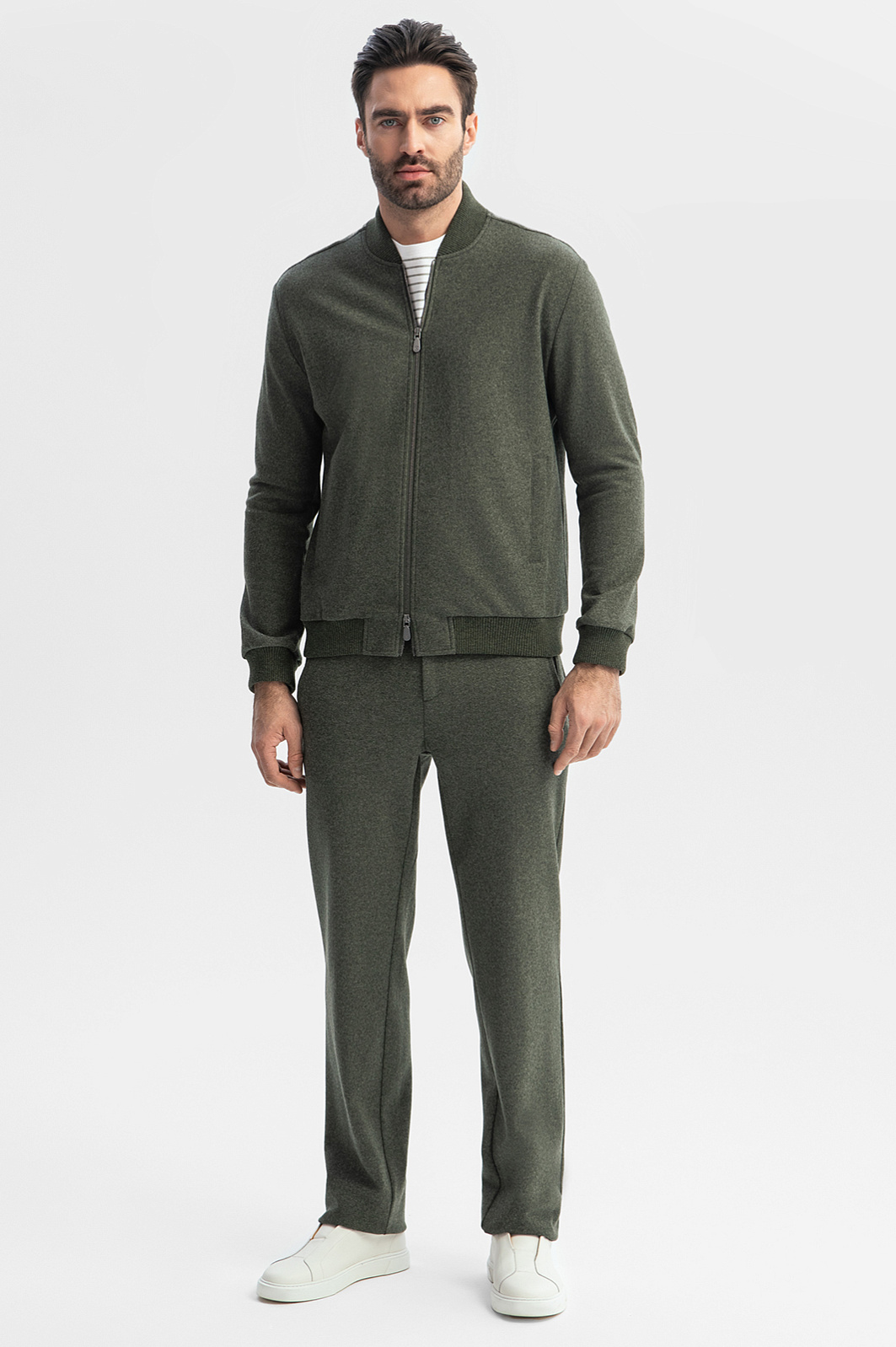 Суперкомфортный бомбер, взял в комплекте с брюками. Выглядит достойно. Можно носить костюмом, а можно сочетать с джинсами или брюками. Универсальный вариант на межсезон