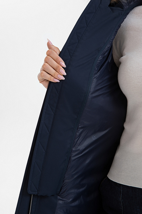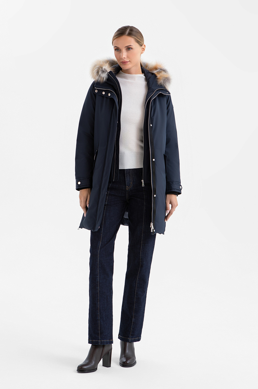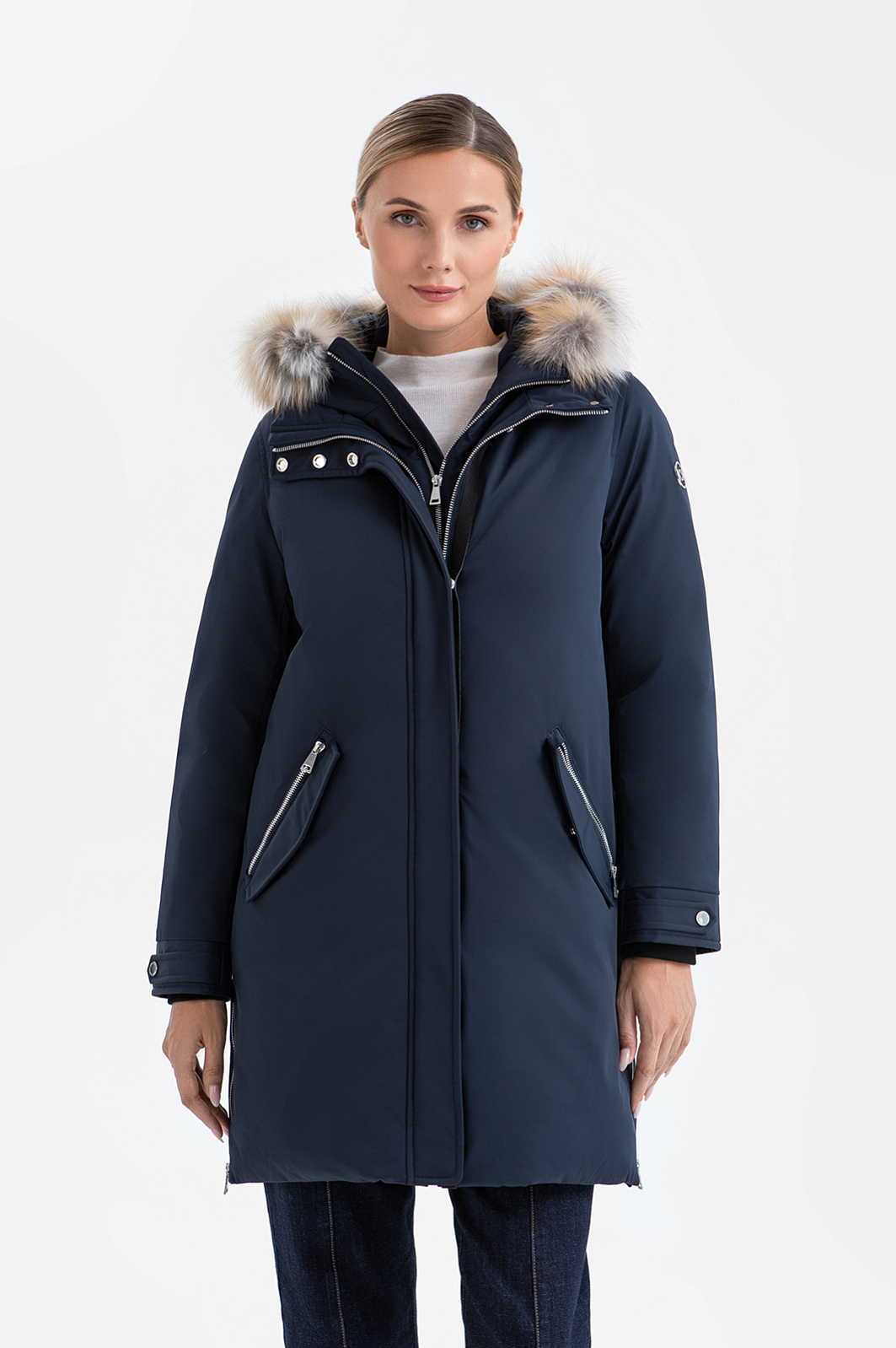 Утеплённая тёмно-синяя куртка KANZLER с натуральным мехом — сочетание современной эстетики и комфорта. Стильная и универсальная вещь для городских прогулок в холодный сезон. Лаконичный образ задан прямым силуэтом и строгой планкой со скрытыми кнопками. Отделка из меха лисы придаёт модели женственность и служит роскошным украшением. Высокий воротник, манишка и объёмный капюшон с регулируемым ремешком защищают от ветра и снега. Карманы с клапанами на молнии и паты с кнопками на рукавах, а также небольшие боковые застёжки добавляют современного шика и функциональности. Непродуваемая ткань верха отличается прочностью и способностью сохранять форму. Сочетание практичного технологичного волокна (полиэстер) с мягким уютным натуральным кашемиром в составе наполнителя гарантирует лёгкость и оптимальную температуру для тела даже в морозные дни.