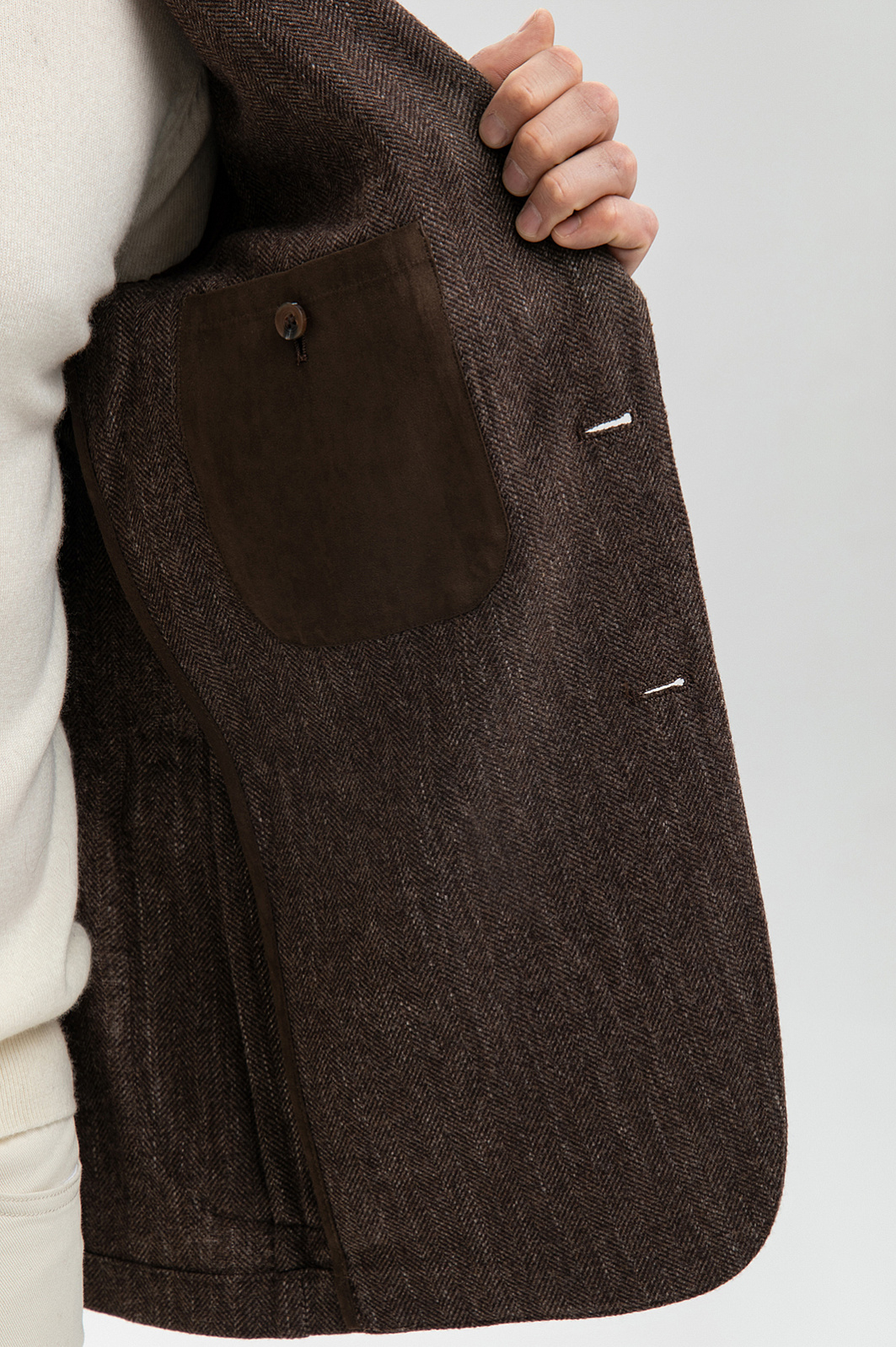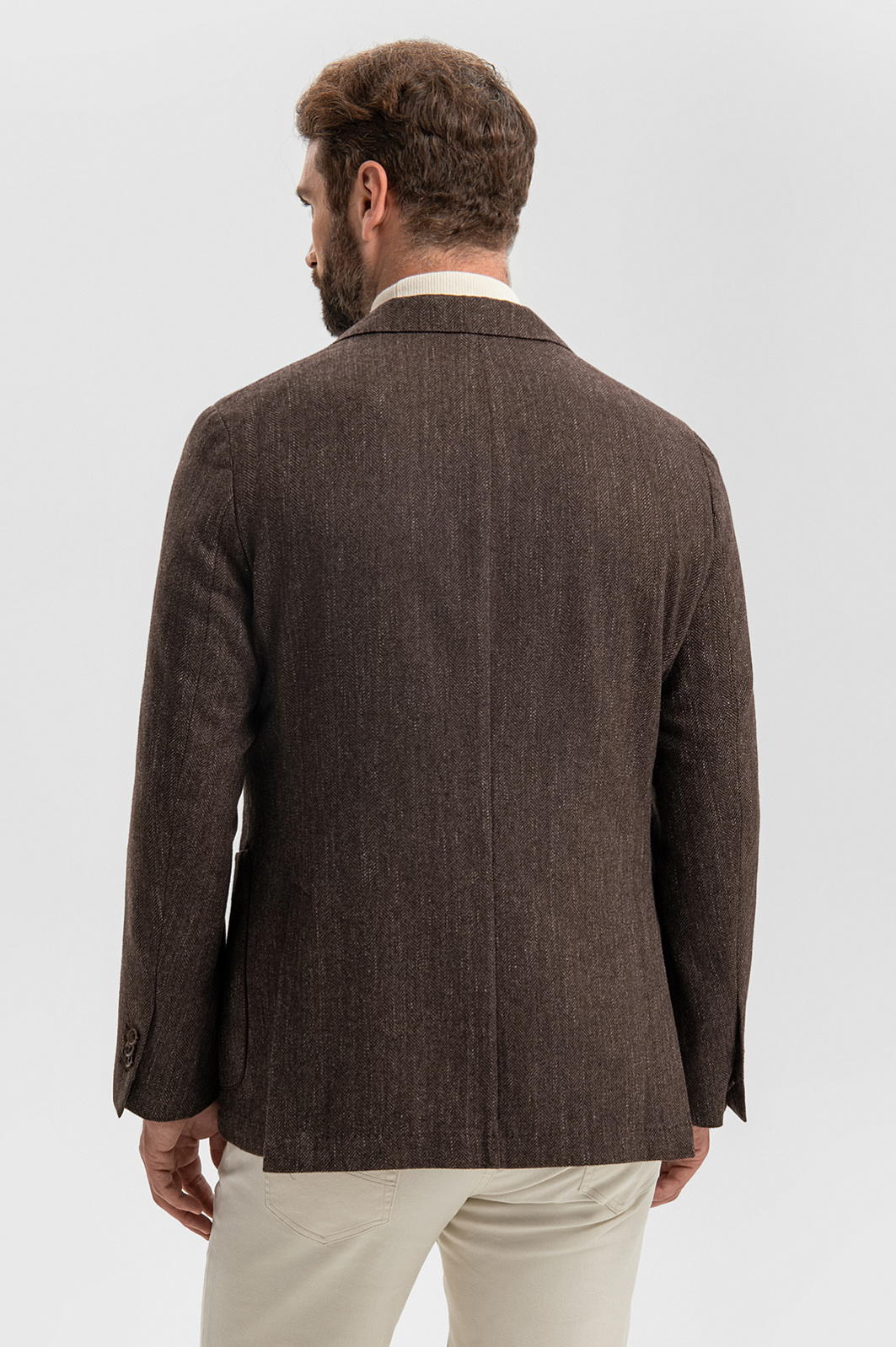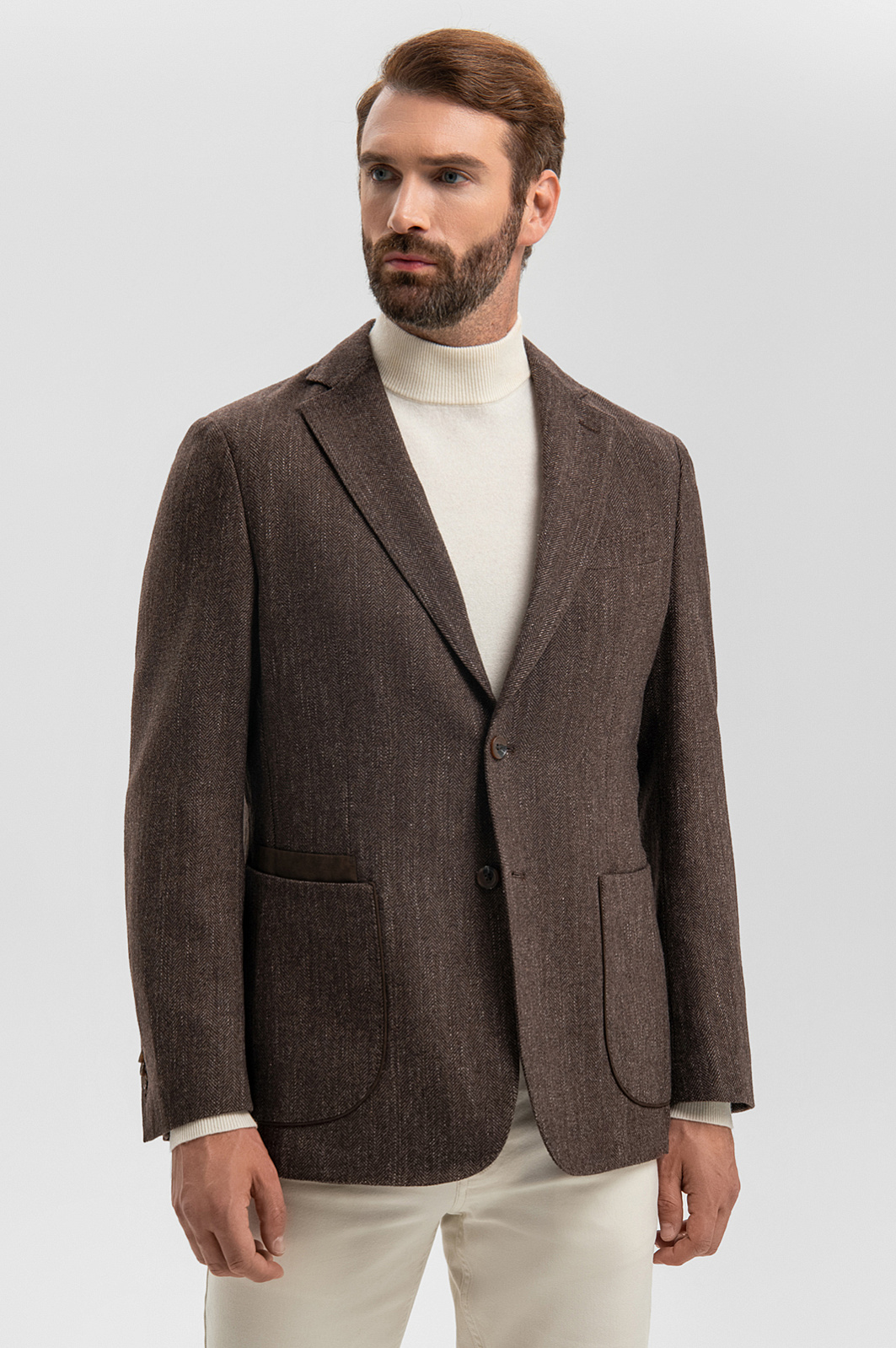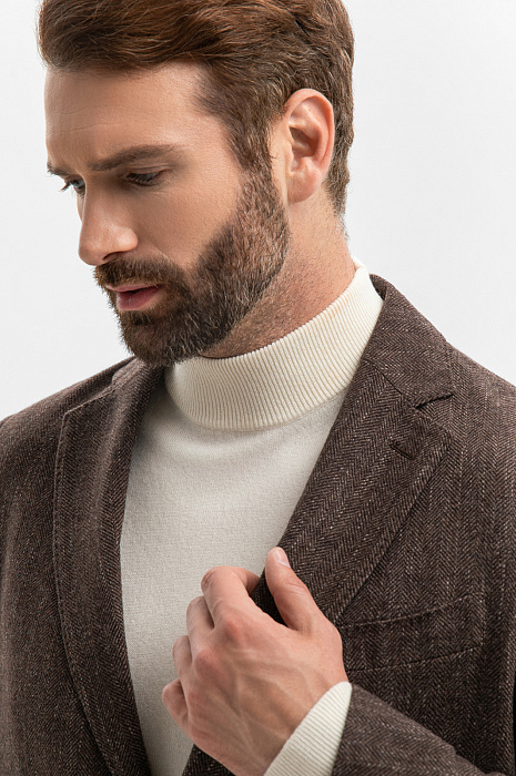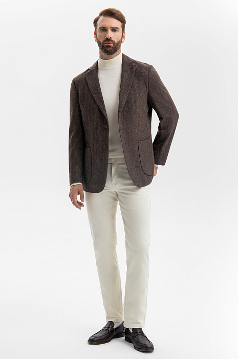 Роскошный однобортный коричневый пиджак KANZLER из хлопка и шерсти — воплощение сдержанной элегантности и вневременного стиля. Модель легко интегрируется как в деловой, так и повседневный гардероб. Свободный силуэт придает образу непринужденность. Классические детали — пуговицы в тон, нагрудный карман, отделочная строчка, петлица — гармонично сочетаются с лацканами современной формы, облегченным кроем без подкладки, мягким плечом и аккуратными накладными карманами. Выразительный рисунок «ёлочка» в сочетании с легким меланжевым эффектом, созданный более светлыми нитями, придает ткани глубину, текстуру и сложность. Благородный дорогой материал хорошо пропускает воздух, поддерживает естественное тепло тела и сохраняет форму. Он состоит из легкого воздухопроницаемого хлопка, упругих тонких волокон шерсти и прочнейших нитей полиэстера. Параметры модели: рост 189, 102-80-99 Размер на модели: 50