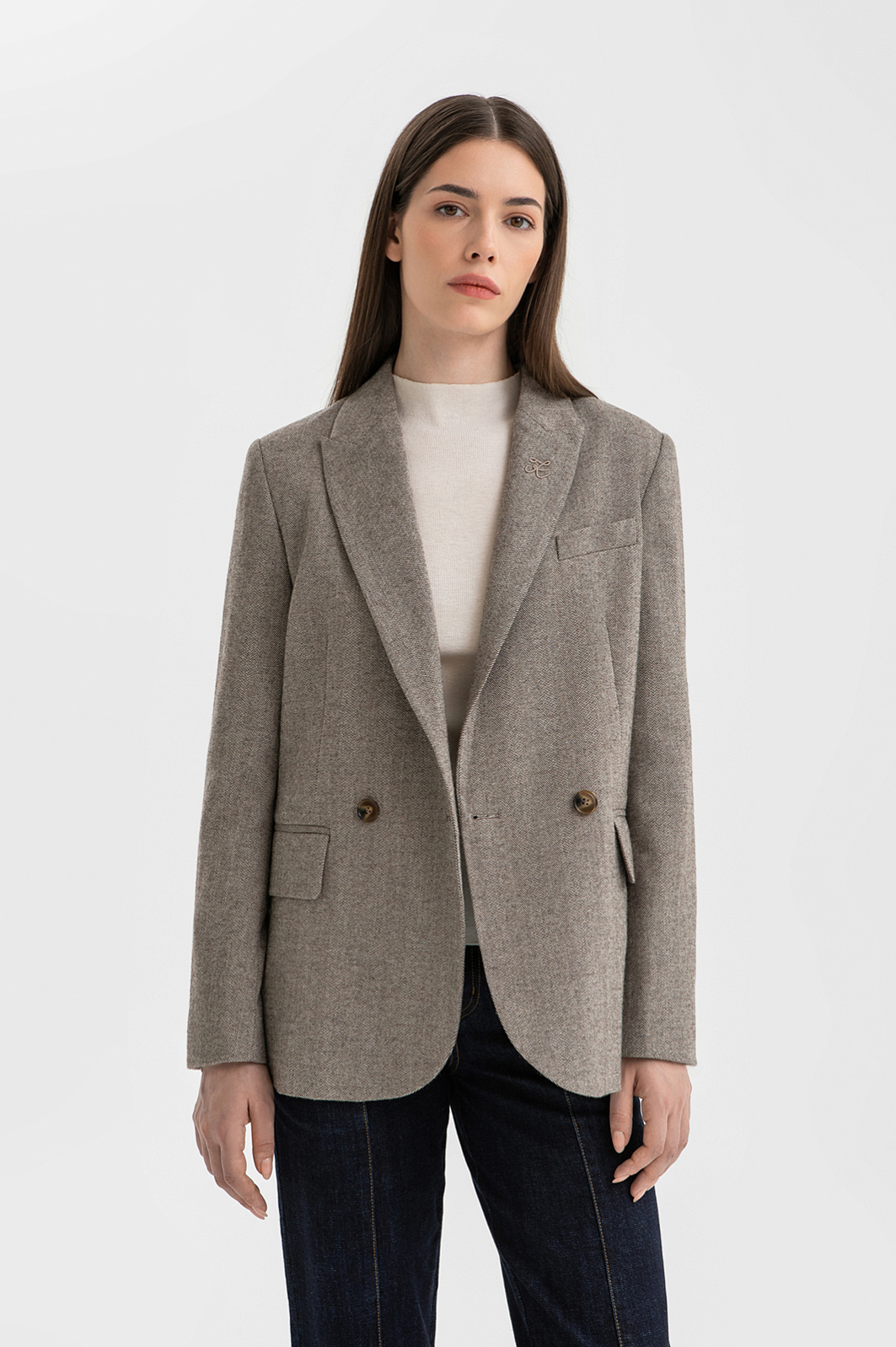 Элегантный двубортный пиджак KANZLER со скруглёнными полами из смесовой шерсти — универсальная модель для современного делового гардероба. Мягкий бежевый оттенок подчеркивает утончённость образа, а приятная фактура плотного саржевого плетения (узор «ёлочка») придаёт материалу глубину и благородство. Нагрудный карман оформлен аккуратной листочкой, нижние карманы прикрыты классическими клапанами. Лацкан украшен фирменным инициалом, который придаёт пиджаку индивидуальность. Сзади расположена шлица, обеспечивающая комфорт и свободу движений. Смесовая ткань на основе натуральных гипоалергенных волокон шерсти и хлопка усилена долговечным износоустойчивым полиэстером.