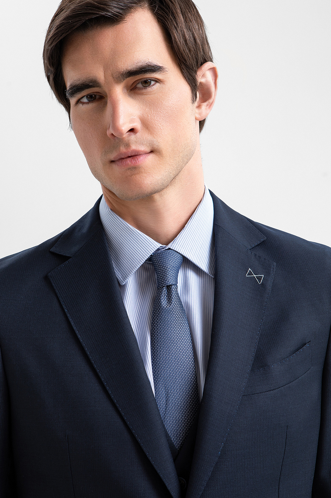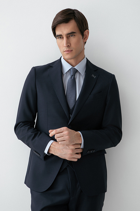 Пиджак KANZLER из тонкой мериносовой шерсти Супер 120S глубокого синего цвета подойдёт деловому мужчине, для которого элегантность — естественное состояние. Зауженный силуэт подчёркивает фигуру, сохраняя свободу движений. Нагрудный карман с листочкой и нижние карманы с аккуратными клапанами поддерживают классические традиции. Небольшая вышитая фирменная бабочка на лацкане — сдержанный акцент, который добавляет образу изысканность и нарядность. Ткань из тонкой гипоаллергенной шерсти мериноса мягко облегает тело, создавая ощущение естественной роскоши. Её суперсила — устойчивость к сминанию. Подкладка, выполненная из прочного гладкого полиэстера и воздухопроницаемой вискозы, обеспечивает лёгкое скольжение при надевании и безупречную посадку.