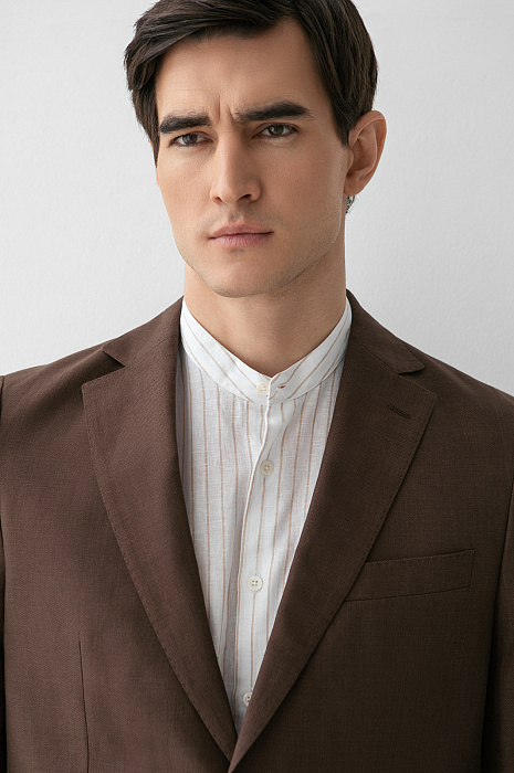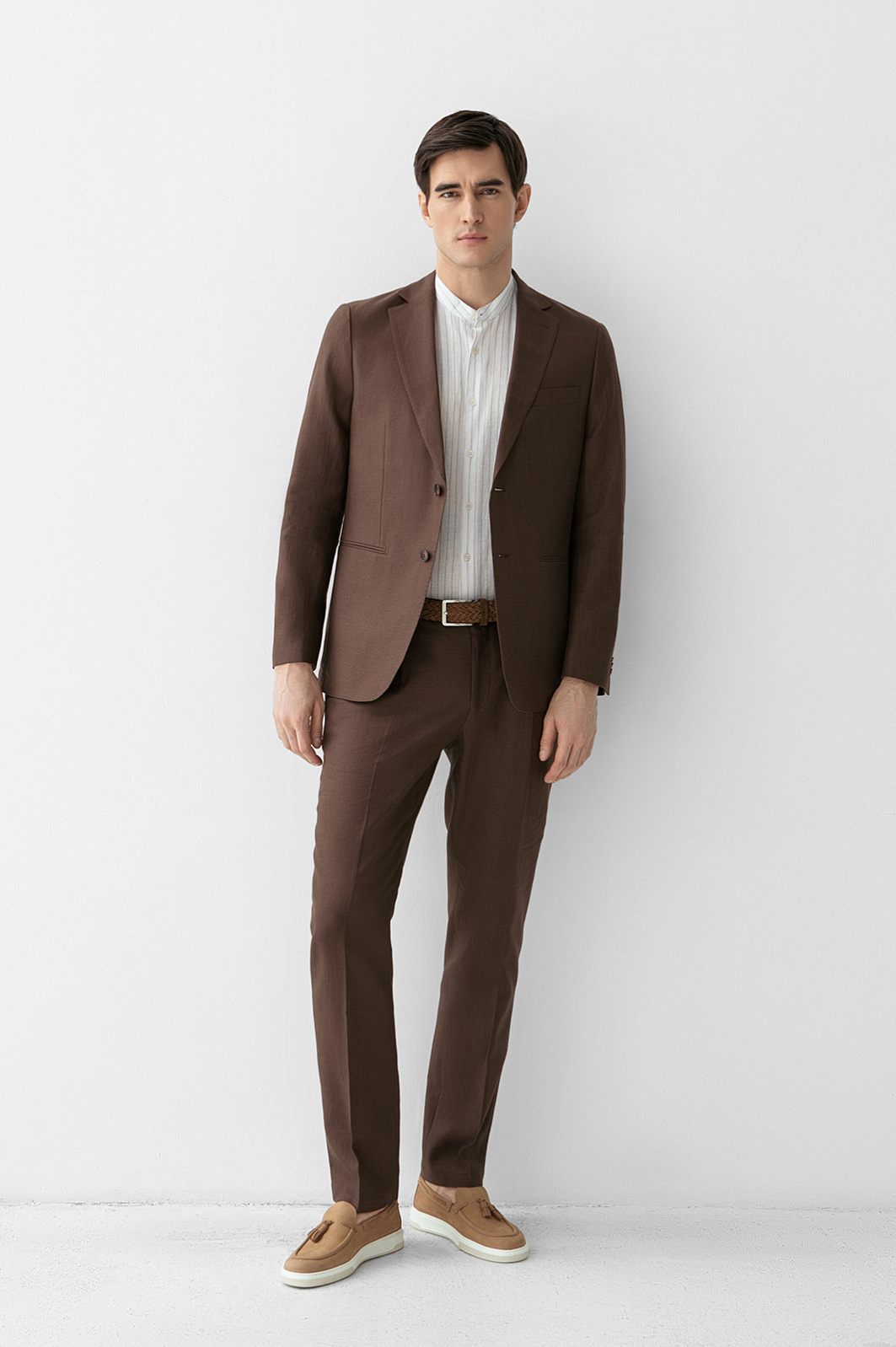 Однобортный пиджак KANZLER в глубоком коричневом оттенке с пуговицами в тон — современная интерпретация классики. Естественный силуэт сочетается с выверенной архитектурой кроя. Облегчённая конструкция с широким подбортом формирует мягкую посадку и подчёркивает непринуждённый характер модели. Петлица, нагрудный карман с листочкой и врезные нижние карманы добавляют строгости, а умеренно широкие лацканы выстраивают сбалансированные пропорции. Натуральная ткань изо льна и хлопка обеспечивает терморегуляцию и естественную циркуляцию воздуха, поддерживая ощущение комфорта и свежести в течение дня.