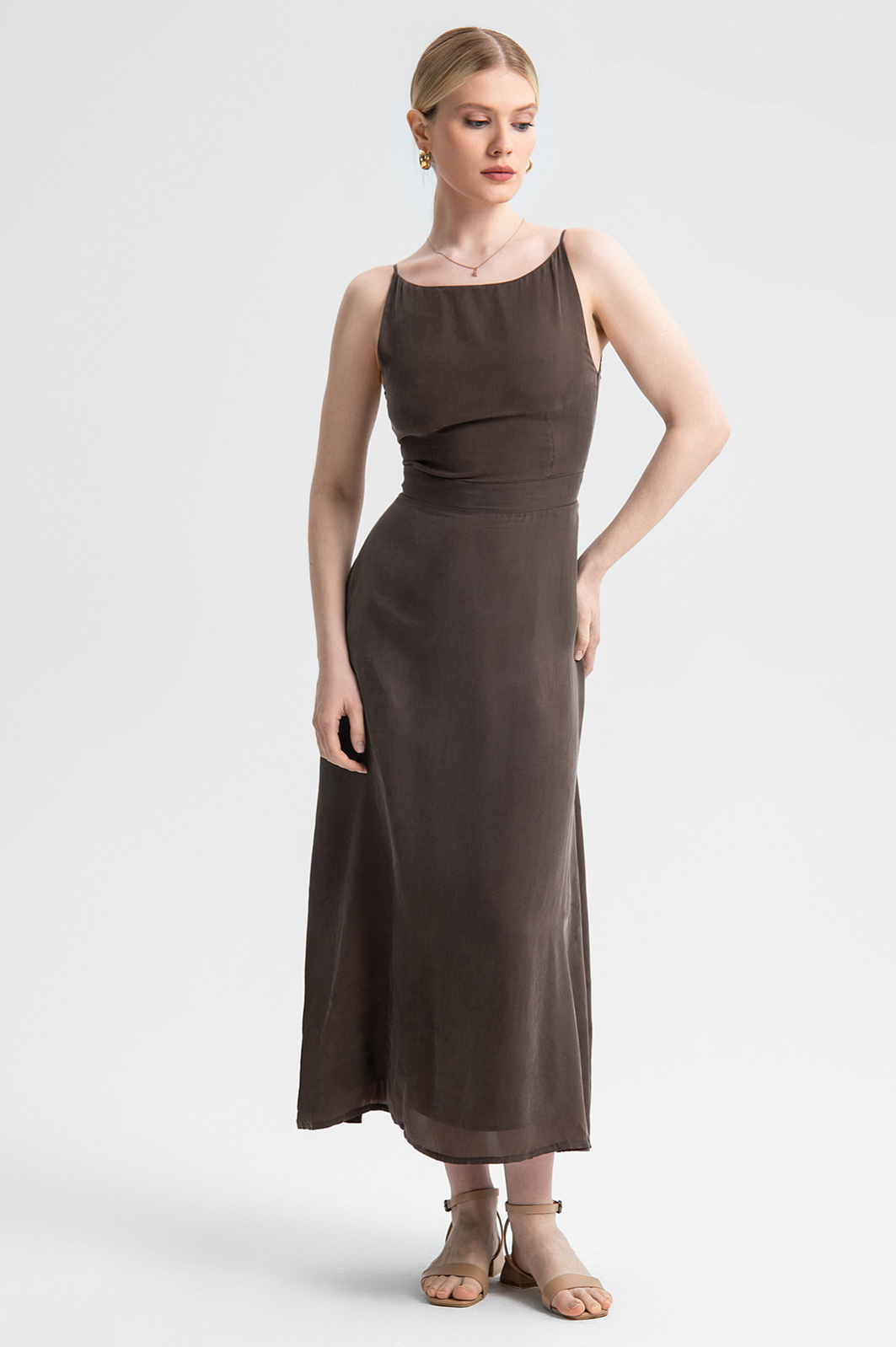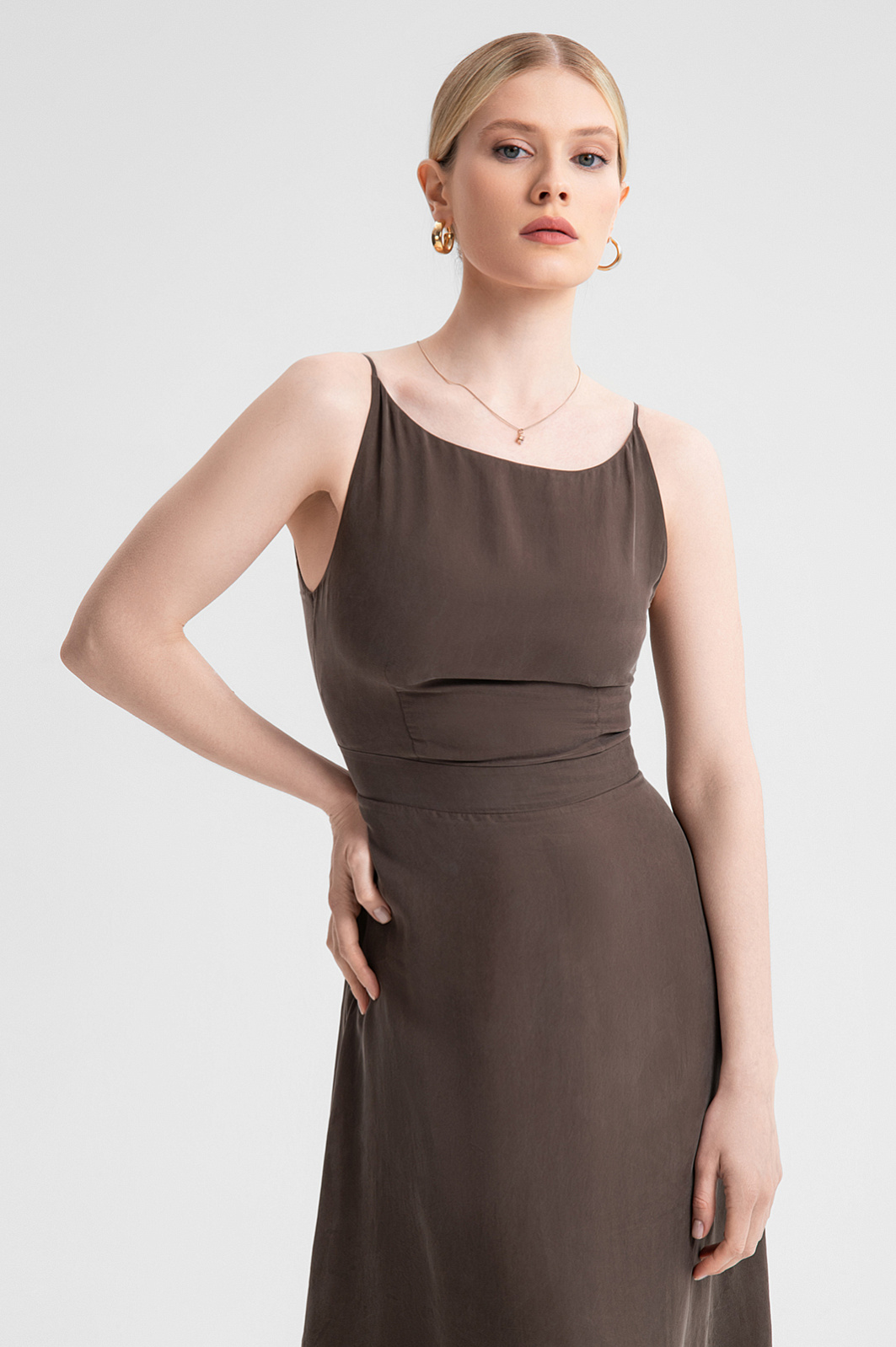 Элегантное платье-миди выполнено из 100% купро — материала, известного своей мягкостью и шелковистой фактурой. Лаконичный дизайн формирует утонченный и актуальный силуэт, а длина миди делает платье подходящим как для повседневных прогулок, так и для особых случаев. Открытые плечи и изящные тонкие бретели создают легкий и воздушный образ. Купро хорошо пропускает воздух и впитывает влагу, обеспечивая комфорт даже в жаркий день. Этот экологичный материал похож на шелк, что гарантирует приятные тактильные ощущения и эффектный внешний вид. Подкладка из вискозы дарит комфорт в течение всего дня. Нейтральный коричневый оттенок будет гармонично сочетаться с аксессуарами золотых, бежевых или пастельных тонов. Идеально подходит для повседневного стиля или вечернего выхода. Параметры модели: рост 175, 88-65-92 Размер на модели: S