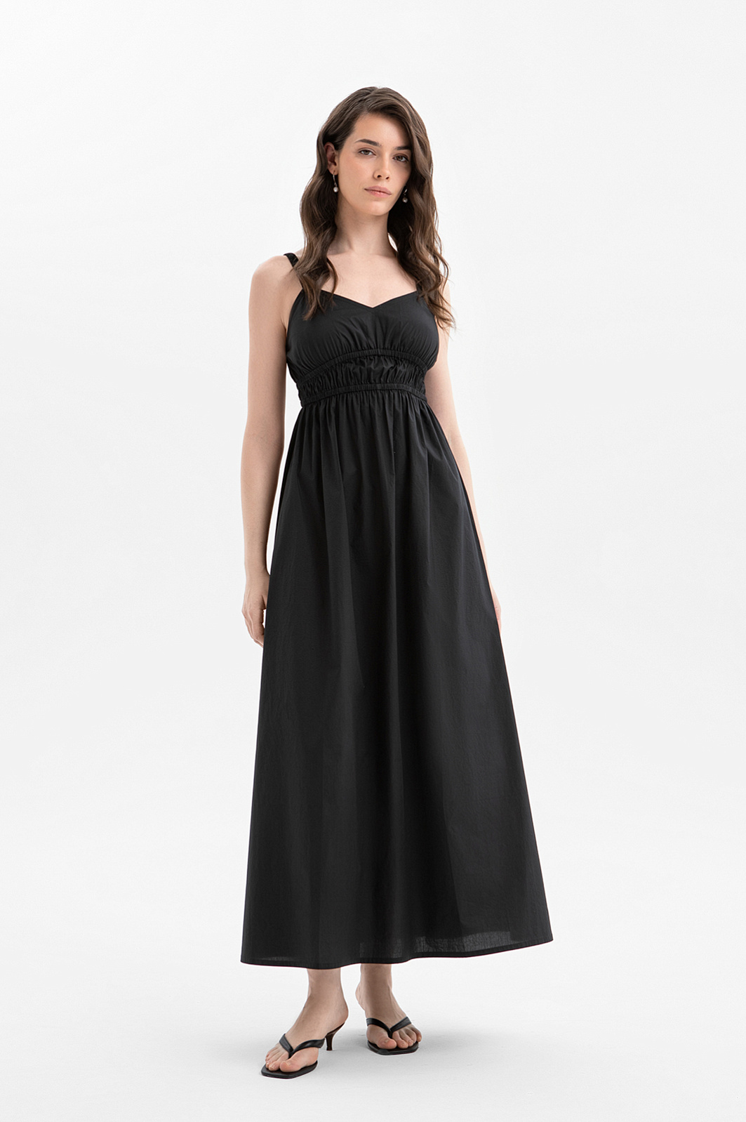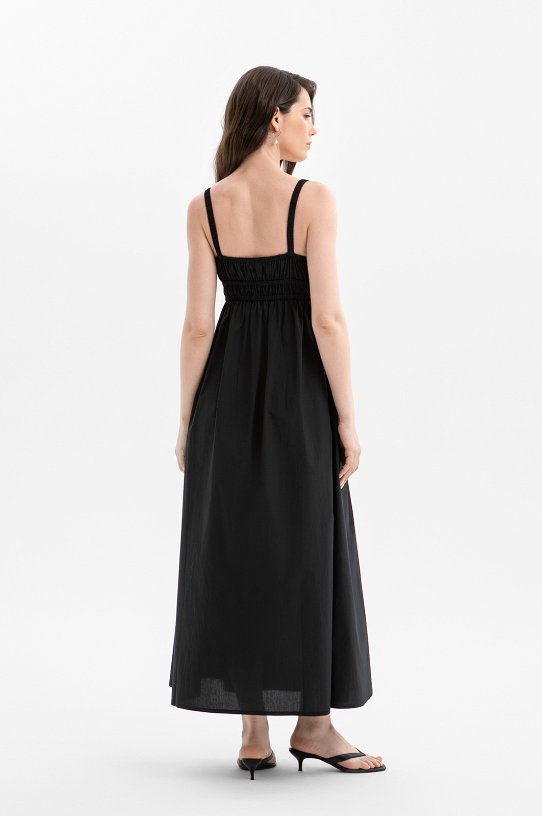 Длинное чёрное платье KANZLER из хлопка — женственная вещь, которая может стать основой стильного романтического образа. В тёплые дни модель идеально подойдёт для выхода в город или свидания. Крой мягко подчёркивает женственные формы, привлекая внимание к линии талии. Очарование платью добавляют бретели, широкий вырез на груди, оставляющий открытыми ключицы, и присборенная спинка. Мягкий лёгкий хлопок — идеальный материал для лета. Он приятен к телу и не раздражает даже самую чувствительную кожу. Его гипоаллергенные волокна хорошо пропускают воздух, поддерживая ощущение свежести в течение дня.