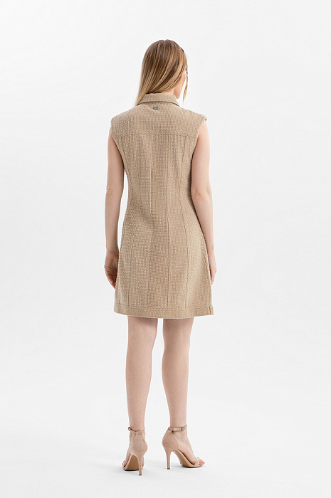 Платье-мини KANZLER без рукавов из бежевой хлопковой ткани сочетает современный минимализм, спорт-шик и городскую эстетику. Лаконичный прилегающий крой подчёркивает линию талии и контуры тела. Передняя часть и спинка выполнены из вертикальных клиньев, которые задают архитектурную строгость и визуально вытягивают фигуру. Текстурный узор добавляет модели шарм и приятную тактильность. А декоративные застёжки c кнопками на подоле отсылают к классической джинсовой одежде. Ткань выполнена из чистого хлопка. Натуральные гипоаллергенные волокна поддерживают циркуляцию воздуха и спасают от перегрева в жаркие дни. Практичный саржевый материал хорошо держит форму и не требует особого ухода.