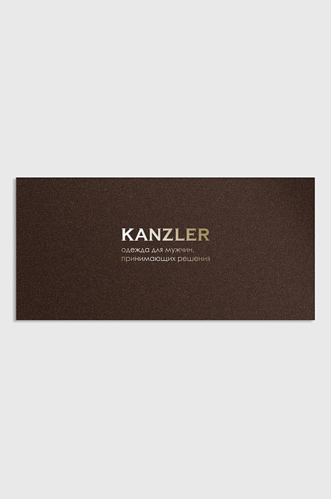 Подарочная карта KANZLER - сочетание подарка и кратчайшего пути к постижению элегантного мужского стиля. Подарочная карта позволит Вам сэкономить своё время, при этом сделать очень практичный и нужный подарок. Наша карта поможет Вам угадать с подарком на все 100% - ведь тот, кому ее дарят, будет самостоятельно совершать покупку и сделает выбор, соответствующий его пожеланиям.