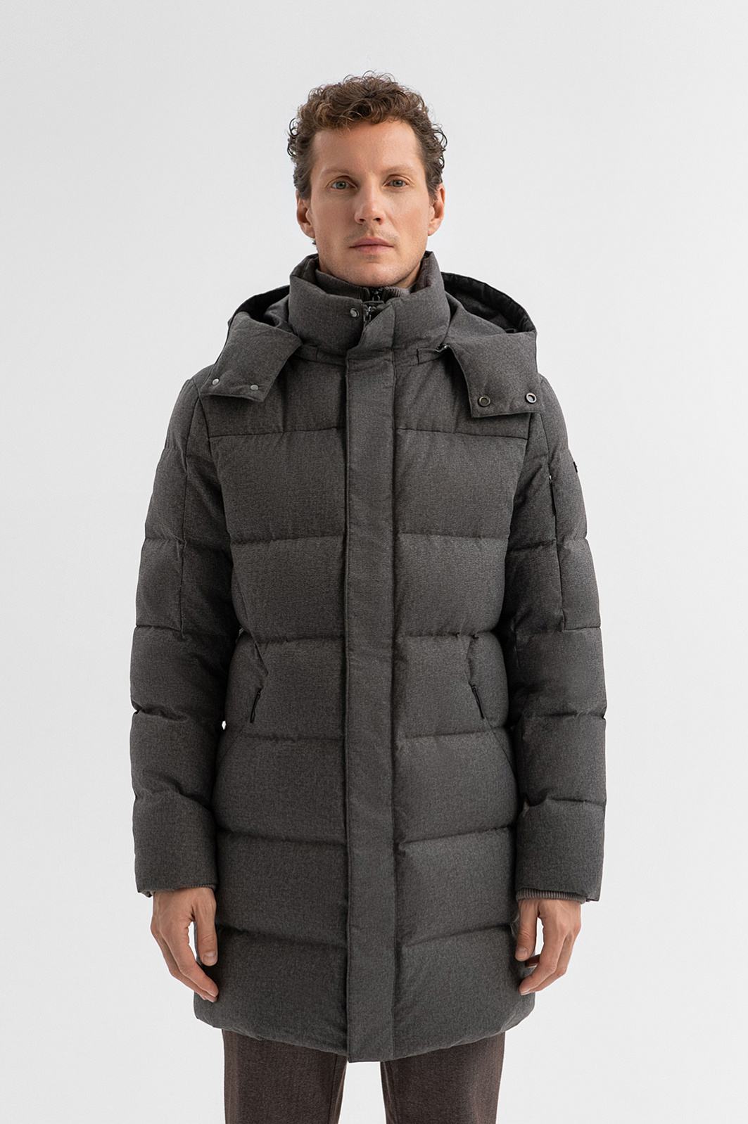 Универсальный коричневый стеганый пуховик KANZLER с трикотажной манишкой и теплым капюшоном — теплая трансформируемая модель для поисков новых впечатлений и неожиданных приключений в городе и на природе. Прямой крой с минималистичными деталями не утяжеляет силуэт, делая его современным и городским. Планка, прикрывающая молнию, высокий воротник и капюшон с застежкой защищают от проникновения внутрь холодного воздуха. Во вместительных боковых карманах на молнии можно согреть руки. Внешний слой выполнен из эстетичного матового полиэстера, тактильно схожего с шерстяной тканью. Водоотталкивающая обработка не позволяет влаге проникать в ткань, обеспечивая надежную защиту от дождя и снега. Внутри — натуральный наполнитель из пуха с пером, который согреет и в холода, и в морозы. Параметры модели: рост 188, 97-82-92 Размер на модели: 50