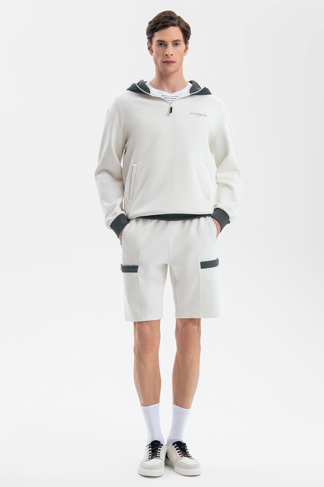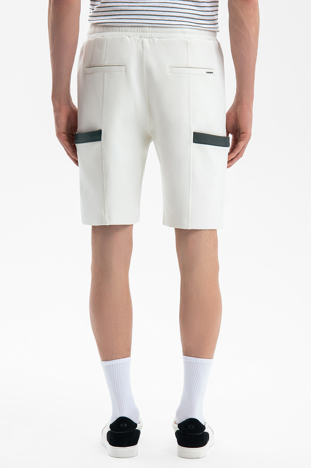 Светло-бежевые шорты KANZLER на кулиске из плотного хлопкового трикотажа — удобная спортивная вещь для отдыха в теплые дни. Акцентами служат контрастные темно-серые планки на бедрах. Вертикальные швы спереди и сзади придают модели структурность. Шнурок на поясе позволяет регулировать объем талии. Модель выполнена из мягкого дышащего гипоаллергенного хлопка (80%), упрочненного полиэстером. Небольшая добавка спандекса служит для поддержания формы и адаптации к индивидуальным особенностям фигуры.