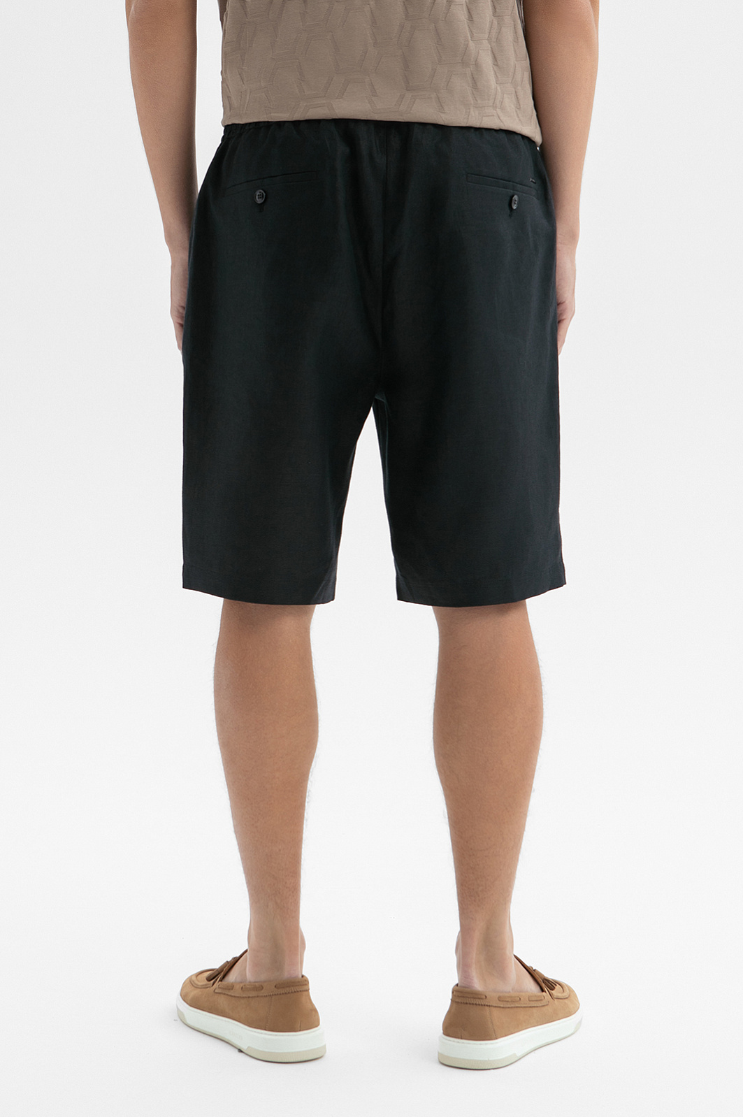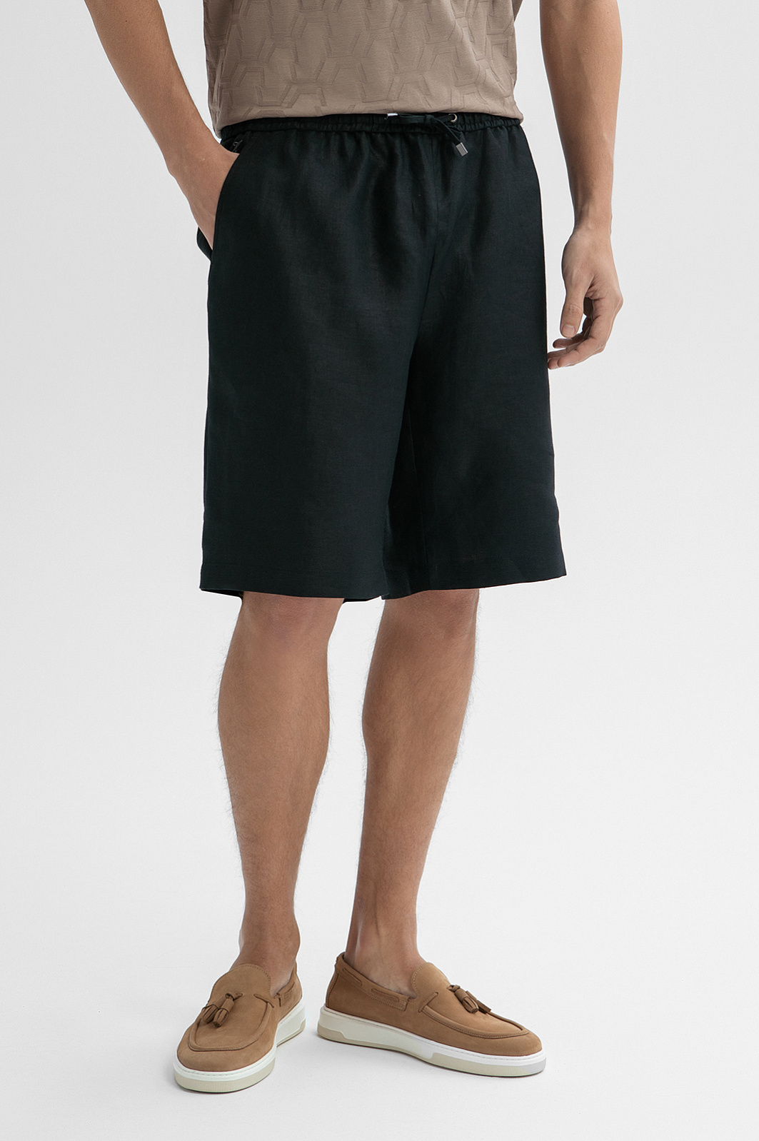 Чёрные шорты KANZLER на кулиске из чистого льна — стильный элемент летнего гардероба, который объединяет сдержанную городскую эстетику и комфорт. Модель гармонично вписывается в повседневный гардероб, сочетаясь как с базовыми футболками, так и с лёгкими рубашками. Свободный силуэт не сковывает движения и создаёт расслабленный образ. Кулиска на поясе позволяет регулировать объём линии талии и обеспечивает удобную посадку. Воздухопроницаемая гипоаллергенная ткань изо льна поддерживает оптимальную температуру и ощущение прохлады даже в жаркие дни.