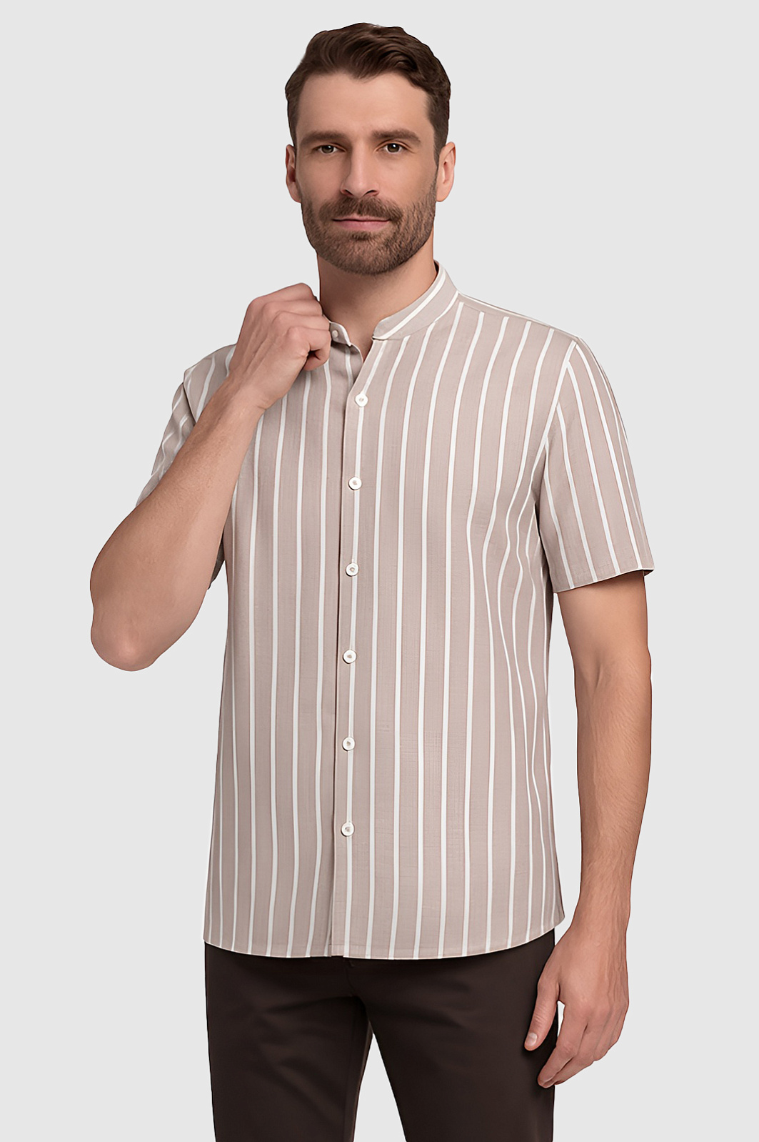 Сорочка из хлопка KANZLER с коротким рукавом настраивает на спокойный непринужденный отдых. Аристократизм и элегантность задают детали: дорогая ткань из чистого хлопка слегка шероховатой фактуры, роскошный оттенок мокко, узор в белую вертикальную полоску и аккуратный воротник-стойка. Натуральная благородная ткань из 100-процентного хлопка защищает кожу от ультрафиолетового излучения и перегрева, сохраняя оптимальную температуру даже в знойный день. Свободное прилегание обеспечивает максимальный комфорт. Спереди — застежка на пуговицы, линия низа слегка скруглена. Параметры модели: рост 189, 102-80-99 Размер на модели: 40