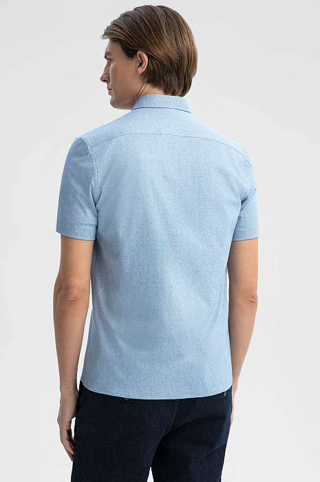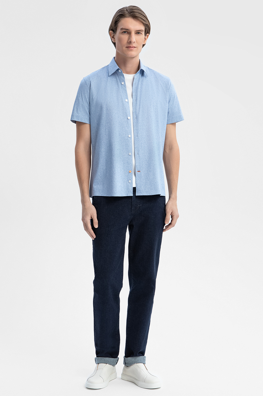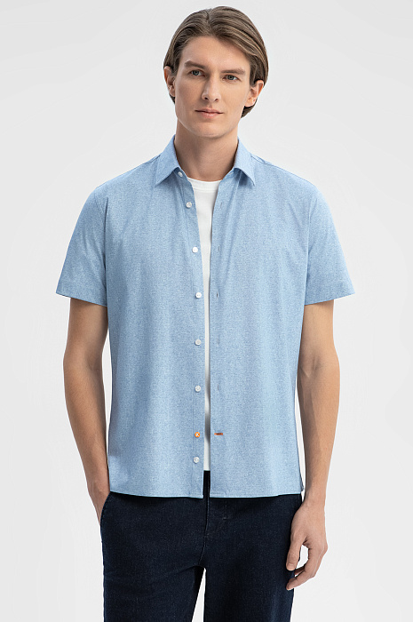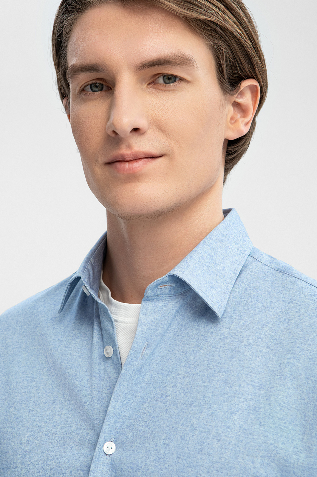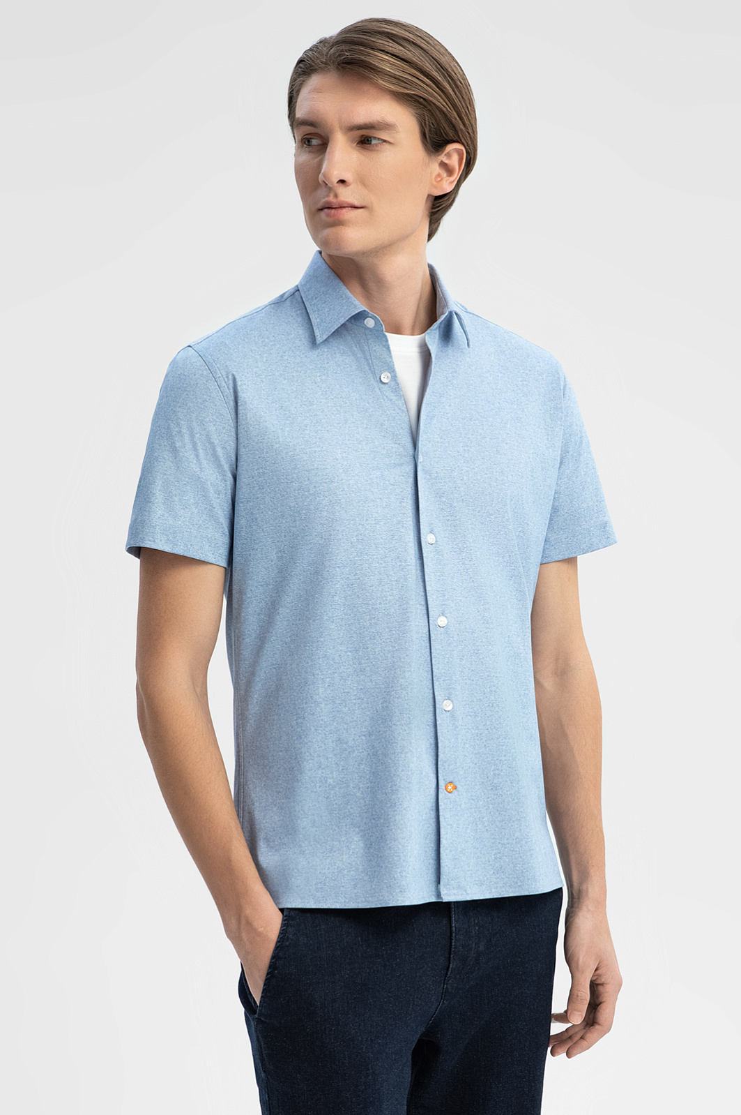 Голубая трикотажная сорочка KANZLER с эффектом меланжа – легкий способ создать стильный и непринужденный образ. Модель изготовлена из хлопкового трикотажа, мягкого, легкого и дышащего. Гипоаллергенный материал бережен к коже и не вызывает раздражений. Зауженный крой мягко подчеркивает линию плеч и торса, сохраняя свободу движений. Переплетение разных оттенков голубого придает образу свежесть и глубину. Для создания кежуал образа сочетайте модель с темными джинсами, белой футболкой и кроссовками, для повседневного офисного стиля – с брюками и лоферами, для спорт кежуал – с бермудами и кедами.