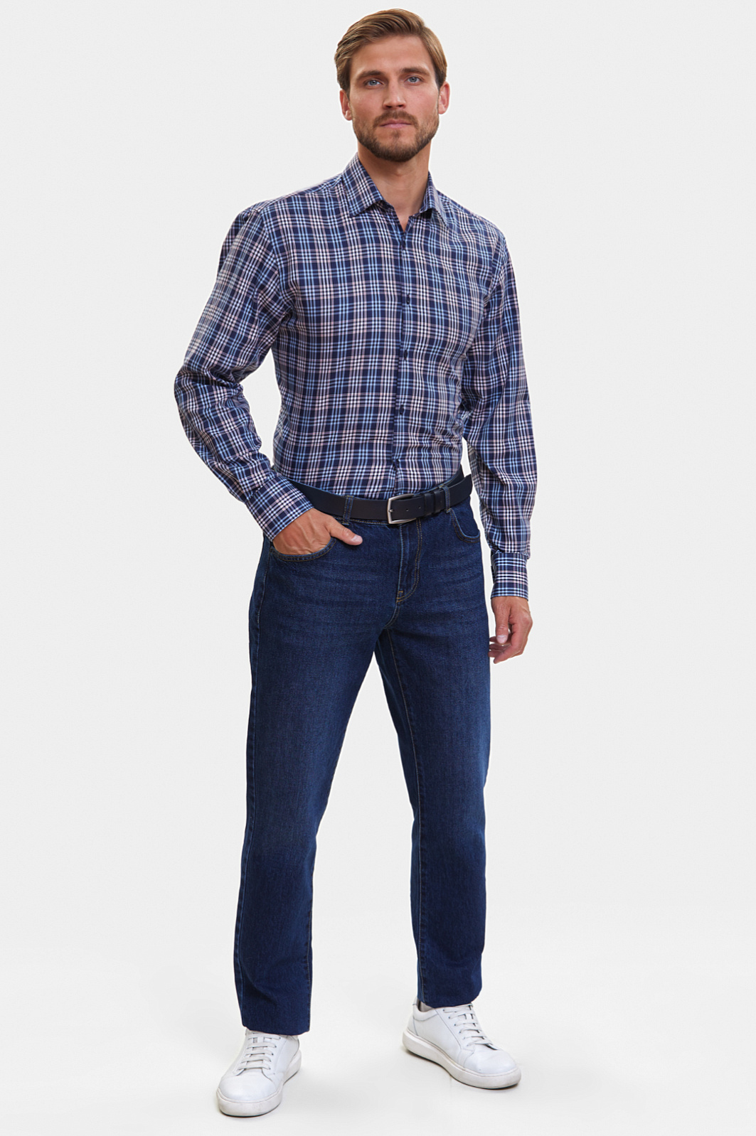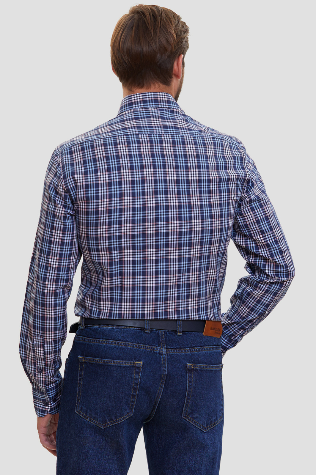 Синяя сорочка KANZLER из хлопка в клетку — базовая вещь для создания образов в стилях кежуал, умный кежуал и спорт. Строгий, чуть приталенный силуэт подчеркивает достоинства спортивной фигуры. Синие, голубые и красные линии образуют стильный клетчатый узор, который великолепно смотрится с классическими джинсами KANZLER. Вместе с кедами или кроссовками образуется гармоничный городской аутфит. Гладкая матовая рубашечная ткань выглядит дорого и благородно. Мягкий, тактильно приятный материал из 100-процентного хлопка прослужит не один сезон. В сорочке не жарко и не холодно — легкая дышащая структура хорошо пропускает воздух, сохраняя комфортную для тела температуру. Параметры модели: рост 187, 100-81-97 Размер на модели: 40