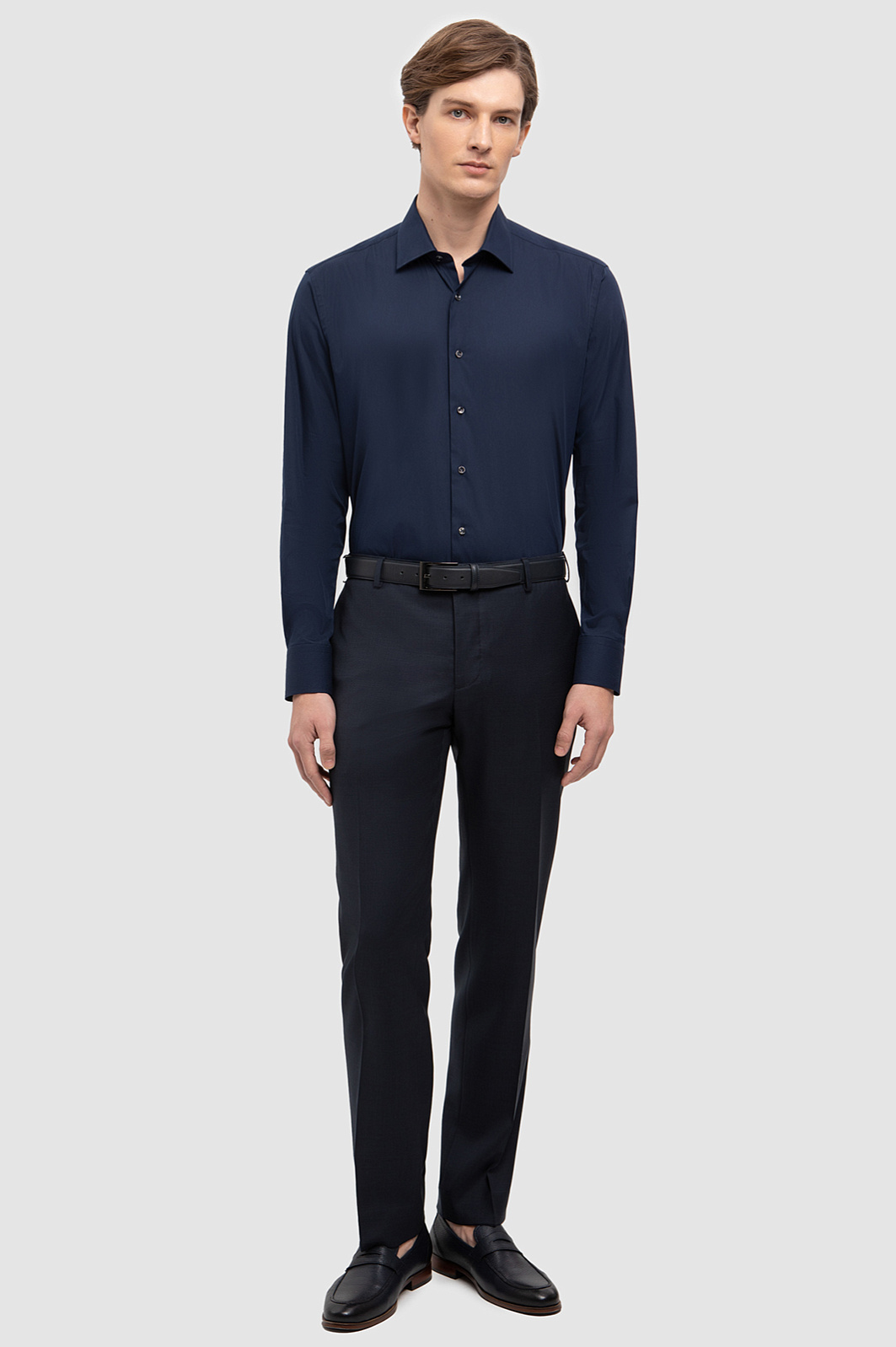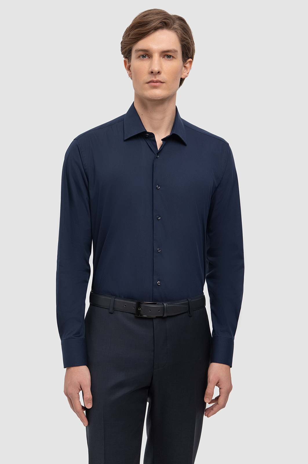 Рубашка KANZLER приталенного кроя в оттенке грозового неба взяла лучшее от классического стиля и современных технологий. Ее натуральный состав из мягкого, дышащего хлопка обеспечивает комфорт и долговечность, классический рубашечный воротник и широкие манжеты придают образу строгость, а насыщенный глубокий цвет подчеркивает мужественность, индивидуальность и добавляет выразительности. Помимо натурального состава и трендового цвета ее отличает уникальная особенность - устойчивость материала к сминанию, что делает ее идеальным выбором для активного и делового мужчины. Посадка выгодно подчеркивает фигуру и подходит для носки под пиджак, позволяя всегда выглядеть безупречно. Предлагаем сочетать изделие с темно-синими брюками и лоферами в тон для создания монохромного образа. Параметры модели: рост 191, 97-77-99 Размер на модели: 40