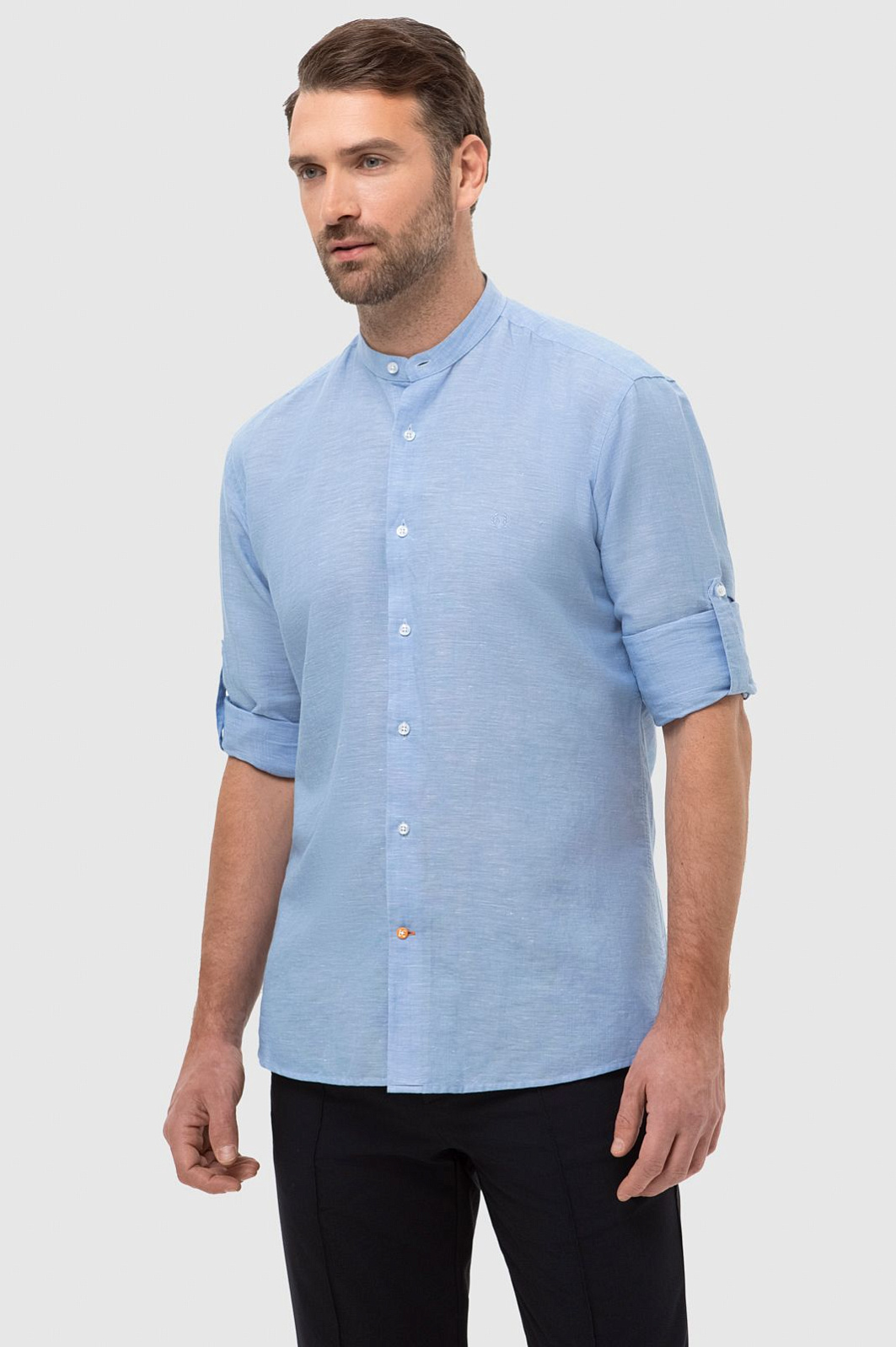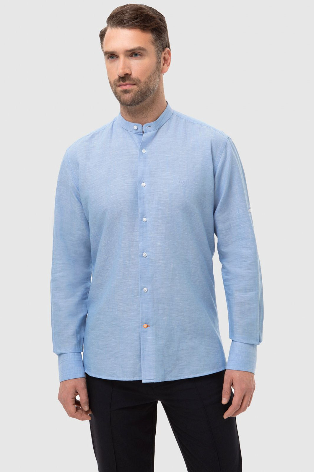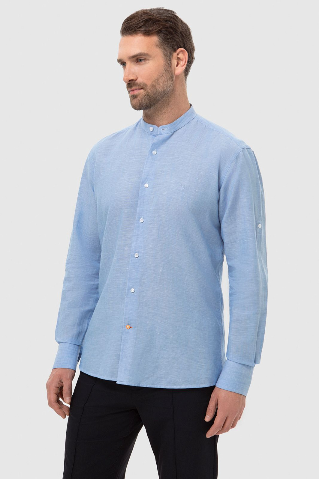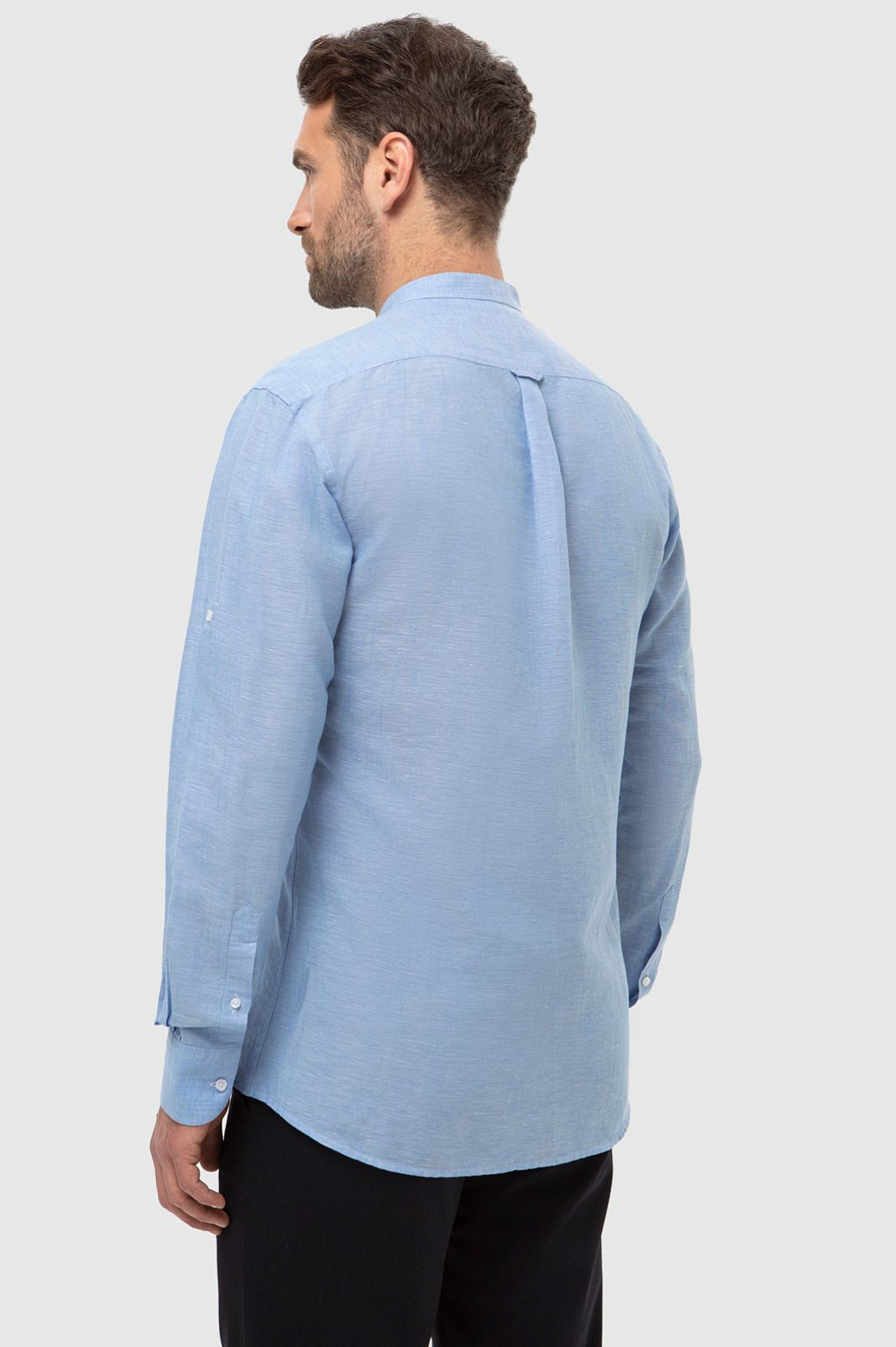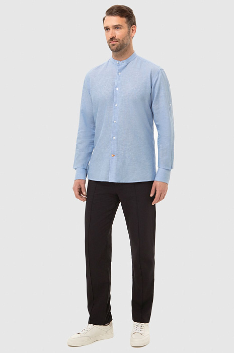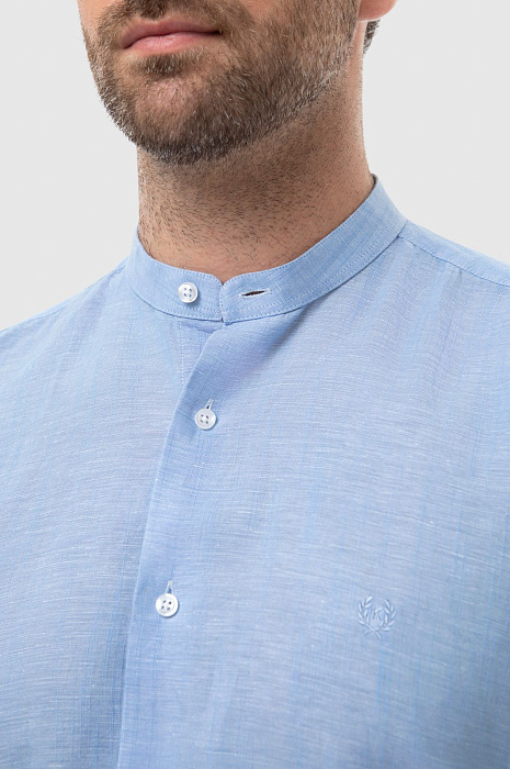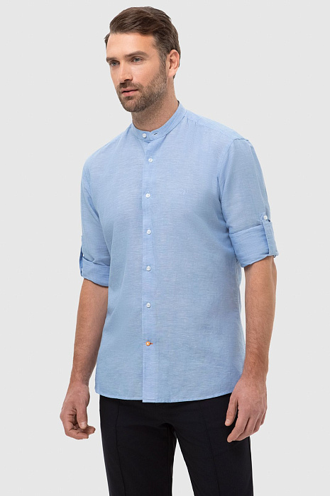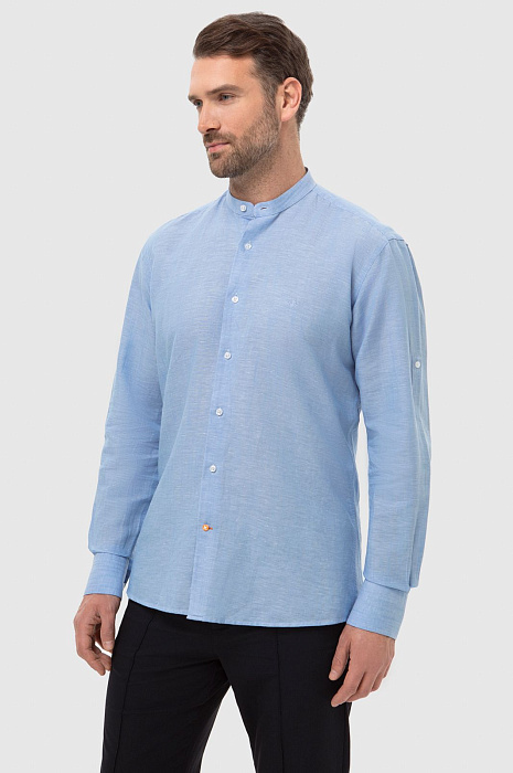 Светло-голубая рубашка KANZLER станет комфортным и стильным решением для весны и теплых летних дней. Пастельный голубой цвет словно переносит нас на лазурный берег. Модель свободного кроя в неаполитанском стиле с воротником "мандарин" и длинными рукавами создана для размеренного вечера на берегу залива или прогулки по городу. Расслабленный стиль чувствуется в дизайне, нежном оттенке и премиальном составе. В ткани переплели мягкий хлопок и нежный лен, чтобы изделие идеально пропускало воздух, поддерживая комфорт даже в зной. Легкая рубашка обладает терморегулирующими и антибактериальными свойствами, поэтому оптимально подходит для мужчин с чувствительной кожей. Модель подарит вам идеальный внешний вид и свежесть на весь день. Наши стилисты предлагают рифмовать изделие с брюками и светлыми кроссовками. Параметры модели: рост 189, 102-80-99 Размер на модели: 40