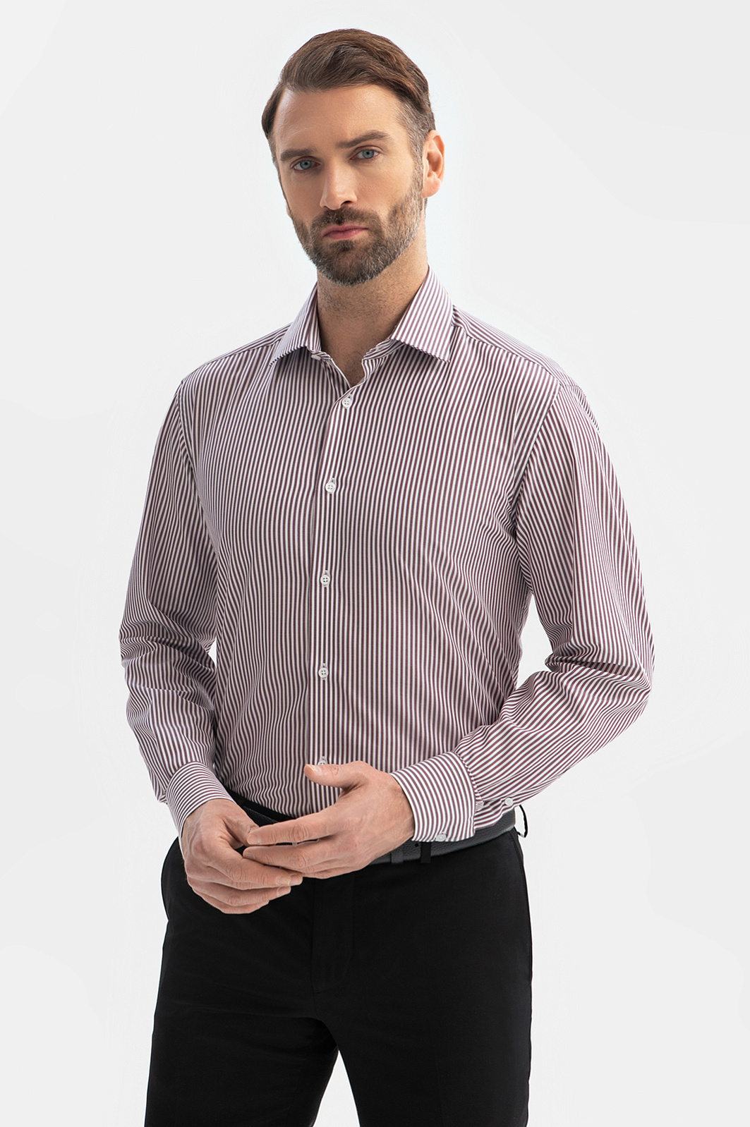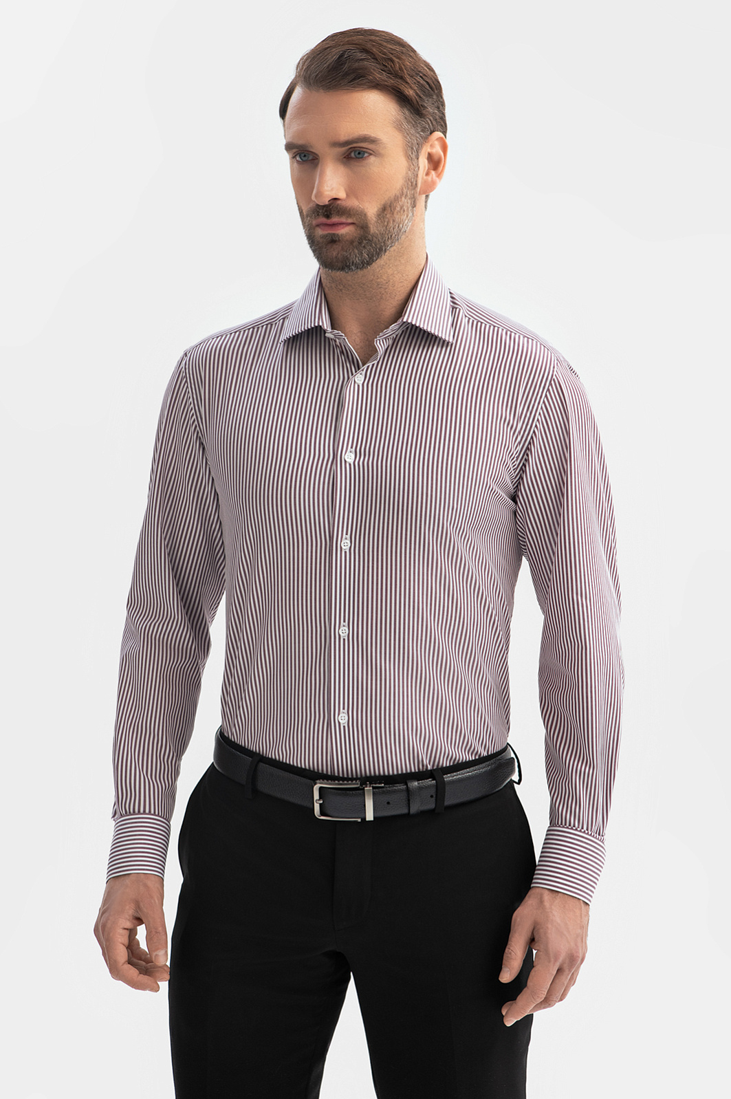 Сорочка KANZLER из чистого хлопка в бордово-коричневую полоску — нескучная классическая модель, которая оживит офисный стиль и добавит образу нотку неформальности. Вытягивание силуэта — полезная опция вертикальных полосок, благодаря которой фигура выглядит стройнее и выше. Прямой свободный Классический крой предоставляет максимальную свободу действий и подходит для любой комплекции тела. Дорогая ткань из 100-процентного хлопка — инвестиция в комфорт и спокойствие. Легкие гипоаллергенные натуральные волокна поддерживают циркуляцию воздуха, берегут естественное тепло и долго сохраняют свежесть. Параметры модели: рост 189, 102-80-99 Размер на модели: 40