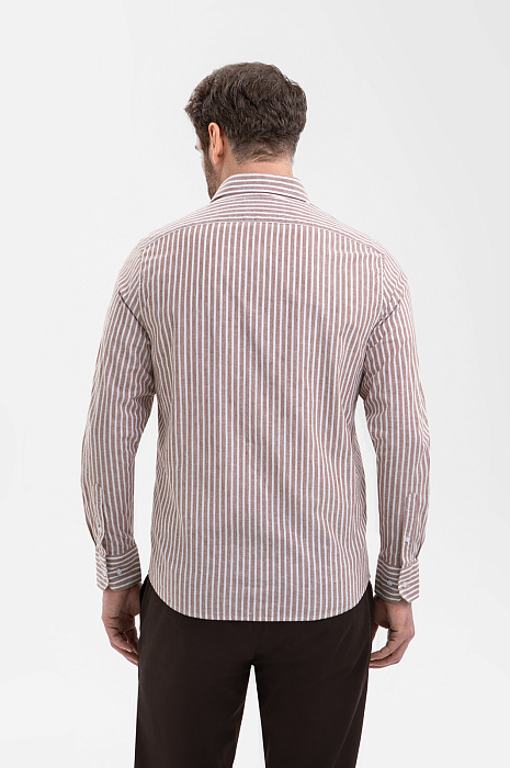 Сорочка KANZLER коричневого оттенка из хлопка и льна — пример современной мужской классики, в котором комфорт и эстетика существуют на равных. Коричневый оттенок выглядит тепло и стильно. Вертикальная белая полоса визуально вытягивает силуэт и добавляет образу графичности. Прямой крой задаёт спокойный уверенный силуэт, не перегружая образ. Роскошная ткань сделана из гипоаллергенных материалов: 70% хлопка и 30% льна. Хлопок отвечает за комфорт и свежесть, а лён придаёт материалу лёгкую фактурность. Натуральная ткань хорошо держит форму и со временем лучше адаптируется к фигуре, приобретая расслабленный и естественный вид.