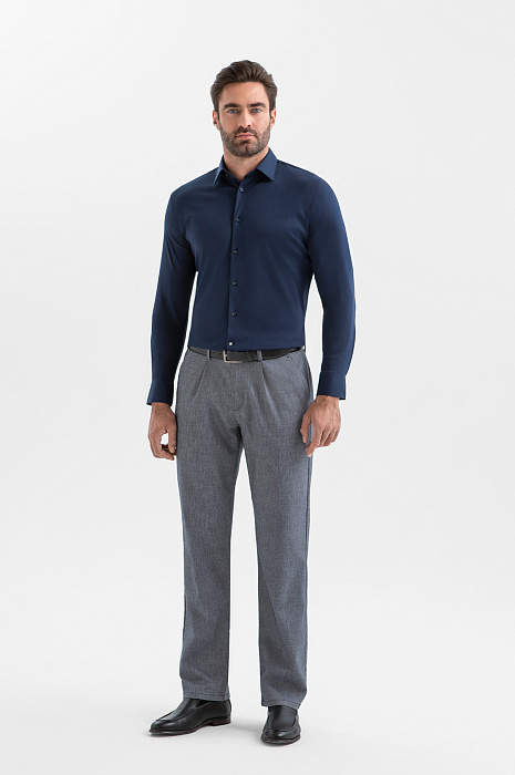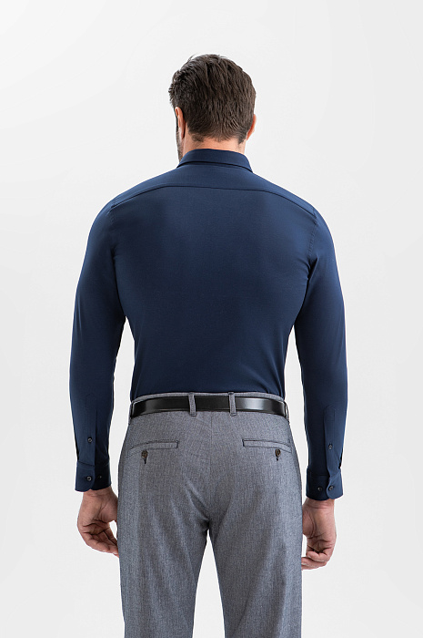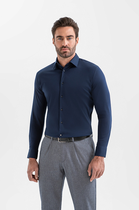 Жизнь в городе протекает интенсивно, и будни часто выдаются активными. Тёмно-синяя сорочка KANZLER из мягкого трикотажа значительно упрощает процесс сборов даже в самые загруженные дни. Она легко комбинируется с большинством вещей в гардеробе. Сложный чернильный оттенок выглядит глубоко и не слишком строго. Крой красиво обрисовывает контуры фигуры. Трикотаж из чистого хлопка естественно подстраивается под движения, сохраняя безупречный вид в течение дня. Мягкие натуральные волокна хорошо отводят влагу и обеспечивают циркуляцию воздуха.