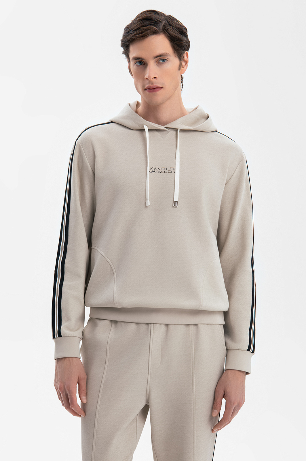 Свободная бежевая толстовка KANZLER – идеальный спутник для городских приключений, прогулок на природе и тренировок. Универсальная модель создана из прочного фактурного материала. Натуральный хлопок в составе гарантирует мягкость и дышащие свойства, полиэстер позволяет изделию сохранять форму после многократных стирок и бережет от износа, а небольшое добавление эластана обеспечивает идеальную посадку и свободу движения. Капюшон на кулиске и резинка на манжетах и по низу изделия защищают от ветра. Боковые карманы удобны для мелочей и согревают руки в прохладную погоду. Лампасы на рукавах добавляют образу спортивную динамику и визуально удлиняют силуэт. Бежевый оттенок, нейтральный и утонченный, – универсальная база для любого образа – от спортивного до кежуал шик. Параметры модели: рост 189, 91-78-95 Размер на модели: М