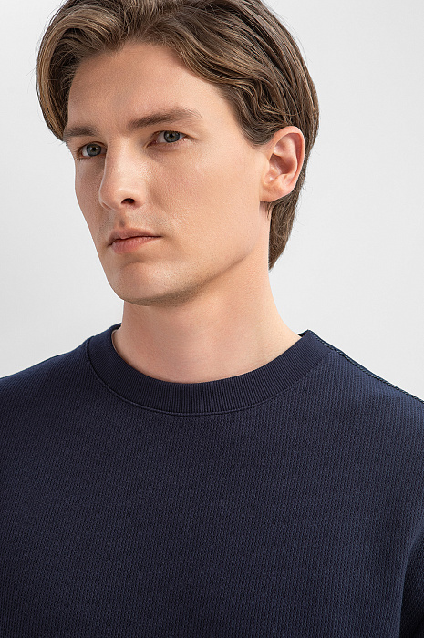 Толстовка KANZLER глубокого синего цвета из лимитированной коллекции — это интерпретация привычной спортивной классики и современного городского стиля, которая создана для тех, кто ценит оригинальный лаконичный дизайн без лишней вычурности. Спереди модель выглядит как традиционная универсальная толстовка: аккуратный круглый вырез горловины и лаконичный крой без лишних акцентов. Спинка с кокеткой и притачным поясом с декоративными патами на пуговицах отсылают к силуэту джинсовой куртки. Такое сочетание создаёт выразительный контраст и подчёркивает уникальность вещи. Толстовка сшита из разных по фактуре и составу смесовых тканей. Перед — плотный эластичный трикотаж, спинка — прочный гладкий материал. Параметры модели: рост 191, 97-77-99 Размер на модели: M