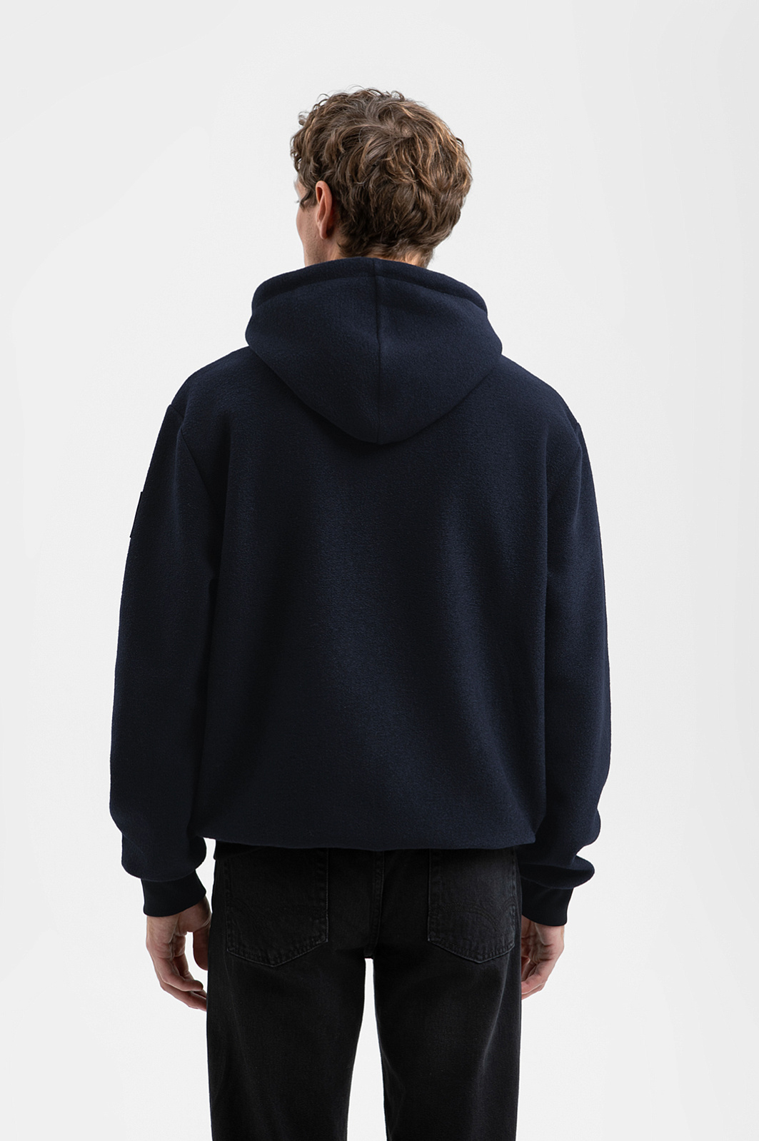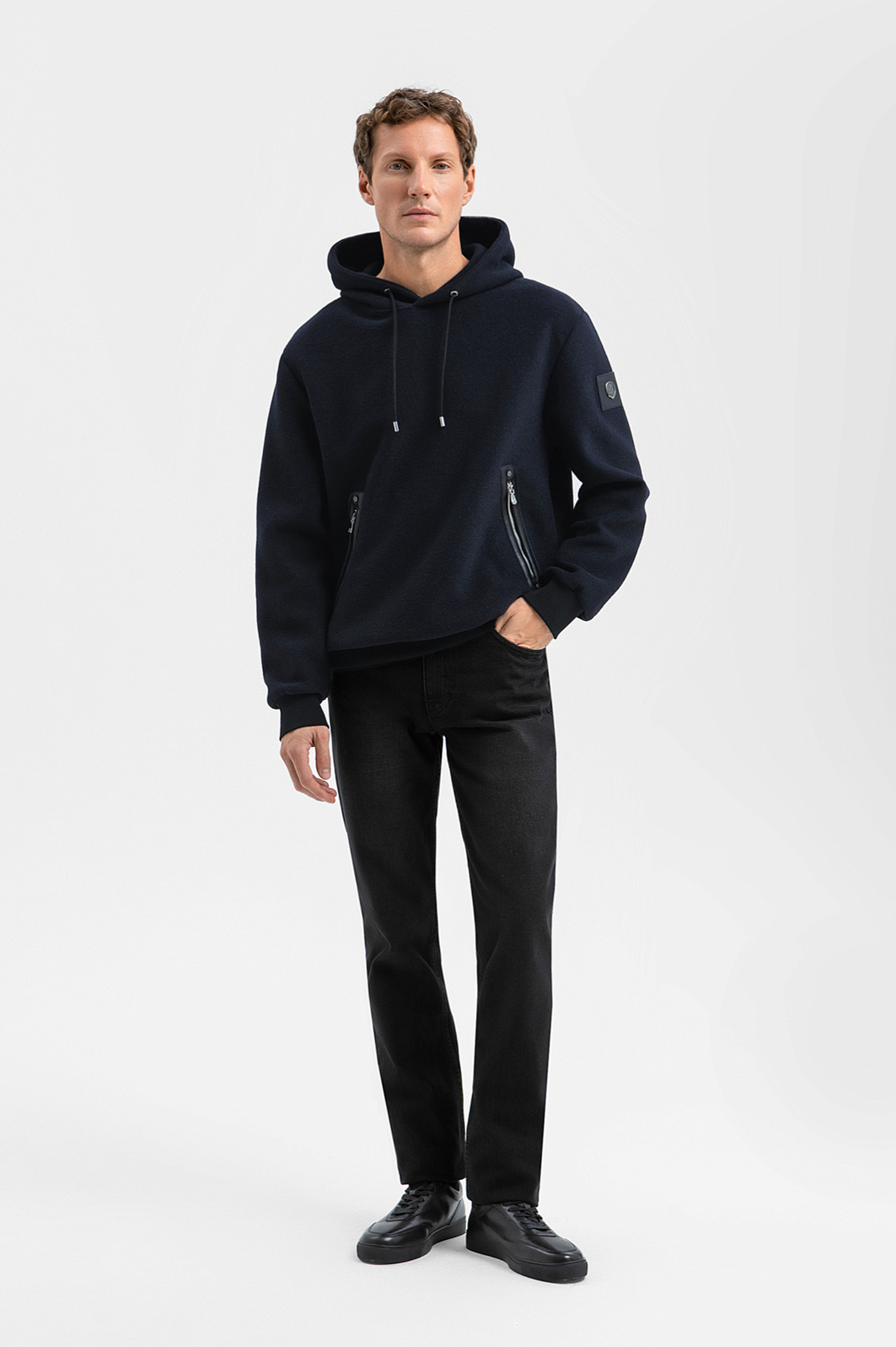 Толстовка KANZLER из смесовой шерсти глубокого тёмно-синего оттенка можно сочетать с джинсами для повседневного образа или надевать поверх строгих брюк как альтернативу классической верхней одежде. Плотный верхний слой с мягкой подкладкой из чистого хлопка обеспечивает комфорт и надёжную защиту в прохладное время. Свободный крой оверсайз придаёт силуэту современную расслабленность. Капюшон регулируется шнурком и позволяет адаптировать толстовку к погоде и настроению. Детали решены с особым вниманием: карманы на молнии дополнены накладными планками с фирменными заклёпками, что придаёт спортивной вещи лёгкий налёт брутальности. Смесовая ткань из шерсти, акрила и полиэстера отличается мягкостью, теплом и износостойкостью, а хлопковая подкладка обеспечивает комфорт и воздухопроницаемость. Параметры модели: рост 188, 97-82-92 Размер на модели: S-M