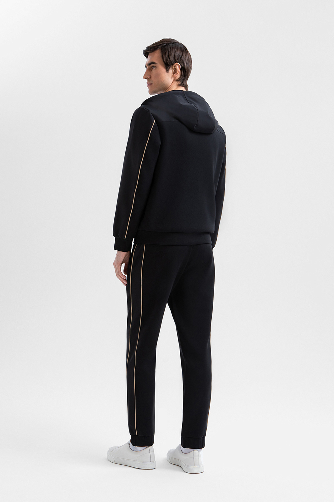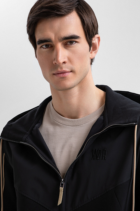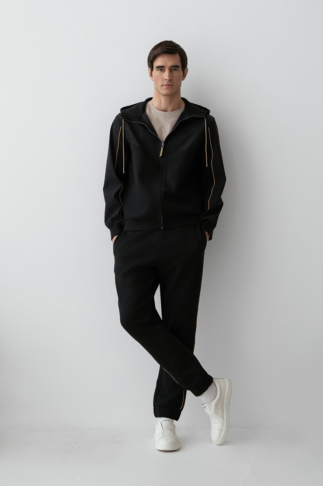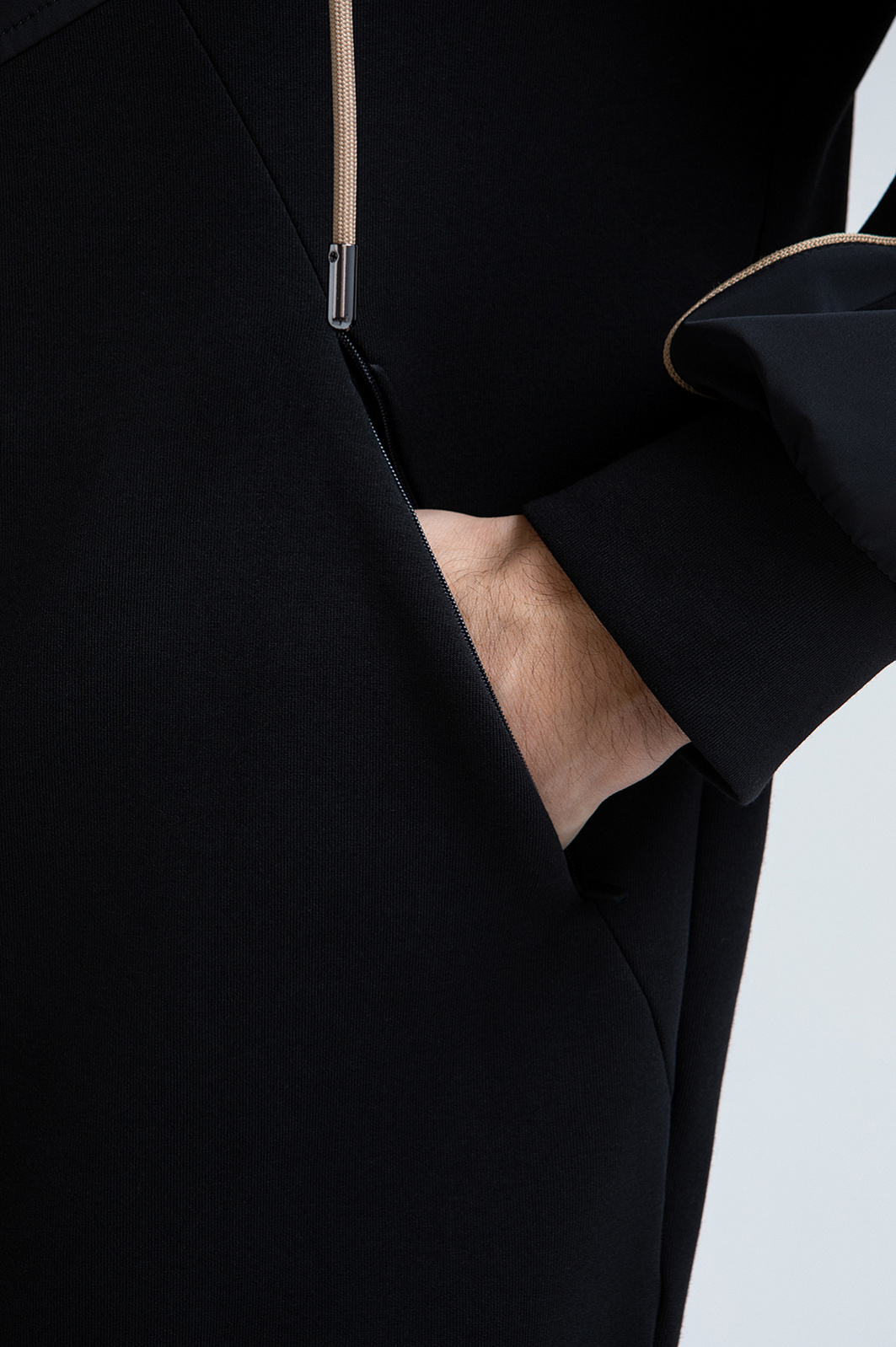 Чёрная толстовка KANZLER предназначена для спортивных занятий и непринуждённого отдыха. Для создания цельного костюма её можно дополнить брюками KANZLER из такой же ткани. Мягкий трикотаж гармонично дополнен деталями из полиэстера, которые придают вещи структурированность и подчёркивают чистые линии кроя. Контрастные бежевые элементы служат деликатными акцентами. Удобная молния с двумя бегунками позволяет открывать застёжку с любой стороны. Толстовка сшита из смесового хлопка. Натуральные гипоаллергенные волокна поддерживают ощущение свежести и сохраняют естественное тепло. Добавление полиэстера и эластана придаёт материалу прочность и пластичность.