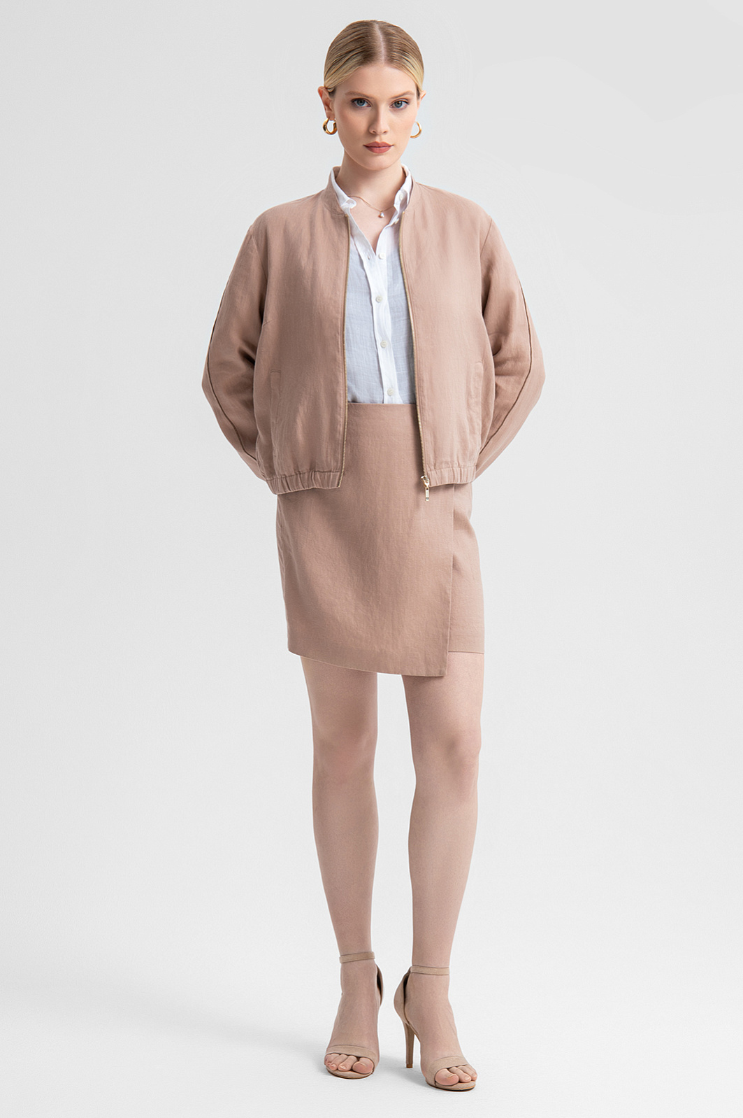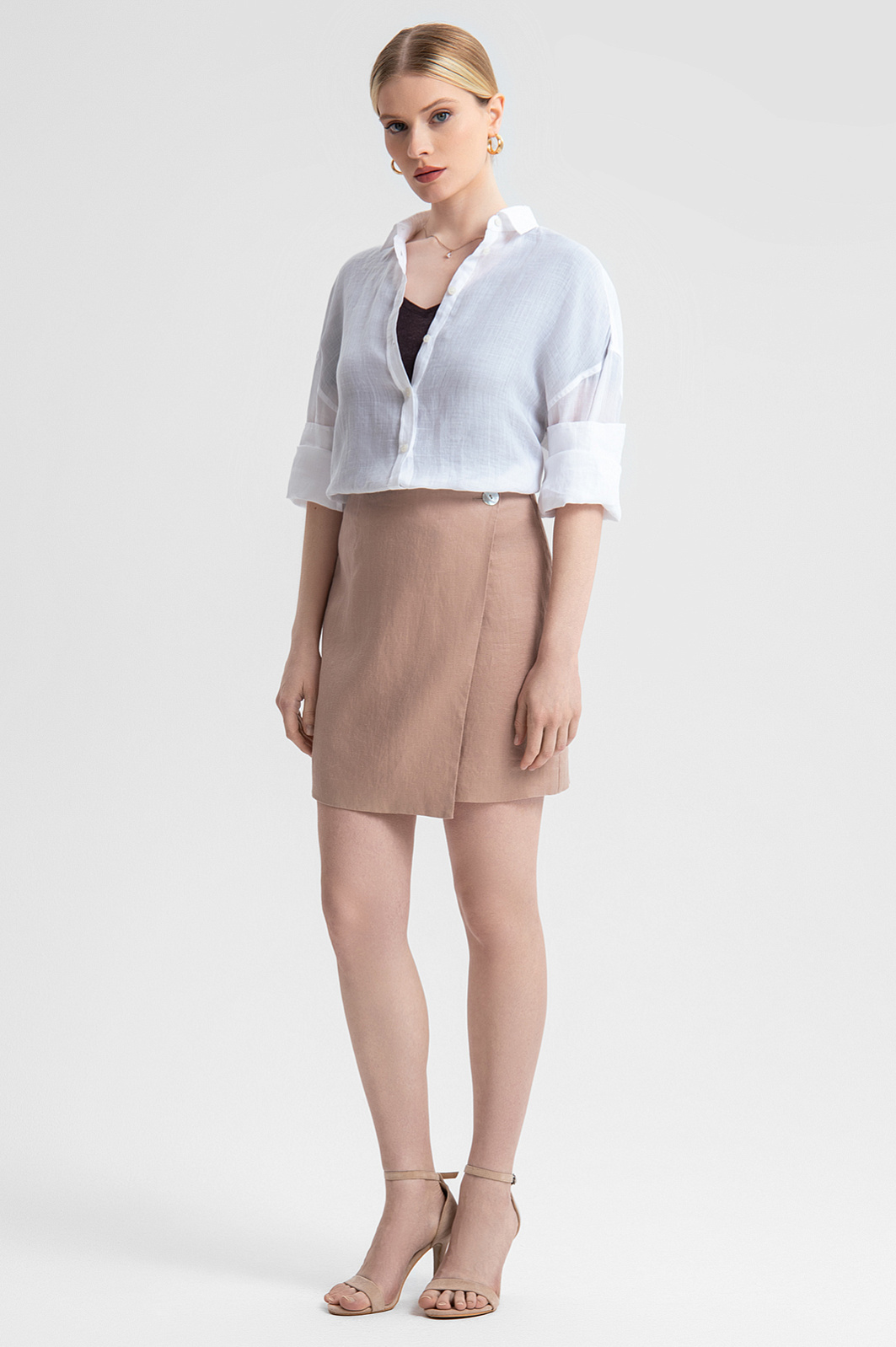 Юбка из 100% льна в пудровом цвете – воплощение нежности и утонченности. Натуральный лен – благородный материал, легкий, мягкий и прочный. Ткань отлично пропускает воздух и отводит влагу, что делает юбку отличным выбором для жарких летних дней. Нежный пудровый оттенок придает образу изысканность, дополняя сочетания как с классическими рубашками, так и с расслабленными топами. Имитация запаха с пуговицей из перламутра и длина мини привносят нотку игривости и динамичности. Для создания стильного образа модель можно дополнить бомбером из такого же материала из коллекции KANZLER . Параметры модели: рост 175, 88-65-92 Размер на модели: S